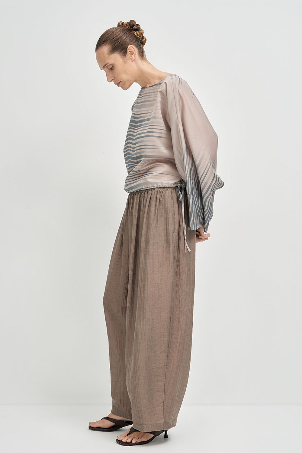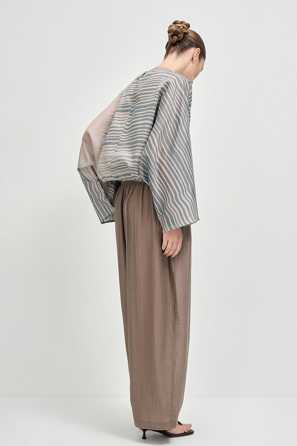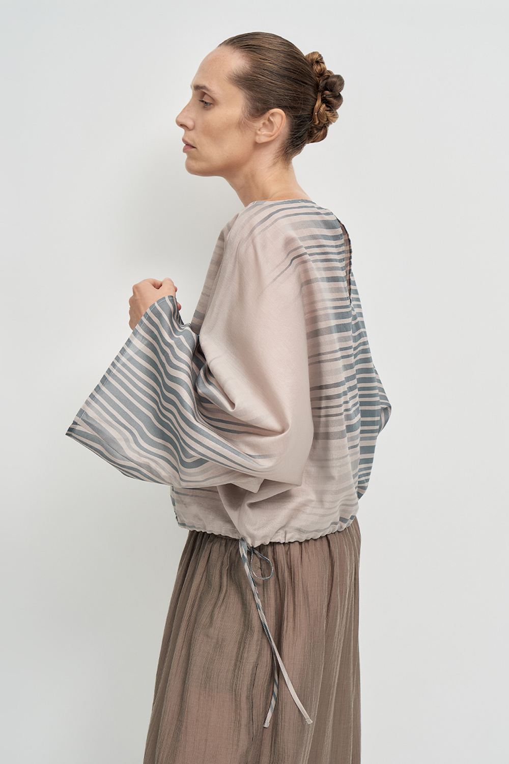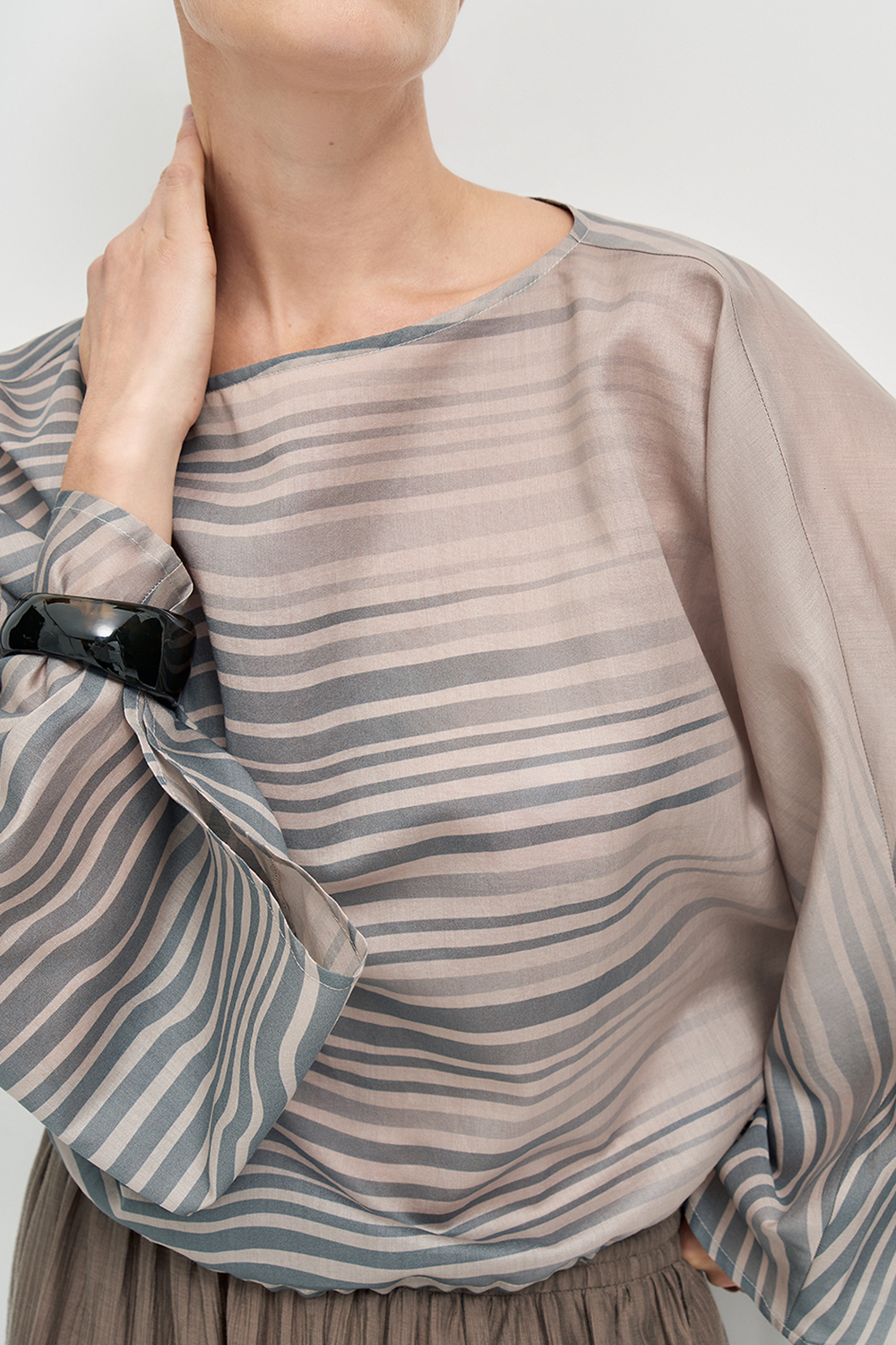 Полупрозрачная блуза в оттенке ‘лазурный восход’ из легкого шелкового полотна с добавлением хлопка. Свободная укороченная форма с широким кимоно-рукавом и горловиной ‘лодочка‘. Авторский принт с асимметричными горизонтальными линиями - выразительный акцент этой модели. По низу блузы - кулиска, позволяющая мягко трансформировать силуэт, дополненная длинными асимметричными завязками сбоку. Застежка на пуговицу по спинке.