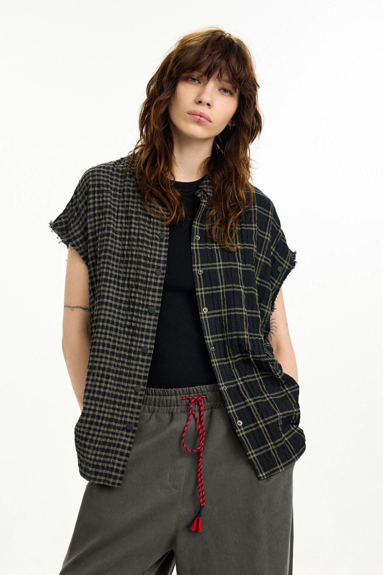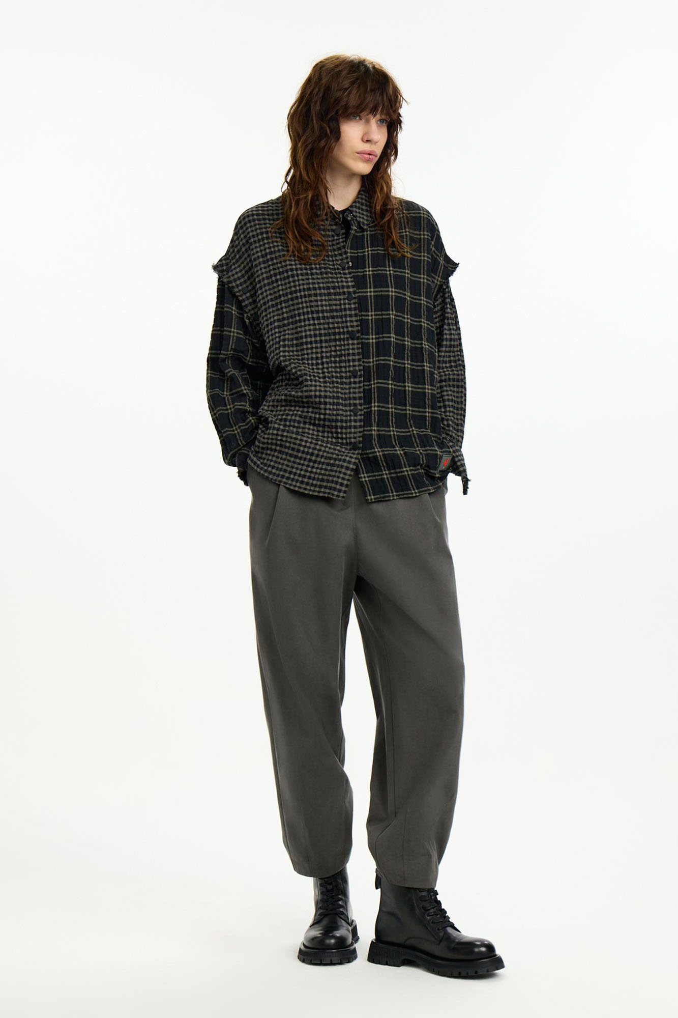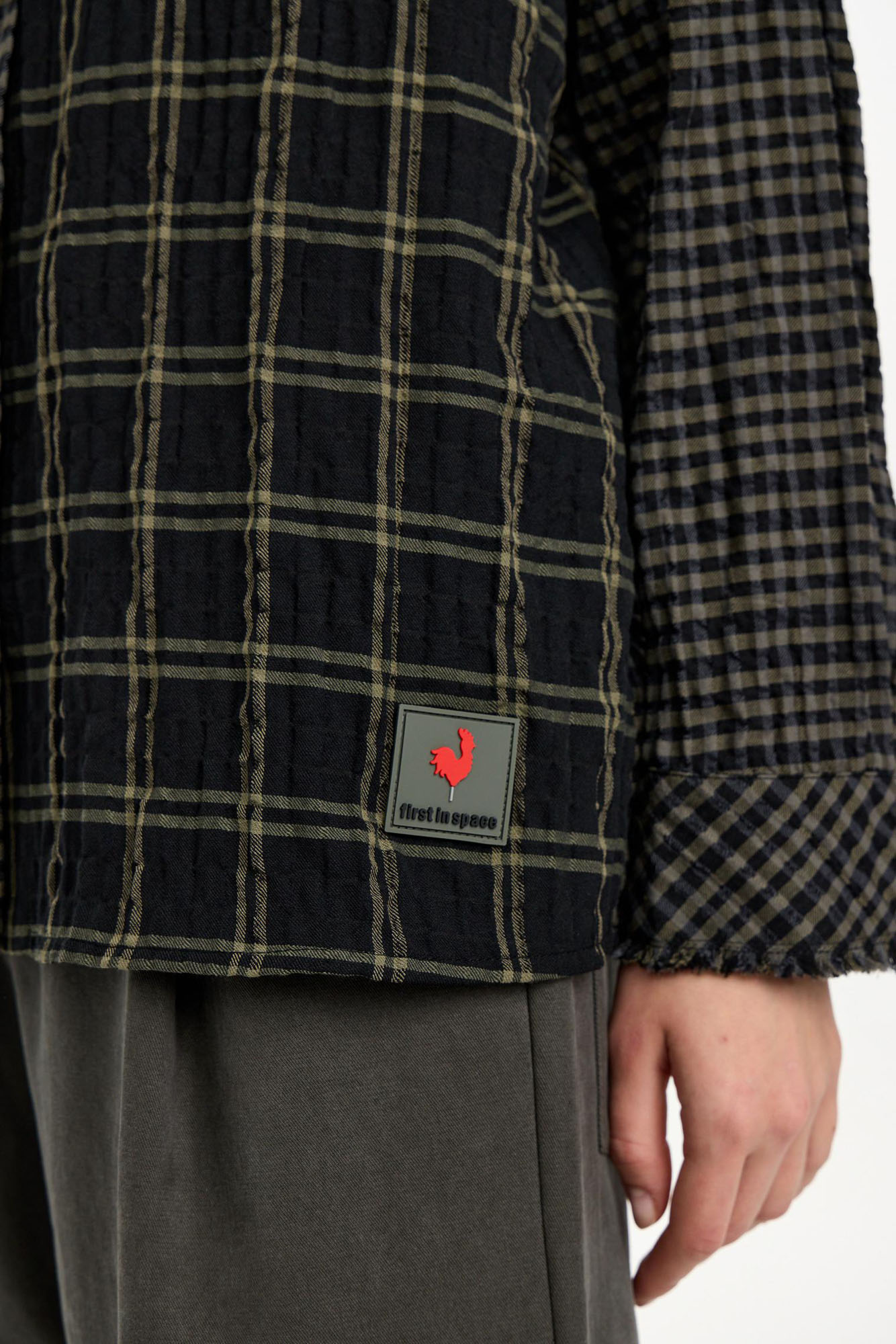 Рубашка-трансформер с отстегивающимися рукавами - новинка для First in Space. Модель из мягкого, комфортного хлопка в разномастную фактурную клетку отсылает к гранжевой эстетике. Эффект помятости, необработанные швы и застежка на кнопках завершают дизайн изделия.