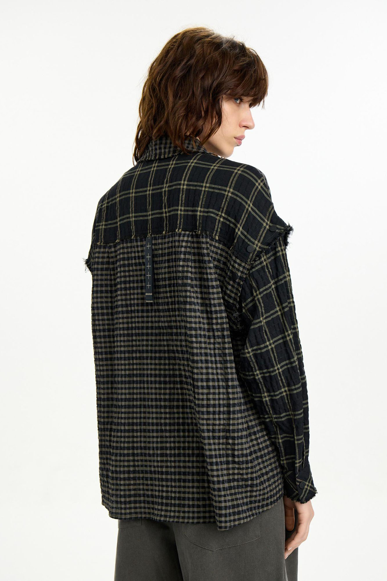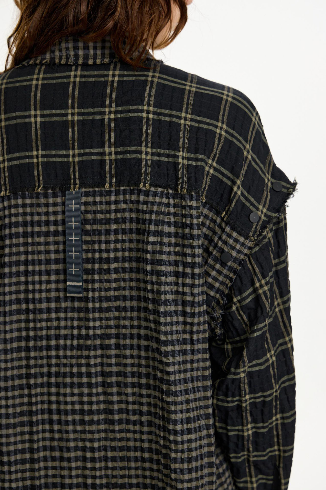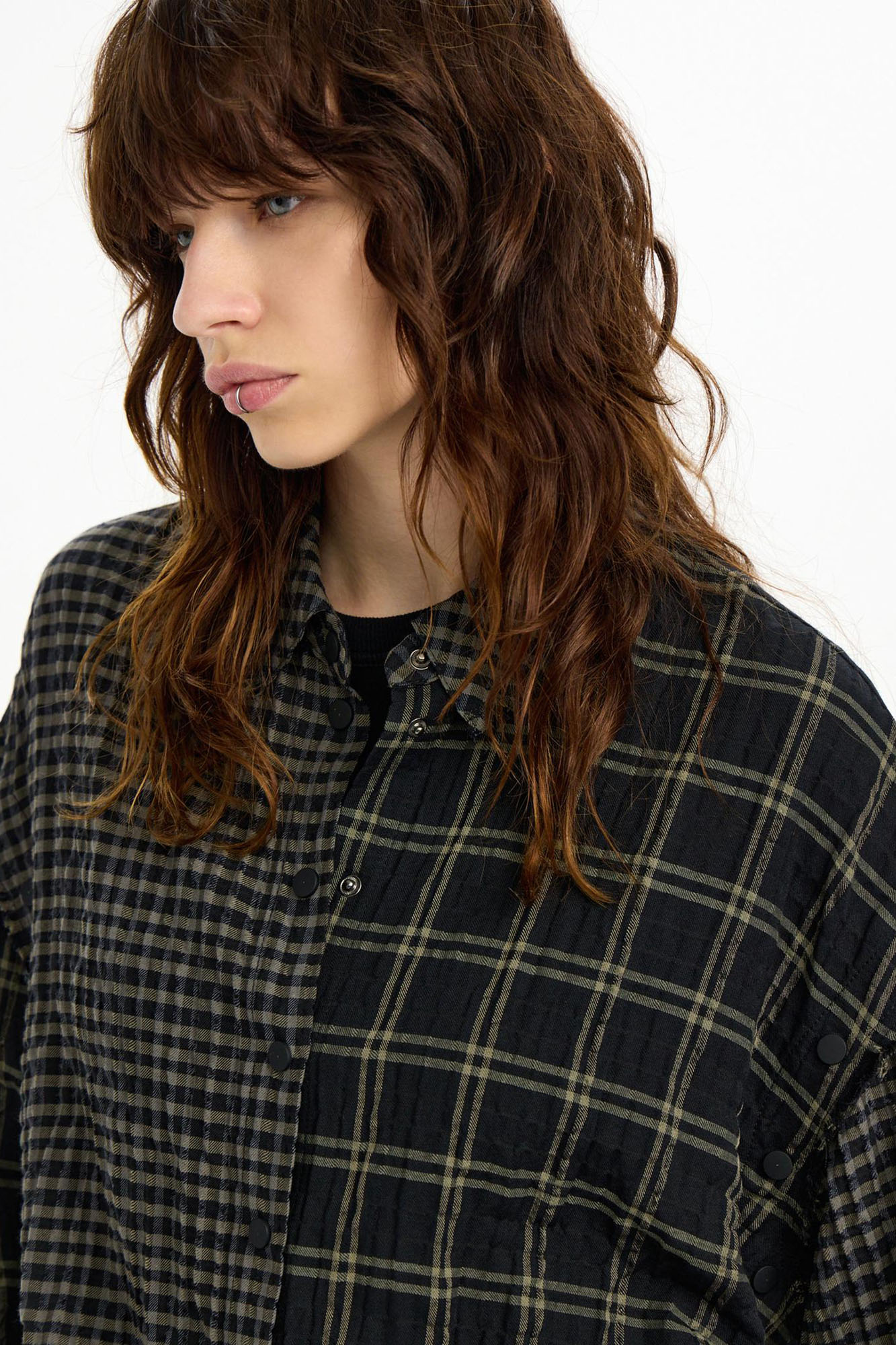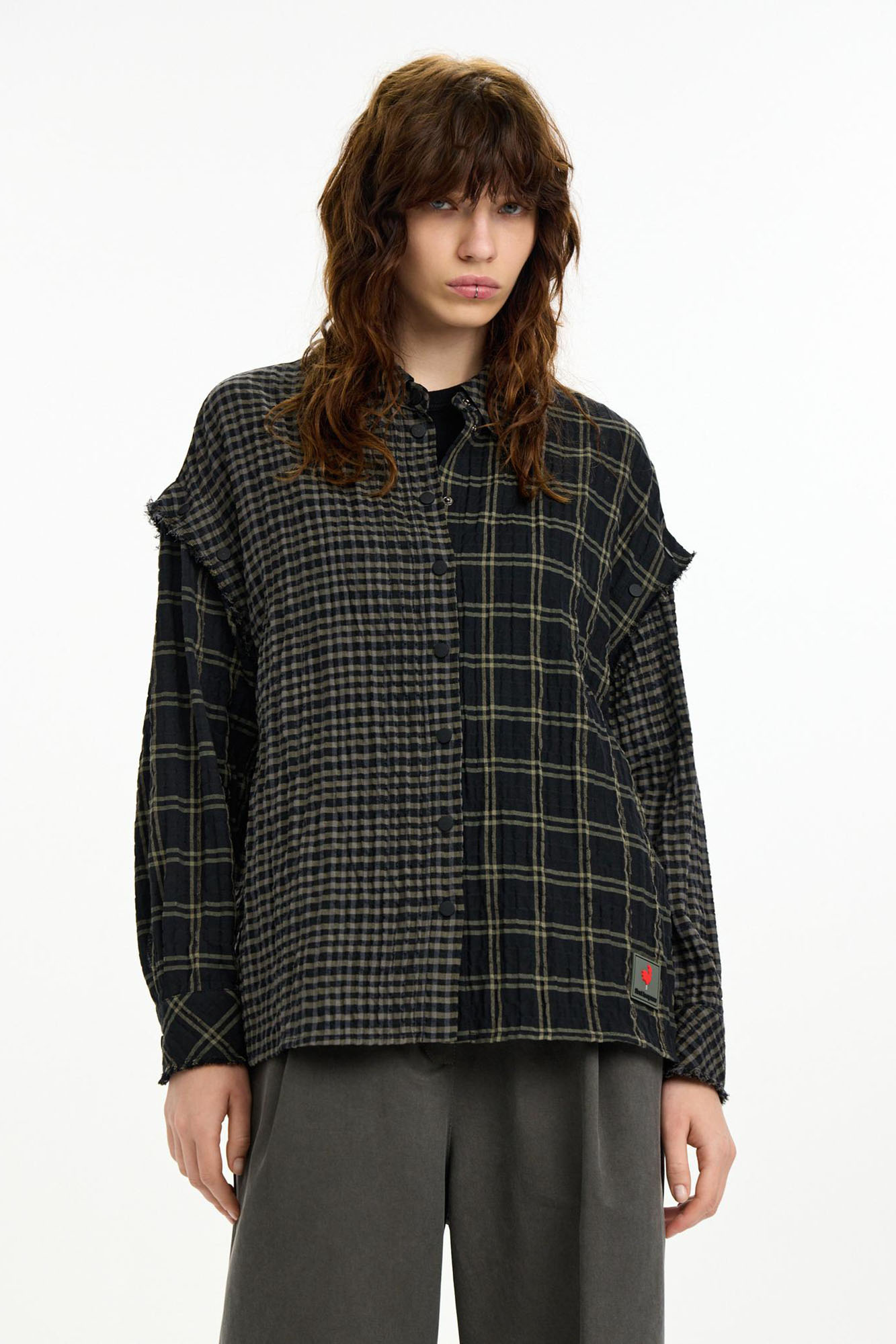 Рубашка-трансформер с отстегивающимися рукавами - новинка для First in Space. Модель из мягкого, комфортного хлопка в разномастную фактурную клетку отсылает к гранжевой эстетике. Эффект помятости, необработанные швы и застежка на кнопках завершают дизайн изделия.