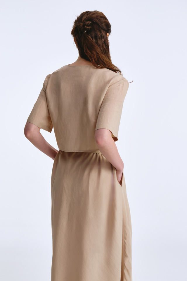 Cтильный укороченный жакет с коротким рукавом, длиной до талии, который привлекает внимание своим лаконичным дизайном и утончёнными деталями. Модель может быть стилизована как блуза. Наши дизайнеры придали крою блузы нотку загадочности и шарма. Широкие завязки служат гармоничным завершением образа, выполняя функцию пояса. Их можно завязать оригинальным узлом спереди или сзади, а можно оставить свободно ниспадать, акцентируя внимание на деталях. При фиксации завязок образуется запах и очень женственный V-образный вырез. Блуза выполнена из смеси льна и вискозы, что придаёт материалу лучшие свойства обоих волокон.