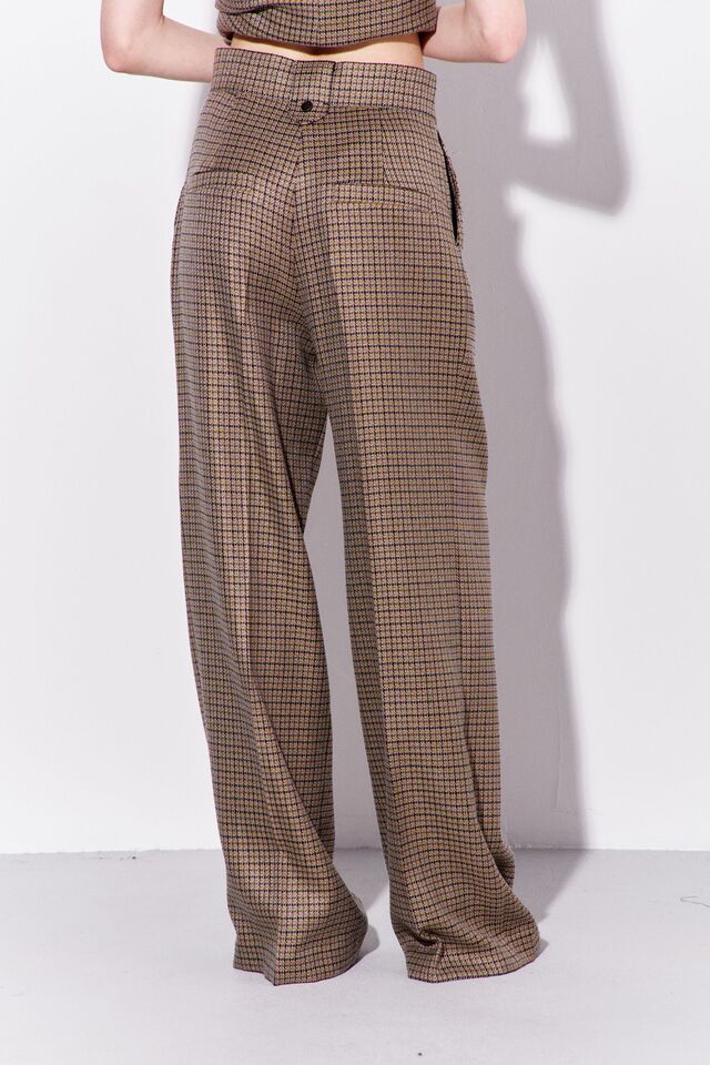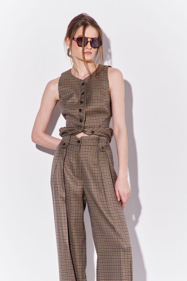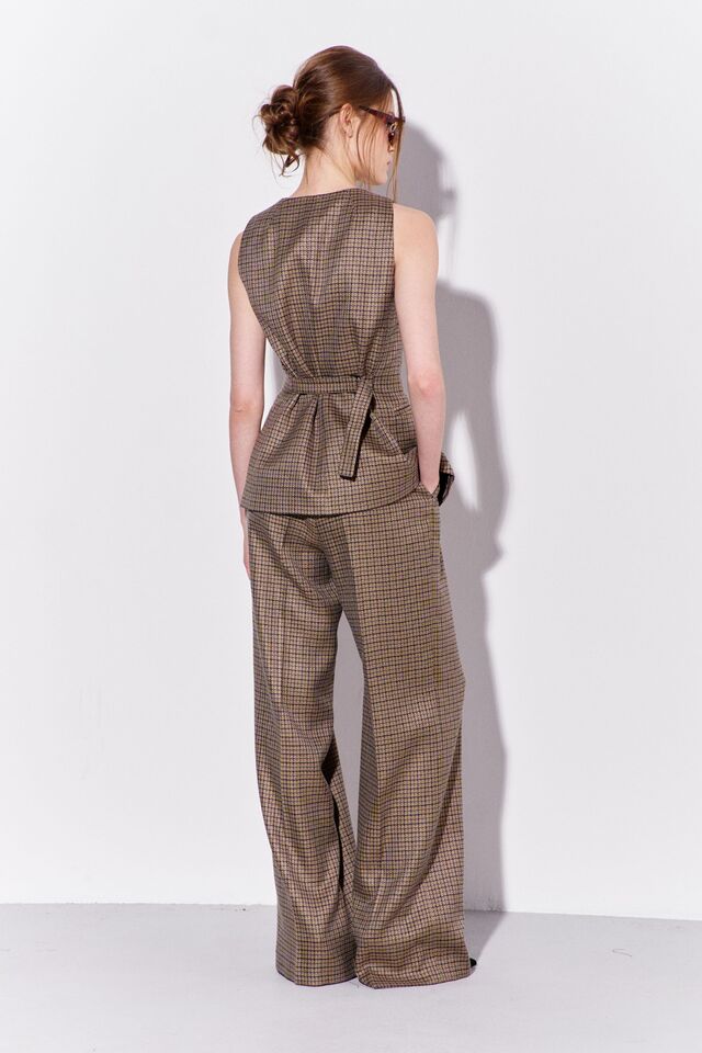 Брюки женские из костюмной ткани, прямые, на поясе. Застежка брюк на молнию, петлю и пуговицу по концам пояса, пояс с тремя широкими шлевками. Передние части брюк с боковыми карманами, обработанными в швах отрезных бочков, бантовой складкой. Задние части брюк с талиевыми вытачками, прорезными карманами с листочкой с втачными концами. Пояс и шлевки – фигурной формы.