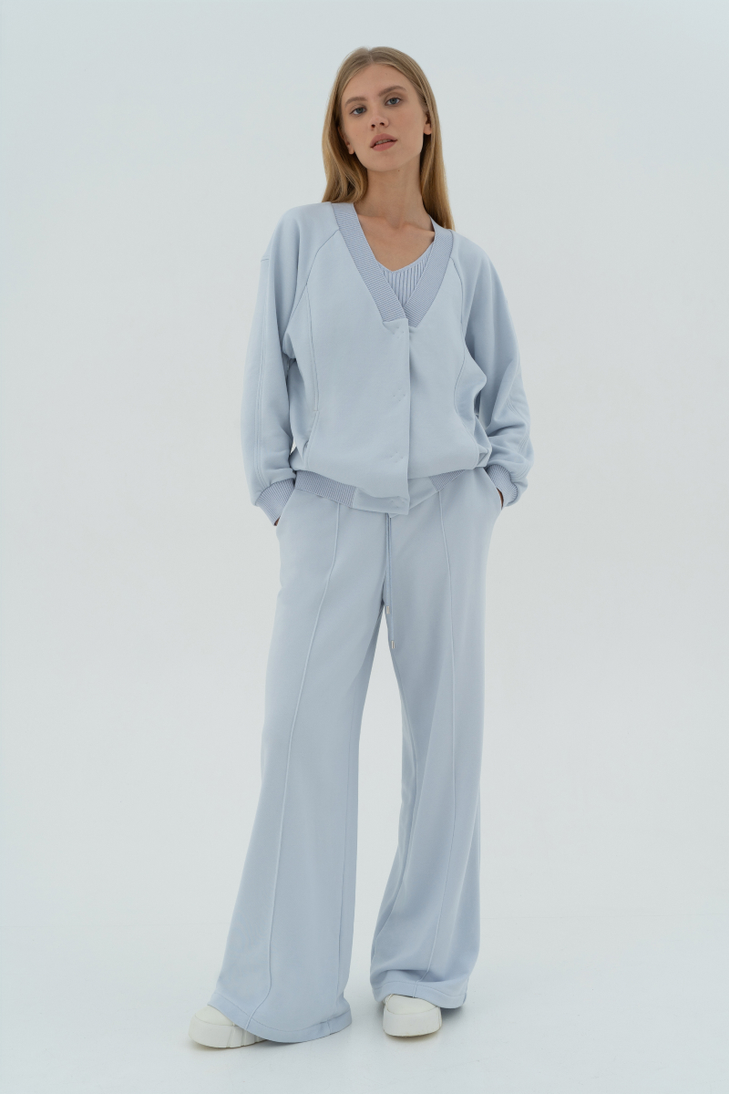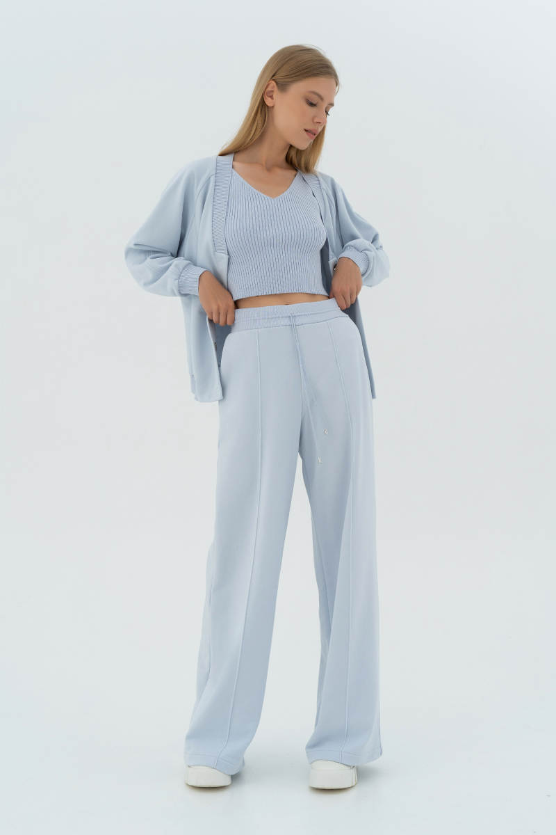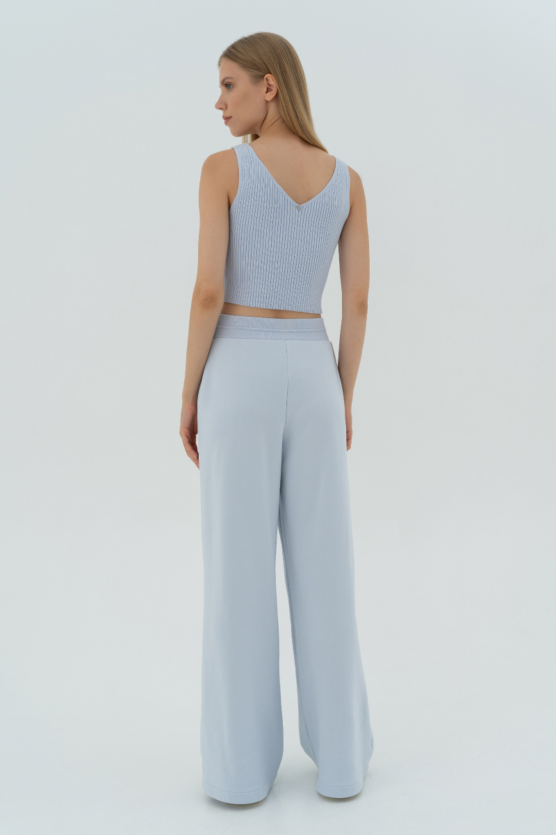 Трикотажные брюки из 100% хлопка в нежном незабудковом оттенке станут прекрасной базой летнего гардероба. Оттенок брюк придаст образу свежесть и жизнерадостность. Комфортный крой и удобный пояс обеспечивают идеальную посадку на талии. Прорезные карманы, расположенные в боковых швах, придают брюкам дополнительную функциональность. Стильный дизайн и удобная посадка позволяют создавать различные образы от классики до casual.