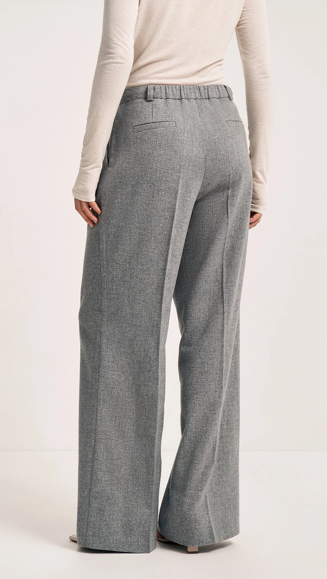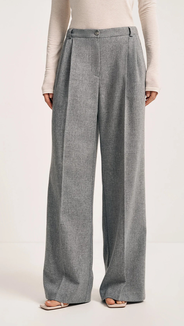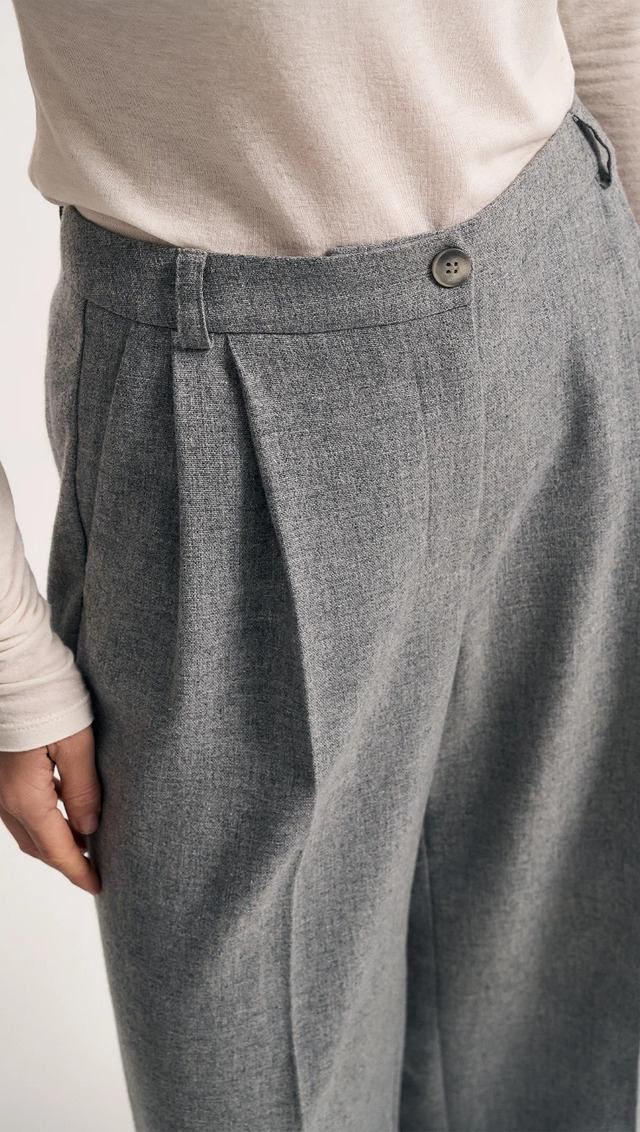 Брюки из шерсти, прямого свободного силуэта, полной длины. Пояс притачной, частично собран на резинку. По переду расположены складки, переходящие в стрелки.