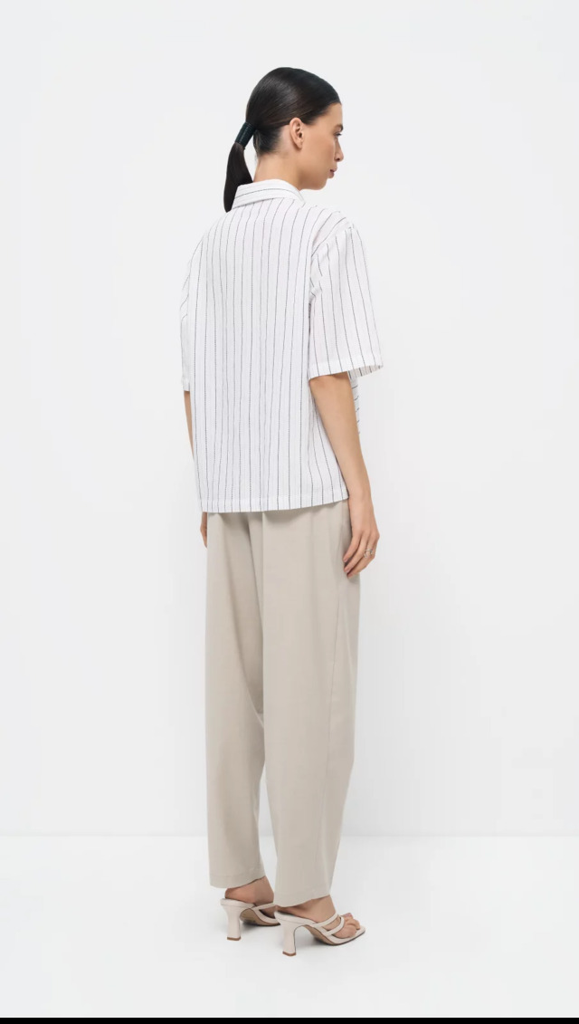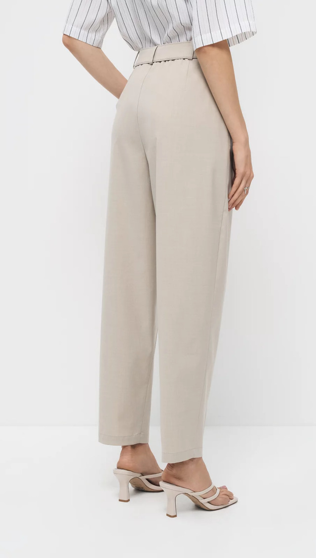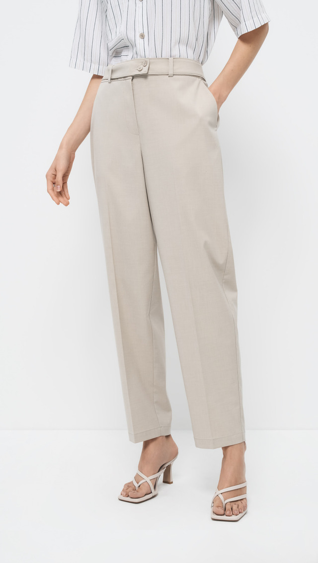 Брюки О-образного силуэта длиной 9/10 выполнены из летней вискозы со спандексом, обеспечивающим абсолютный комфорт за счет высокой эластичности. Цвет «белый сандал» придает изделию свежесть и легкость. Притачной пояс с эластичной тесьмой по спинке надежно фиксирует изделие на талии, обеспечивая удобную посадку. Застежка в переднем шве на тесьму-молнию обеспечивает удобный доступ, а в поясе расположена застежка на крючки. Дополнительный съемный пояс со смещенной линией застежки добавляет изделию оригинальности, пуговицы на нем расположены в динамичном порядке, придавая брюкам уникальный стильный вид. По переду и спинке брюк заутюжены стрелки, которые подчеркивают элегантность и структурированность модели, делая ее подходящей как для повседневных, так и для более официальных образов. На передних половинках брюк находятся боковые карманы с наклонным входом, что повышает функциональность и удобство использования.