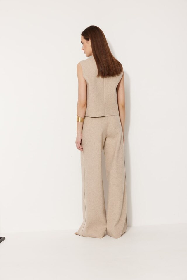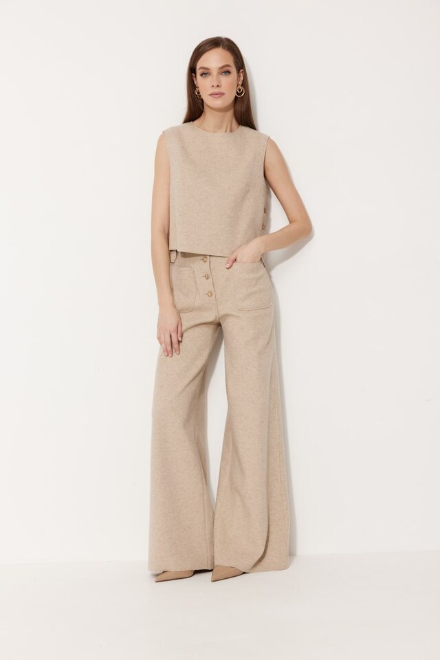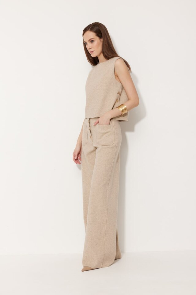 Брюки прямого кроя бежевого оттенка с застежкой на пуговицы и накладными карманами.