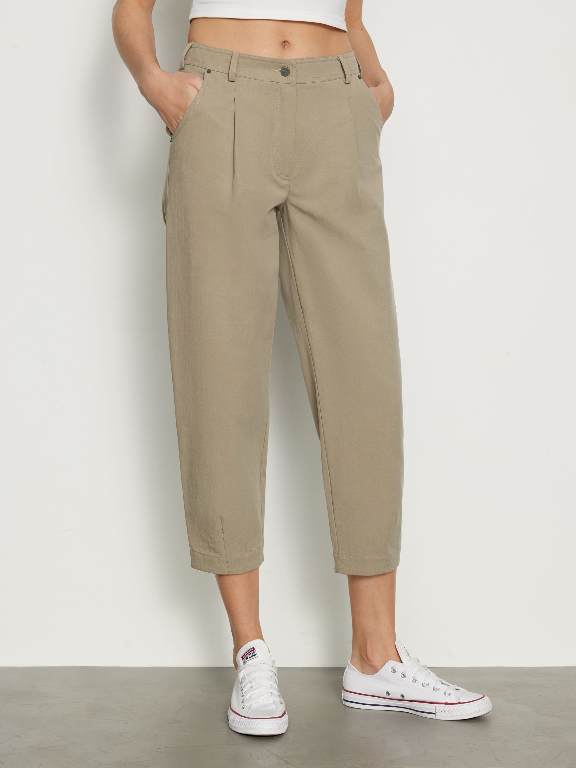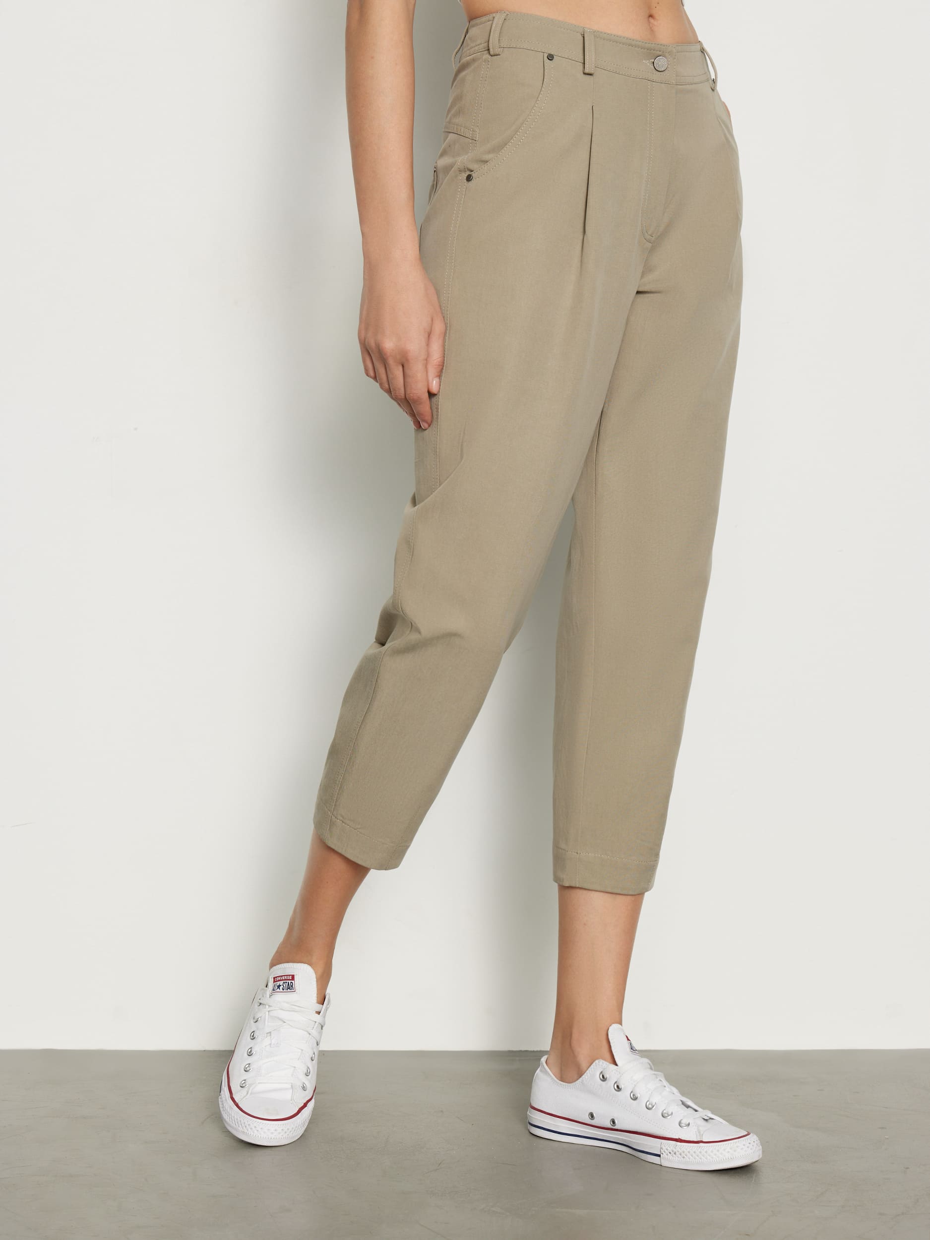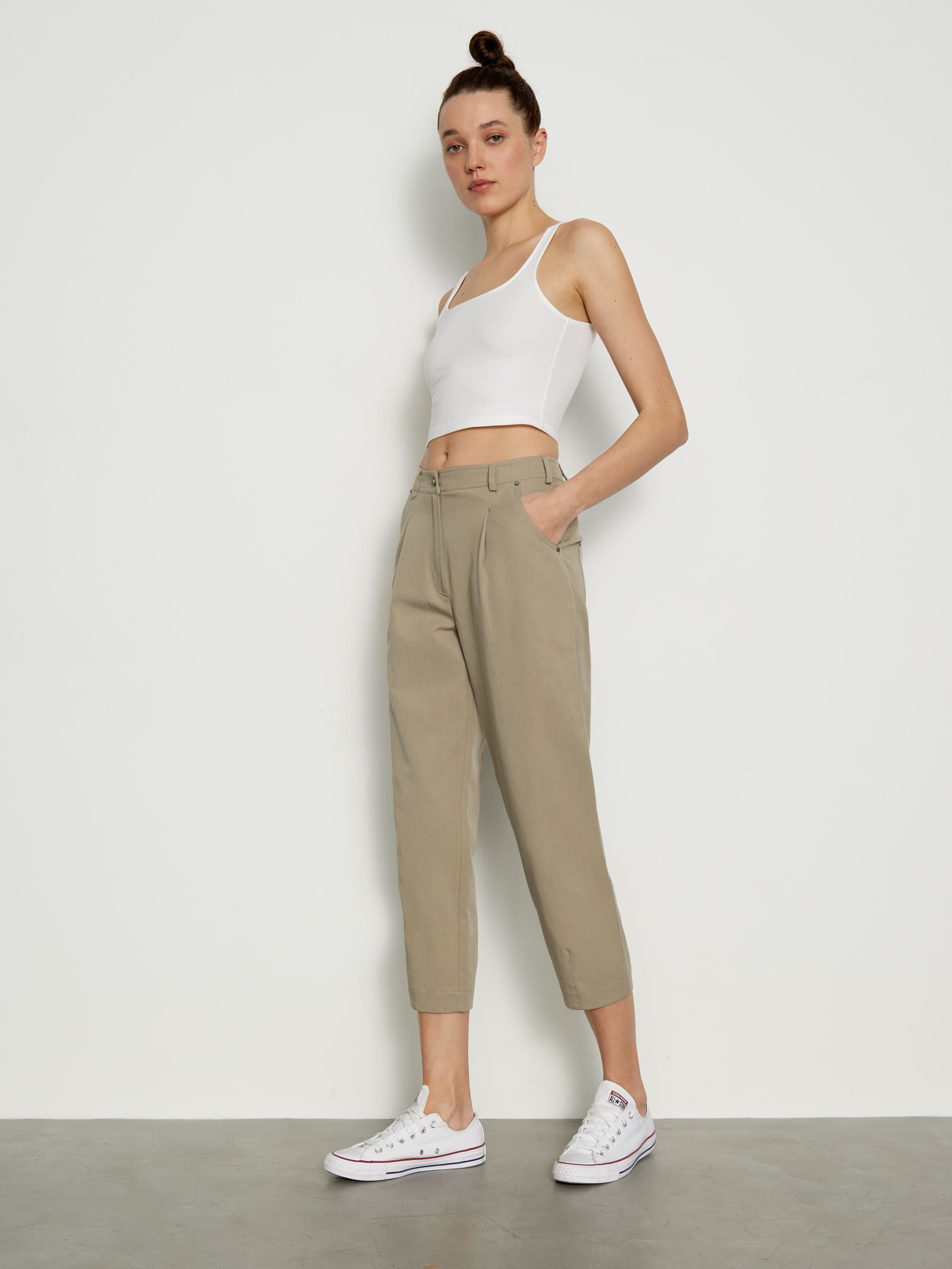 Брюки-бананы бежевого оттенка. Модель изготовлена из ткани, содержащей лиоцелл (самый современный вид вискозного полотна) и хлопок. Детали: пояс со шлевками; врезные карманы на передних половинках; накладные карманы сзади; защипы на талии.