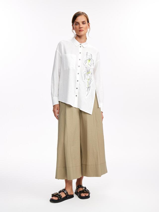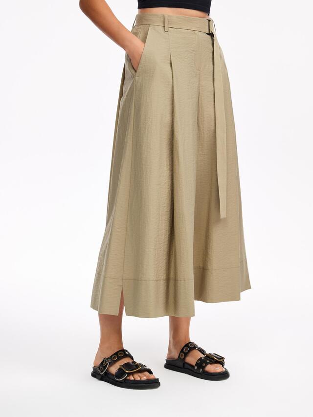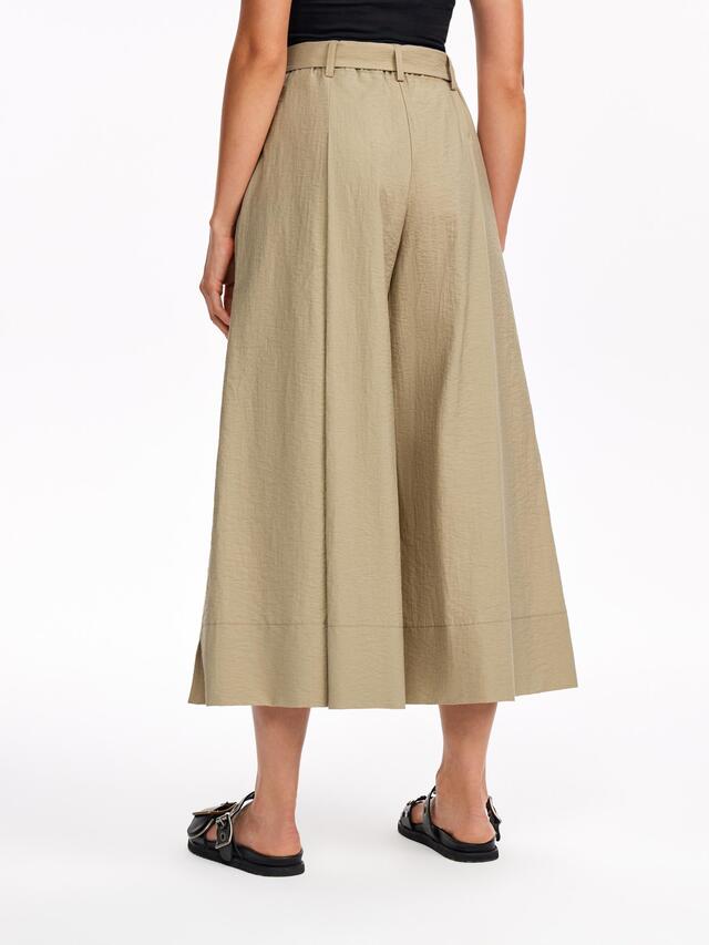 Брюки-кюлоты в стиле сафари выполнены из эластичного хлопка. Модель широкого кроя разнообразит образы и сделает их запоминающимися.
