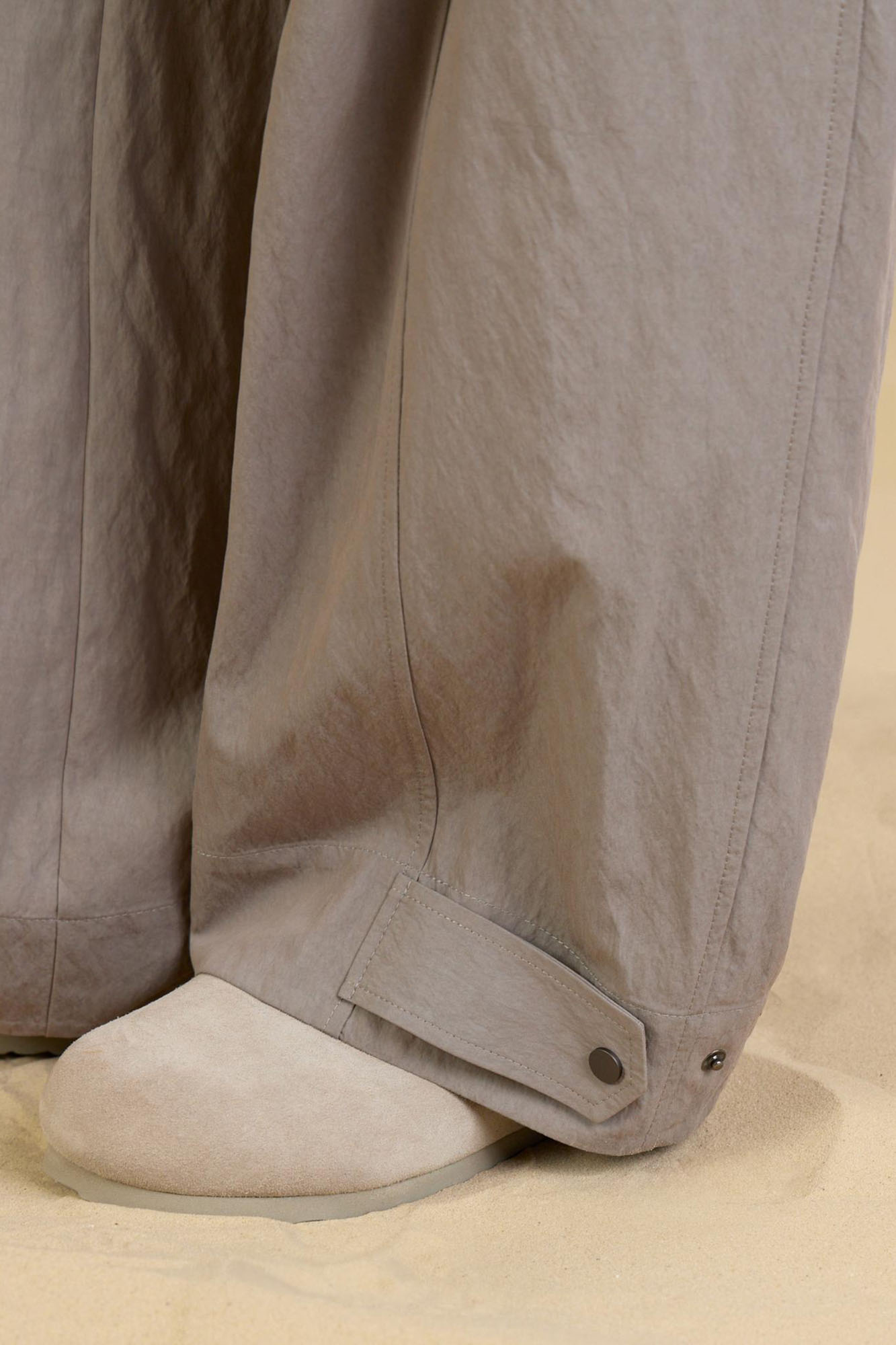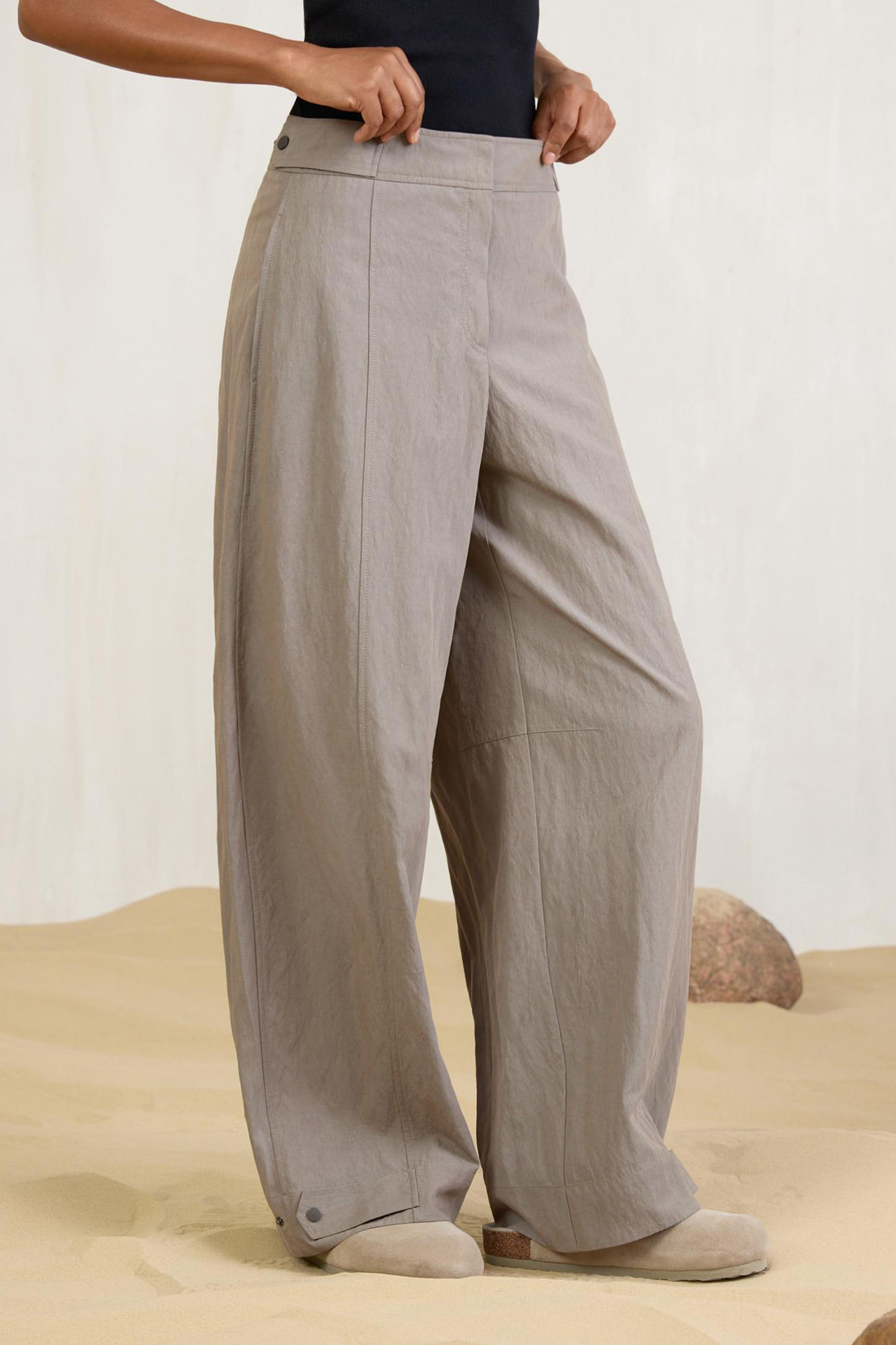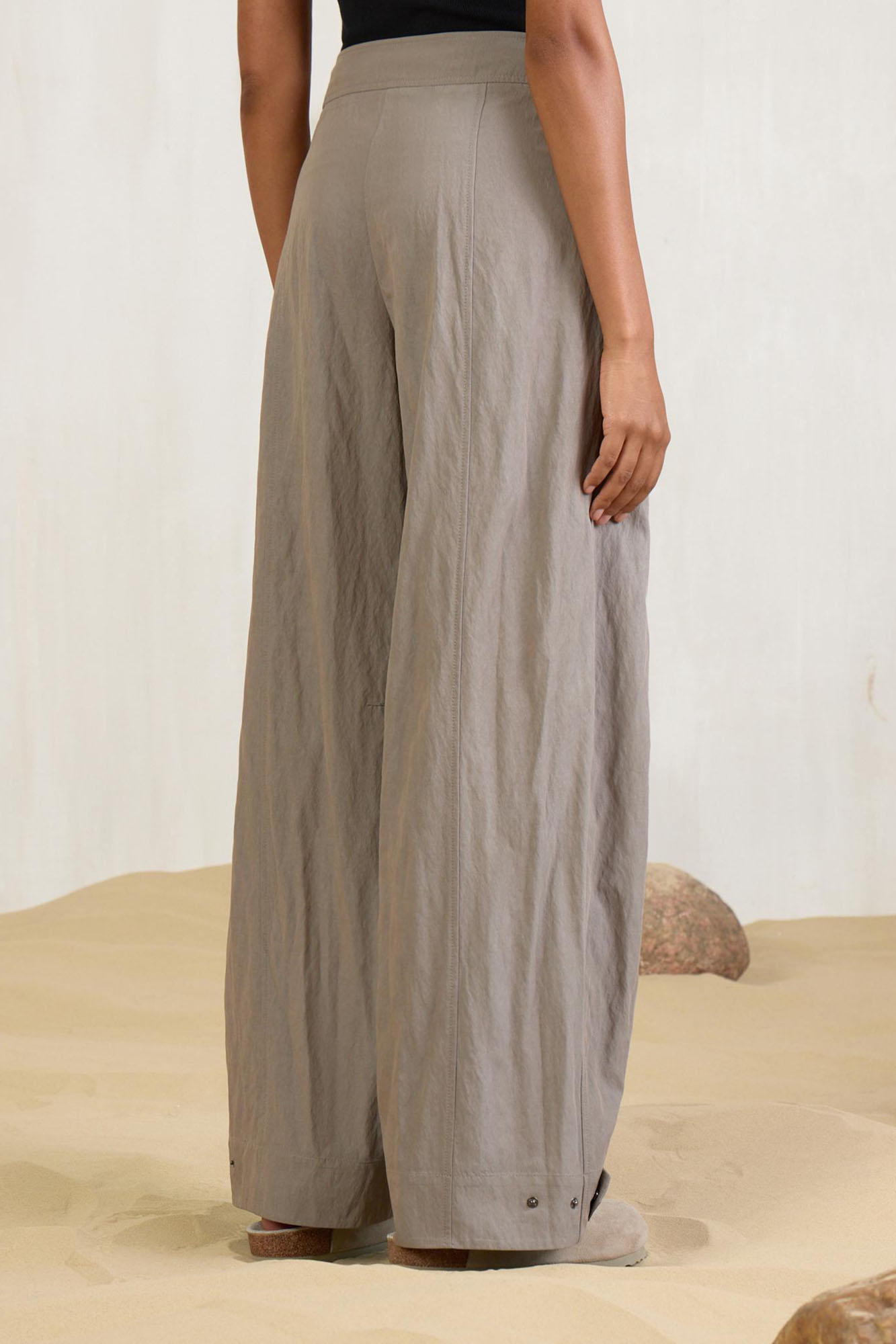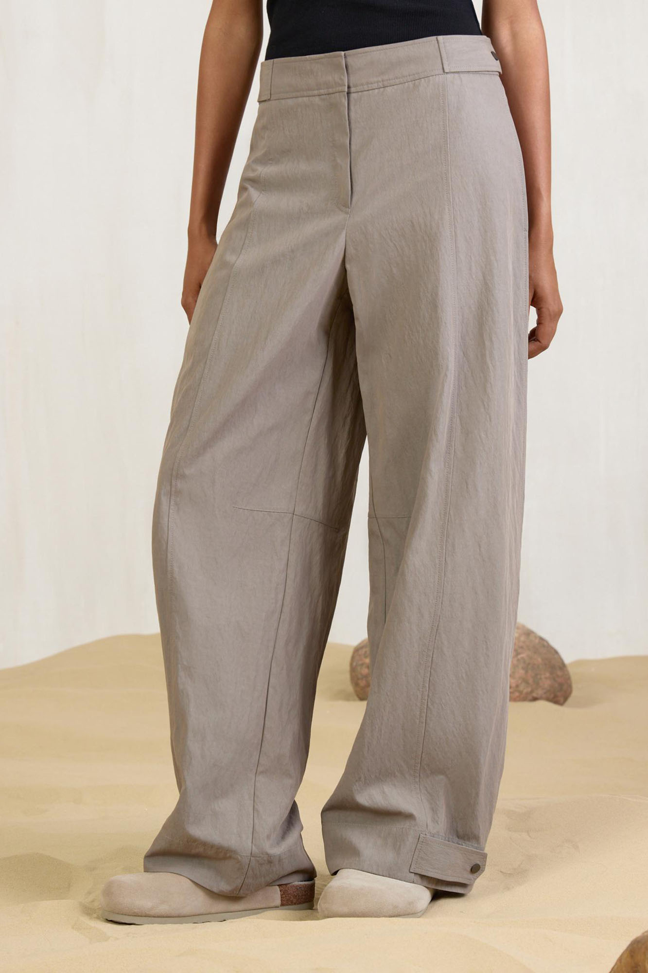 Новый фасон брюк из вискозы с нейлоном. Слегка жатая фактура с легким крэш-эффектом приятен в ношении. Широкий крой со средней посадкой вытягивает силуэт. Универсальный цвет сочетается с любой моделью из капсулы.