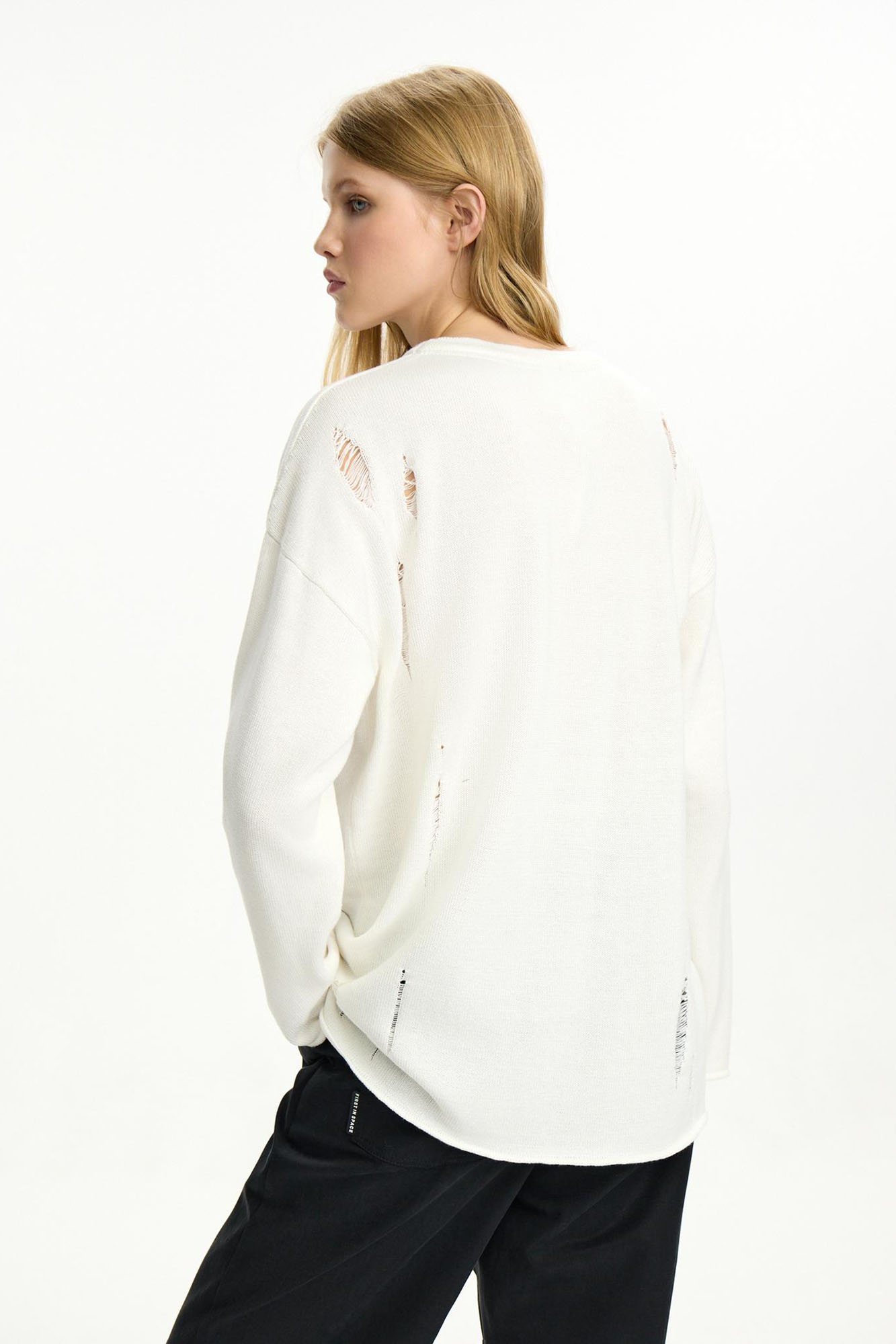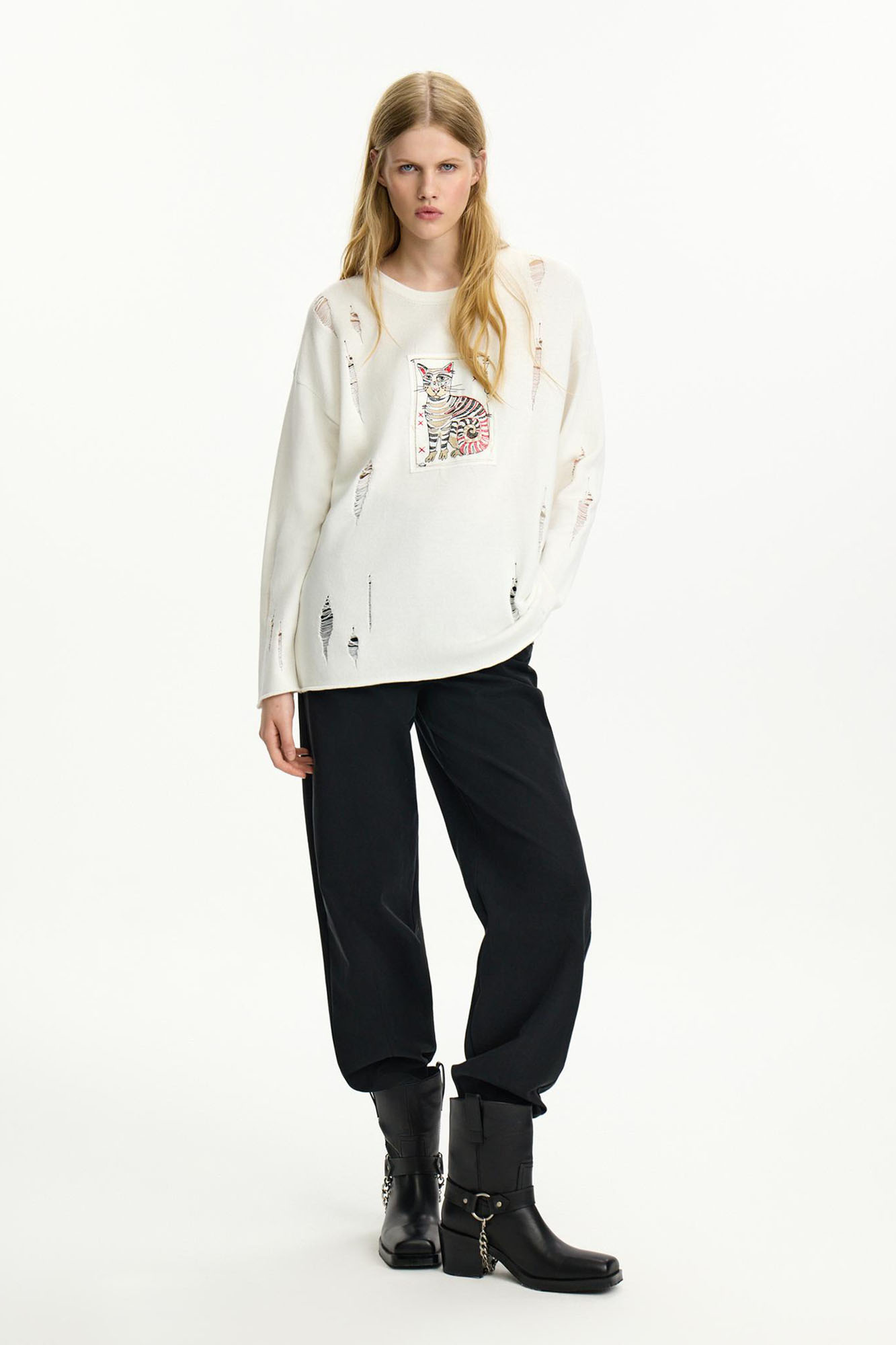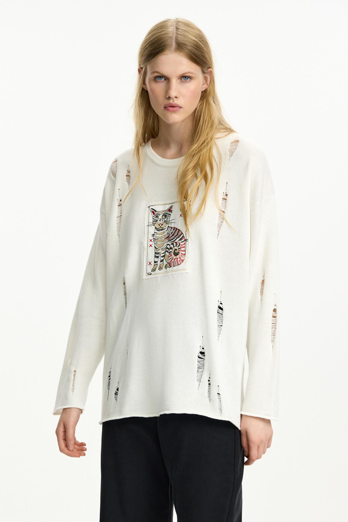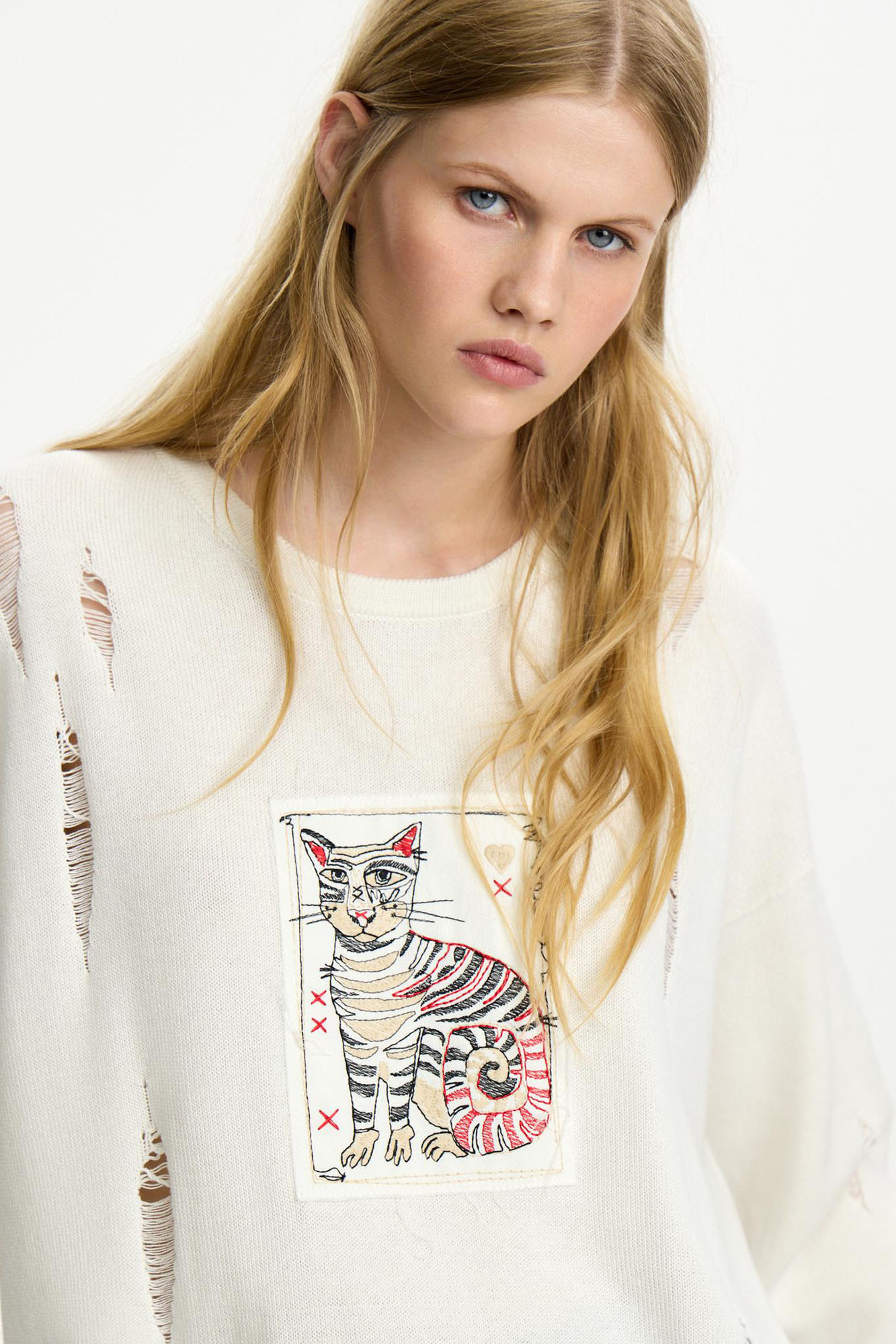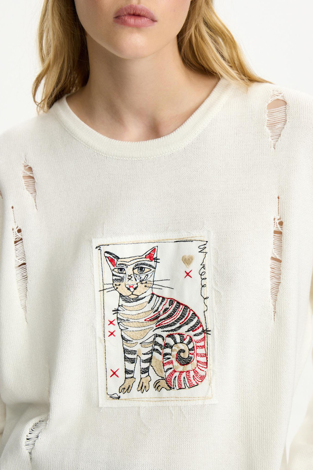 Этот джемпер з вязаного трикотажа на основе хлопка и акрила - сама нежность. Модель украшена нашивками, вдохновленными сказками Александра Сергеевича Пушкина. Свободный крой, окантовка в рубчик.