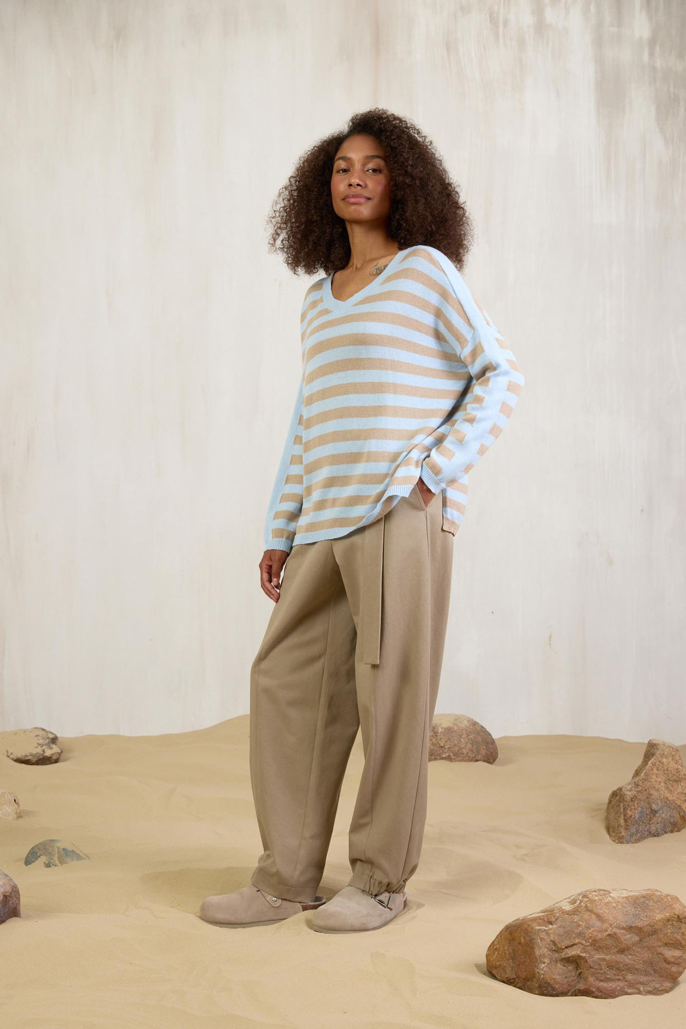 Новая модель джемпера из хлопка с акрилом. Воздушный трикотаж, расслабленный силуэт и нежное сочетание цветов, голубого и песочного, делает его идеальным партнером к любым джинсам и юбкам из денима.