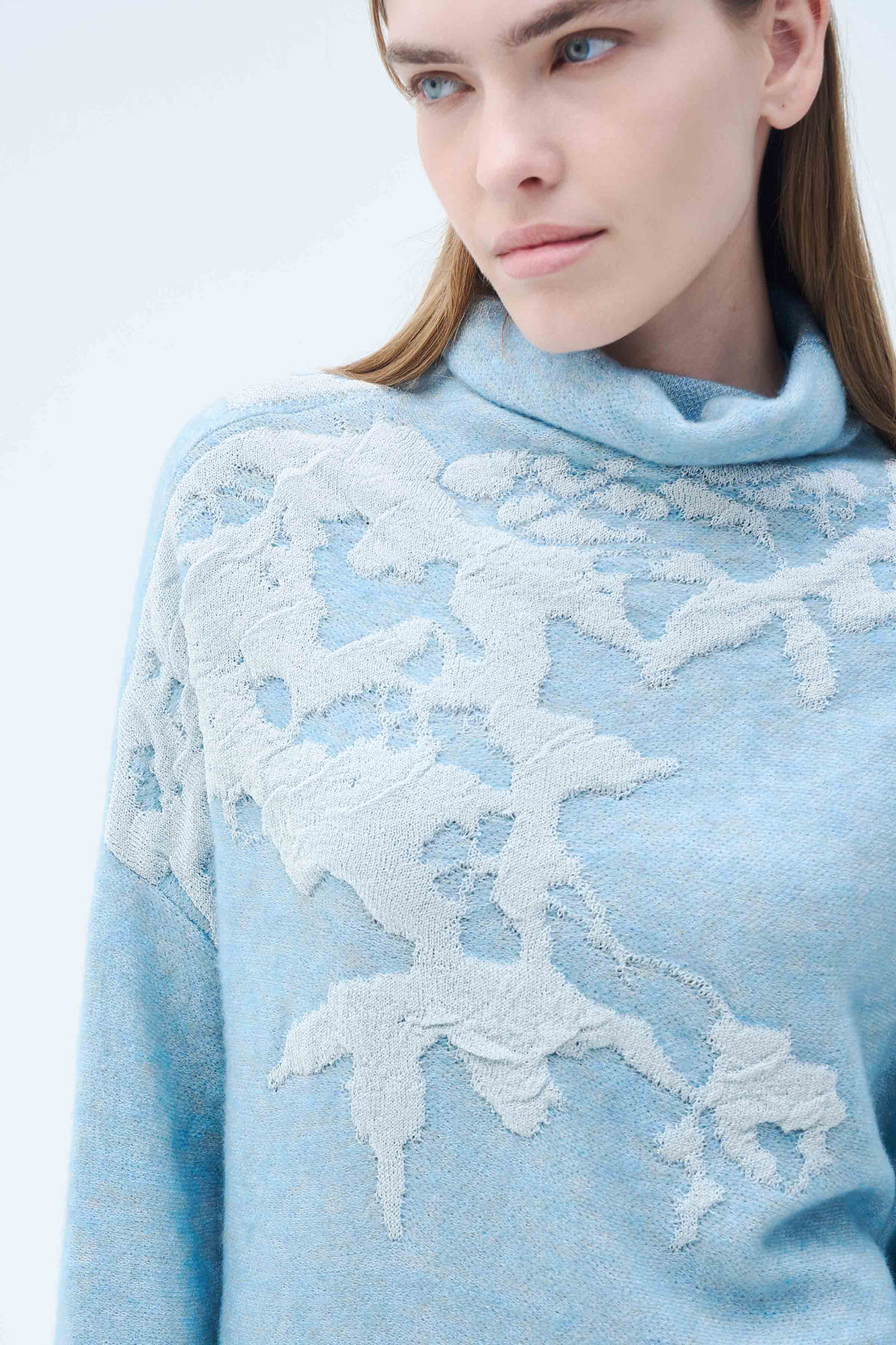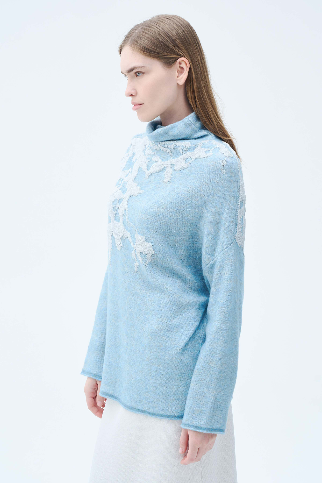 Вязаный джемпер силуэта "ромб". Уютное и мягкое полотно за счет буклированной пряжи в составе с ценной и мягкой шерстью Яка в сочетании с гладкой, глянцевой пряжей в рисунке в виде природных мотивов, придает джемперу с воротником-стойкой характерный зимний вид. Актуальный рисунок образует объемный и трехмерный эффект.