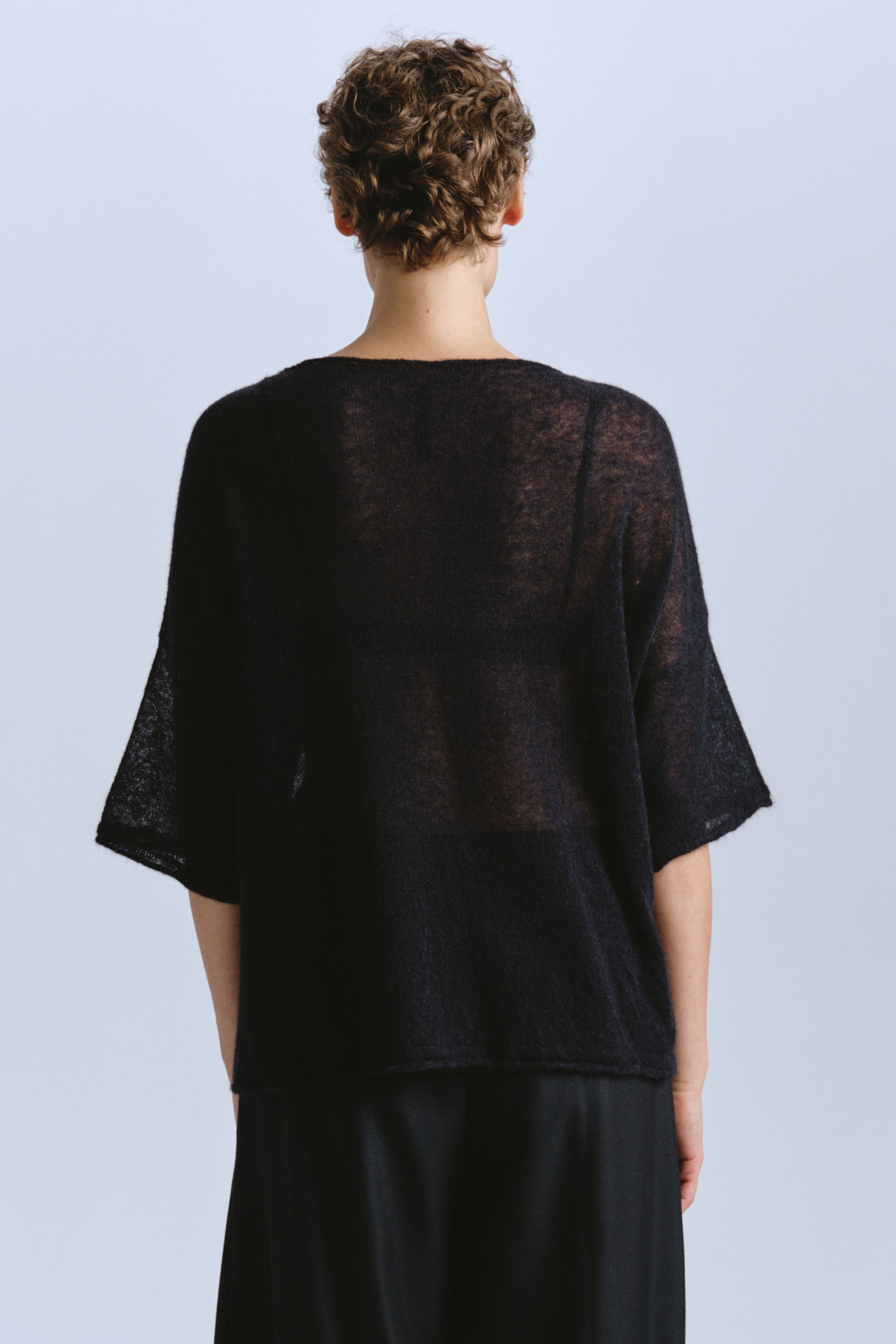 Очень легкий и уютный вязаный джемпер с коротким рукавом воздушного и полупрозрачного вязания. Выполнен из пушистой и нежнейшей пряжи Бэби Альпаки. Актуальный рисунок образует объемный и трехмерный эффект. Возможно стилизовать как жилет.