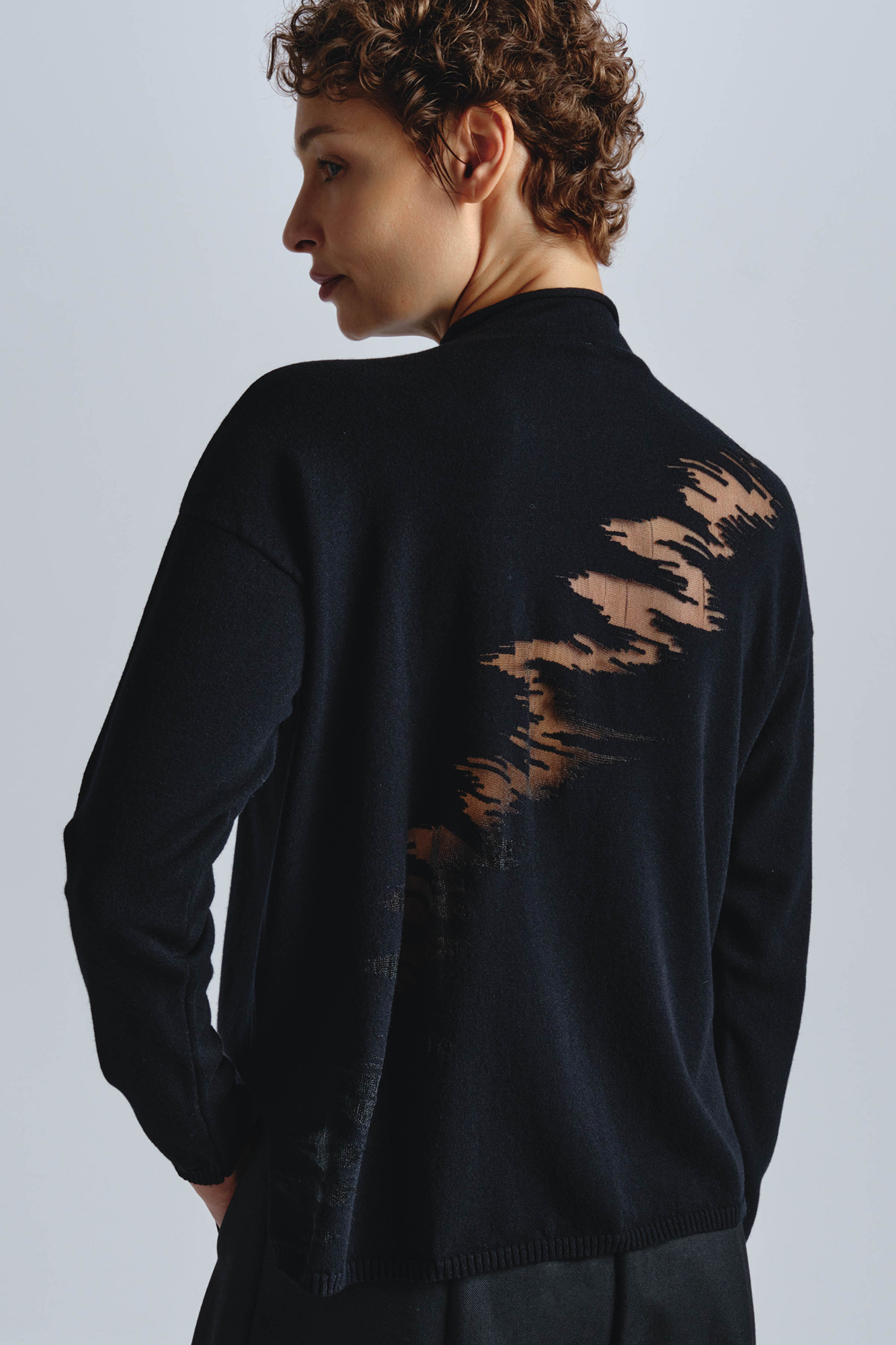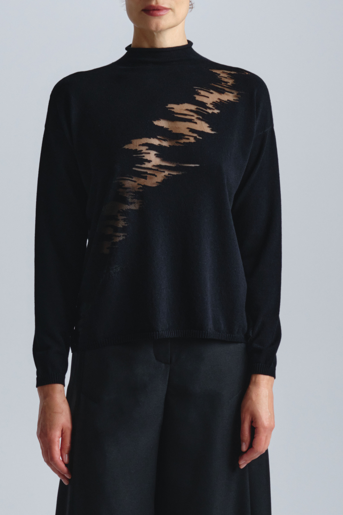 Вязаный джемпер водолазка тонкого вязания , полуприлегающего силуэта с длинным рукавом и горловиной стойкой. По бокам разрезы. С полупрозрачным эффектным вуалевым рисунком по стану изделия.