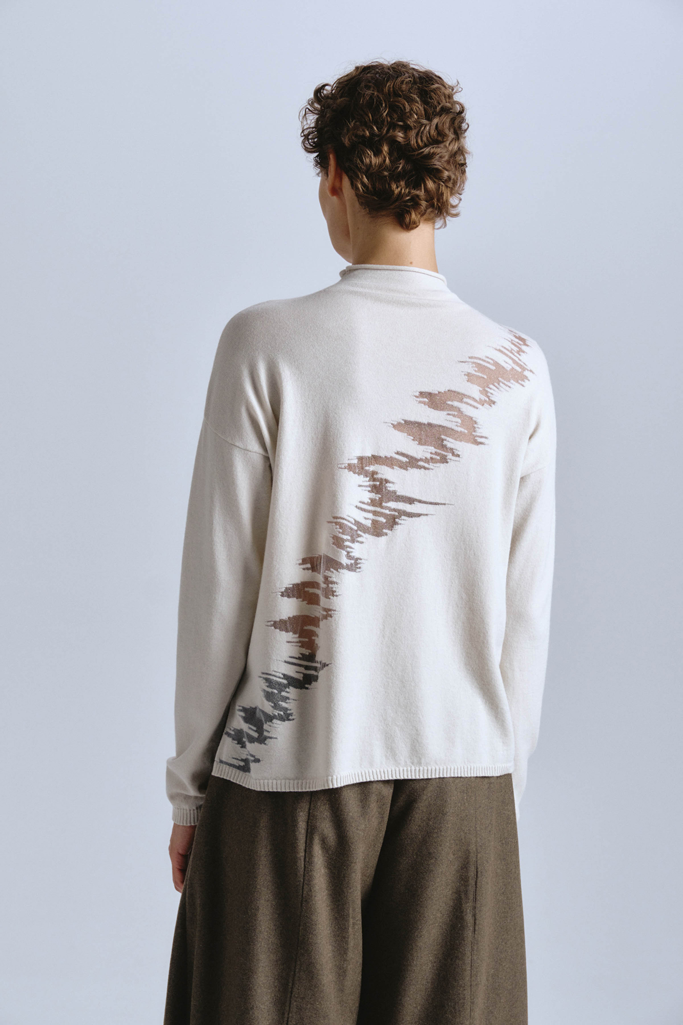 Вязаный джемпер водолазка тонкого вязания , полуприлегающего силуэта с длинным рукавом и горловиной стойкой. По бокам разрезы. С полупрозрачным эффектным вуалевым рисунком по стану изделия.