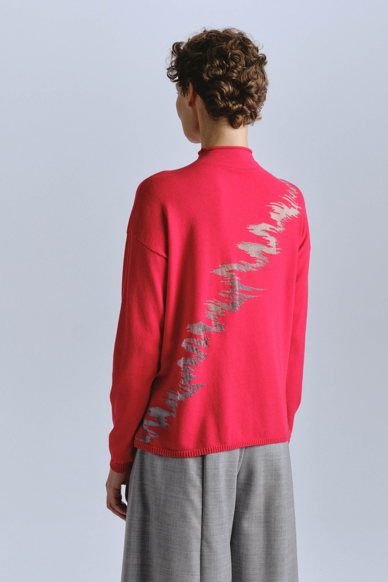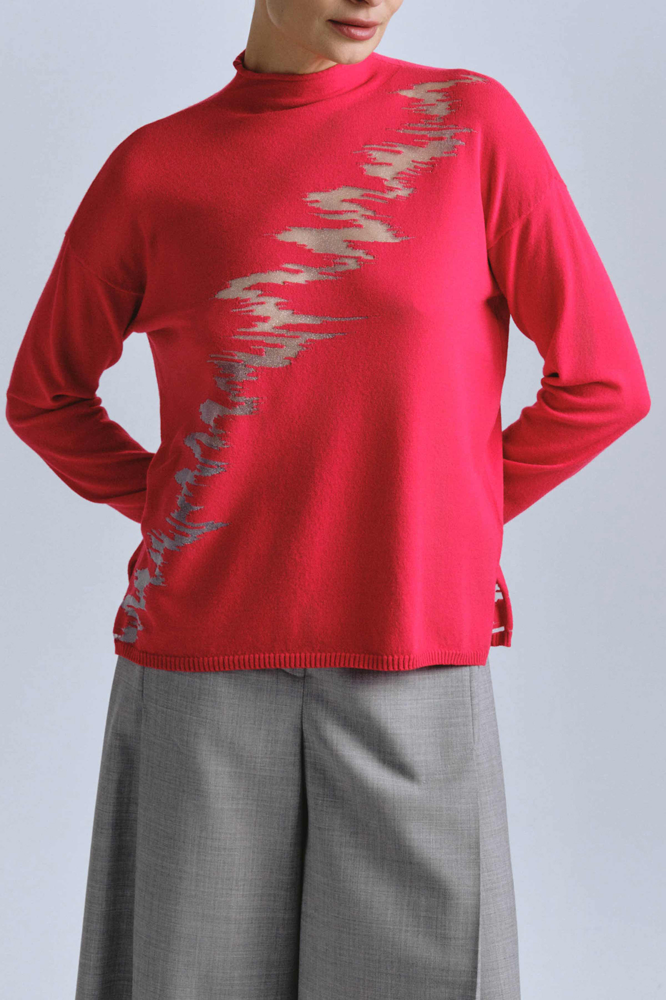 Вязаный джемпер водолазка тонкого вязания , полуприлегающего силуэта с длинным рукавом и горловиной стойкой. По бокам разрезы. С полупрозрачным эффектным вуалевым рисунком по стану изделия.