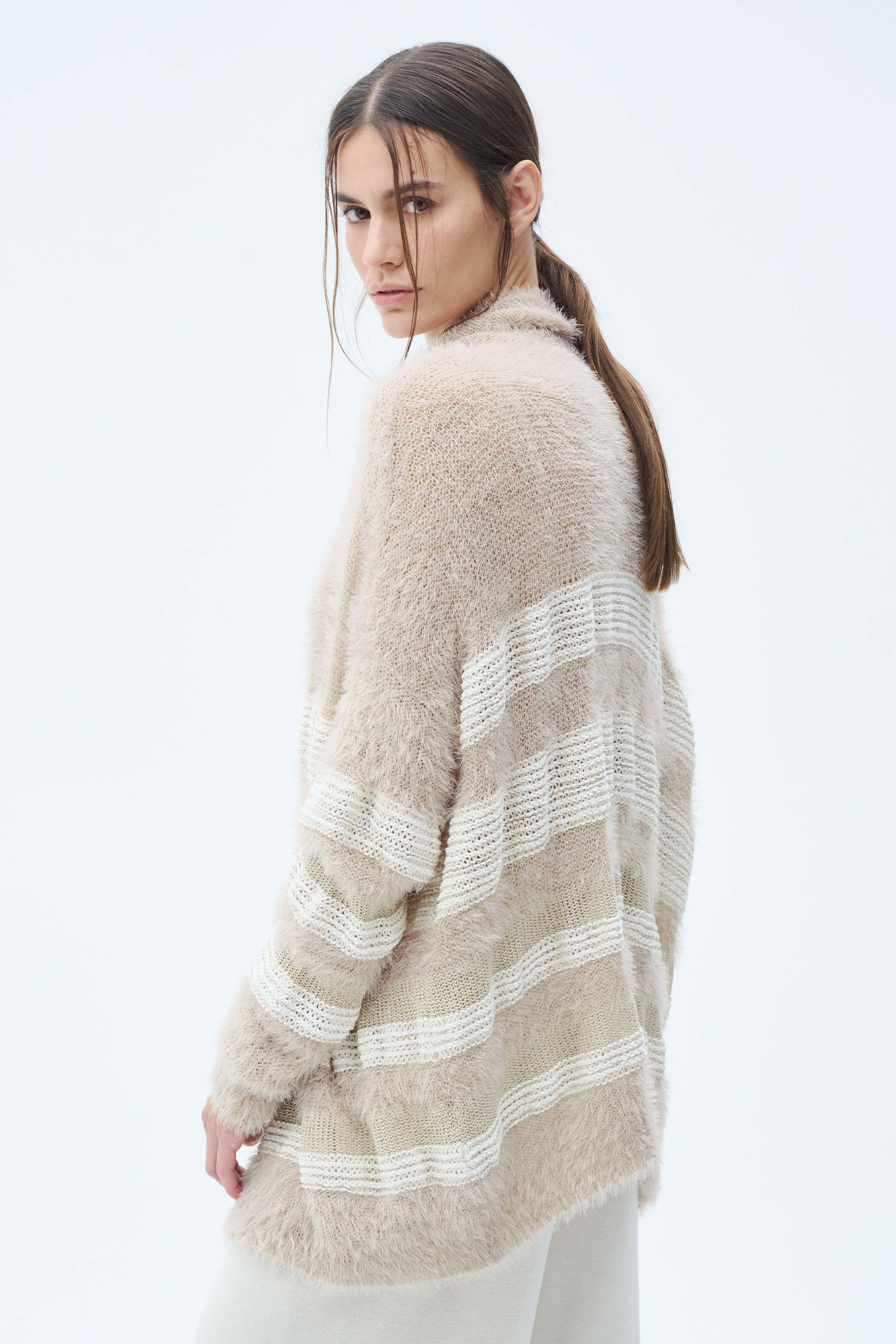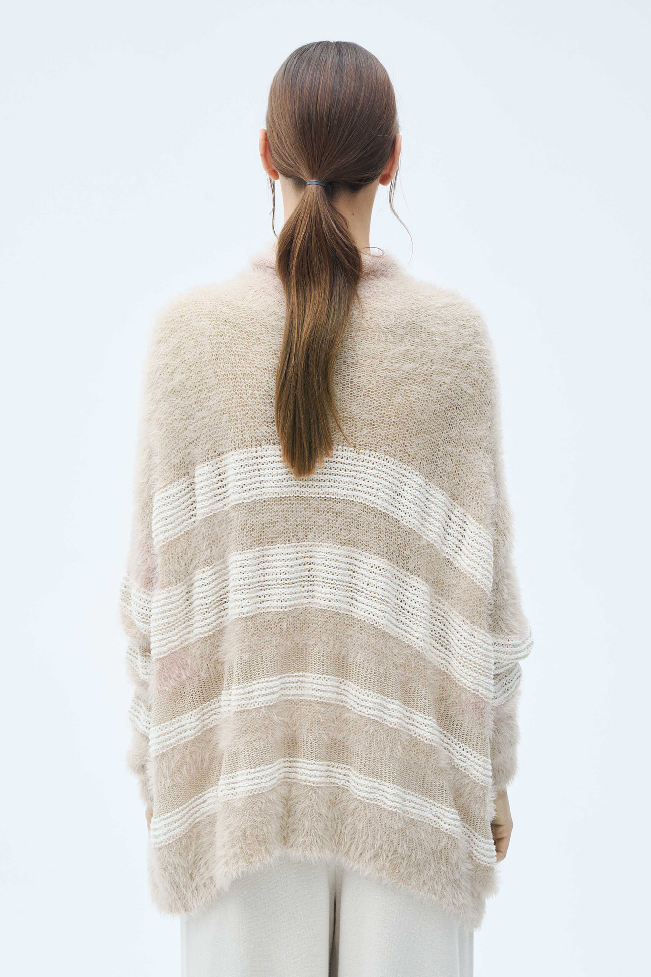 Вязаный джемпер удлиненного свободного силуэта из тонкой буклированной шерсти с рисунком в виде полос из пушистой пряжи с длинным ворсом. Спущенная линия плеча, воротник-хомут.
