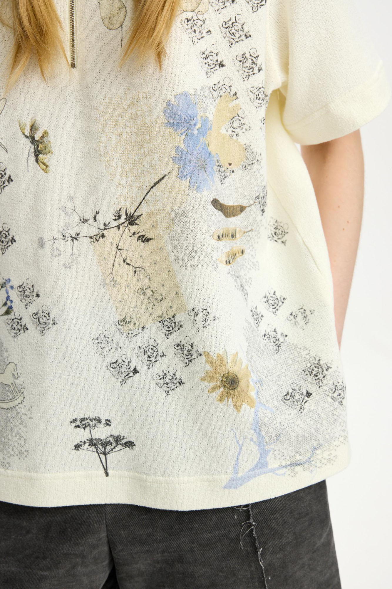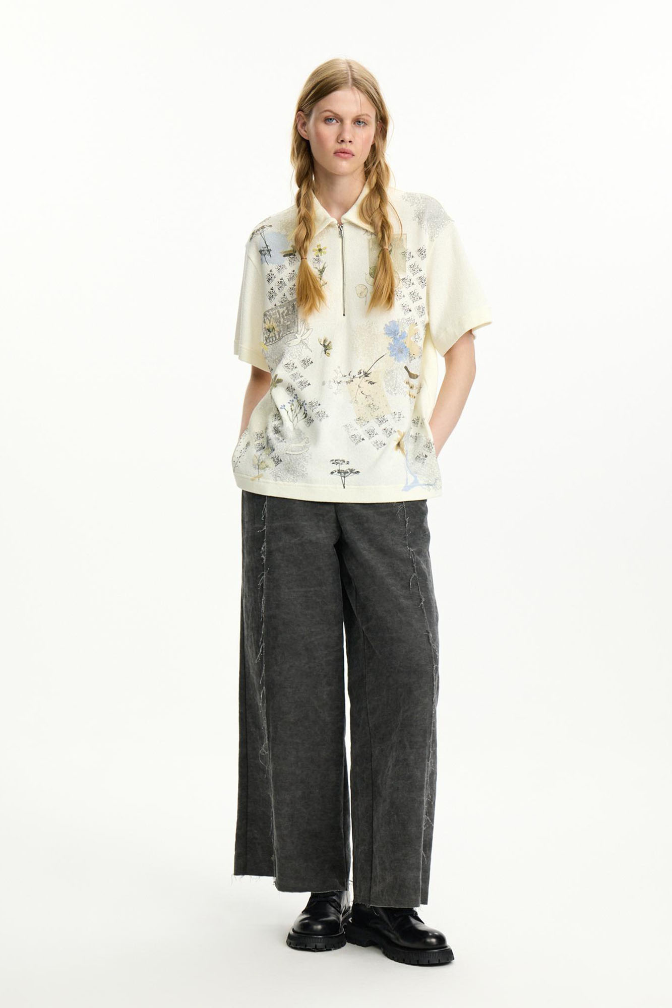 Нежная футболка-поло из кроеного трикотажного полотна. Модель украшена весенним принтом, создающими ощущение ароматного разнотравья в деревне: здесь и акация, и цикорий, и пастушья сумка. Маст-хэв любого неравнодушного к родной природе человека.