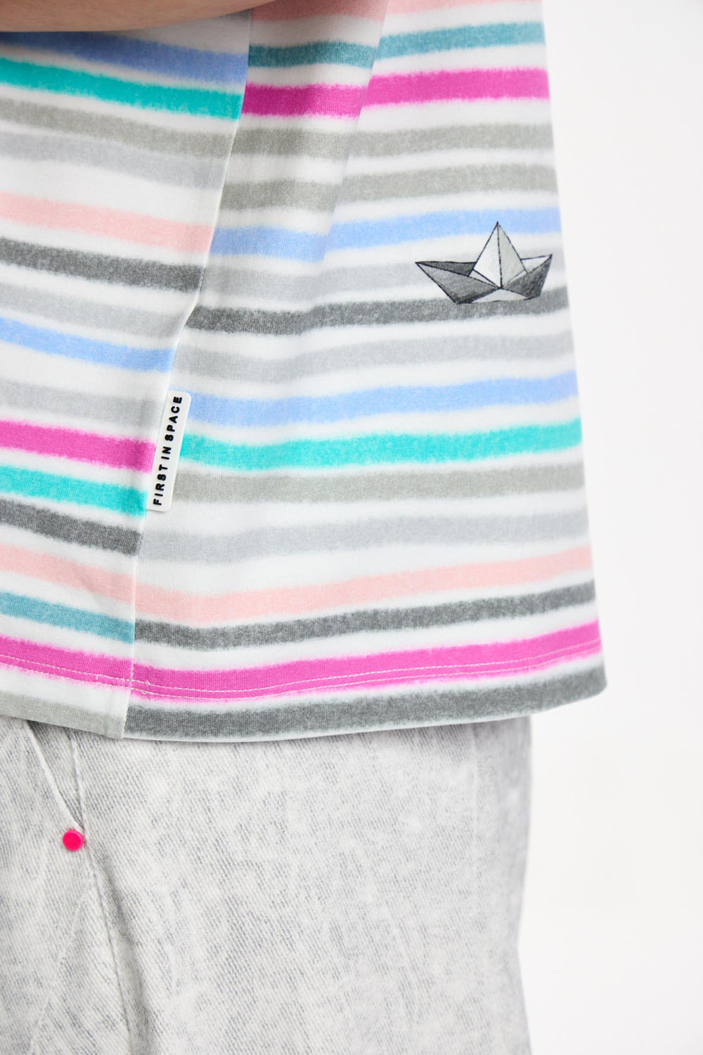 Футболка аккуратного силуэта в нежную дымчатую полоску. Модель украшена хаотичными принтами, добавляющими характера и озорства всему образу.
