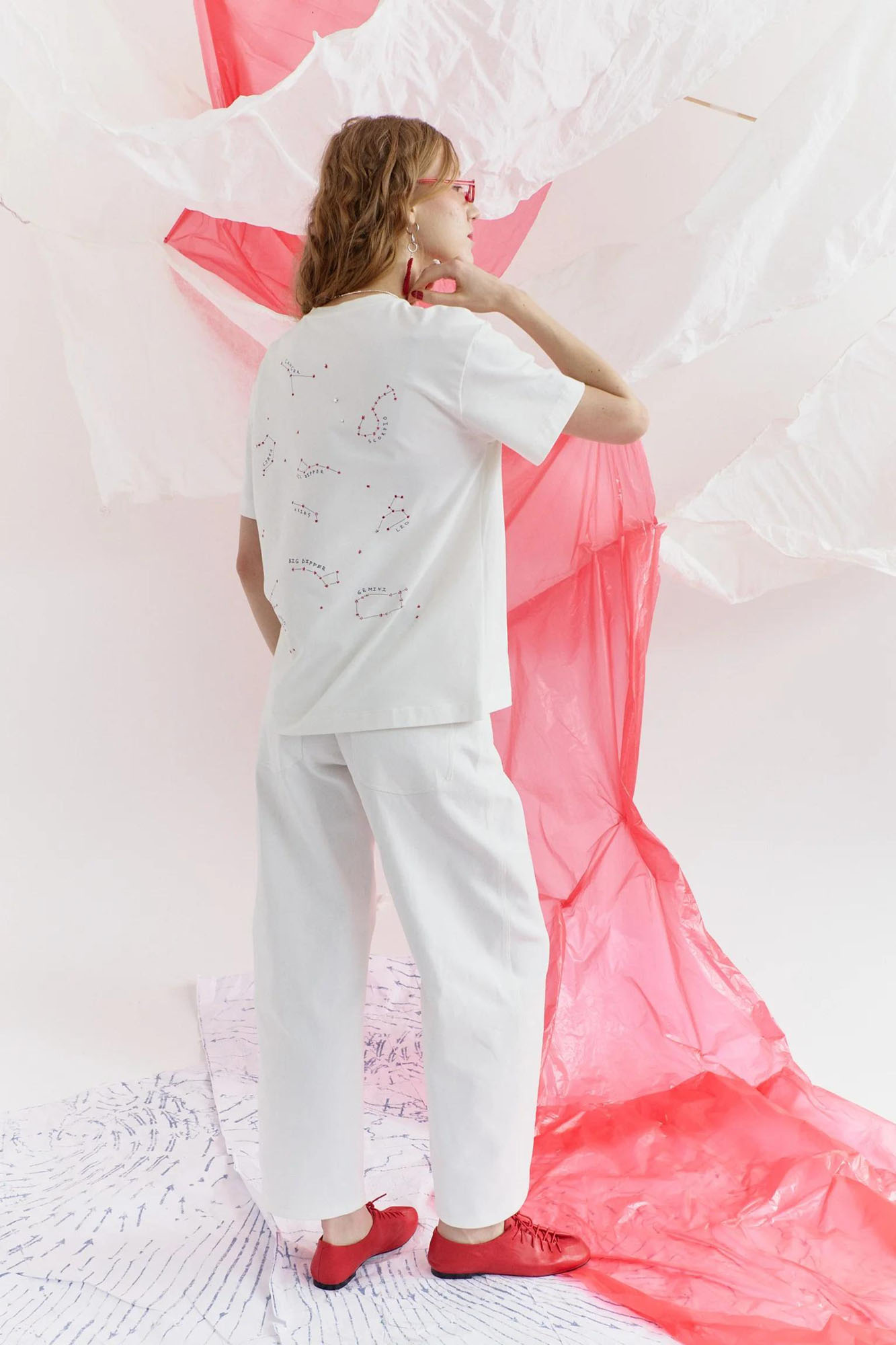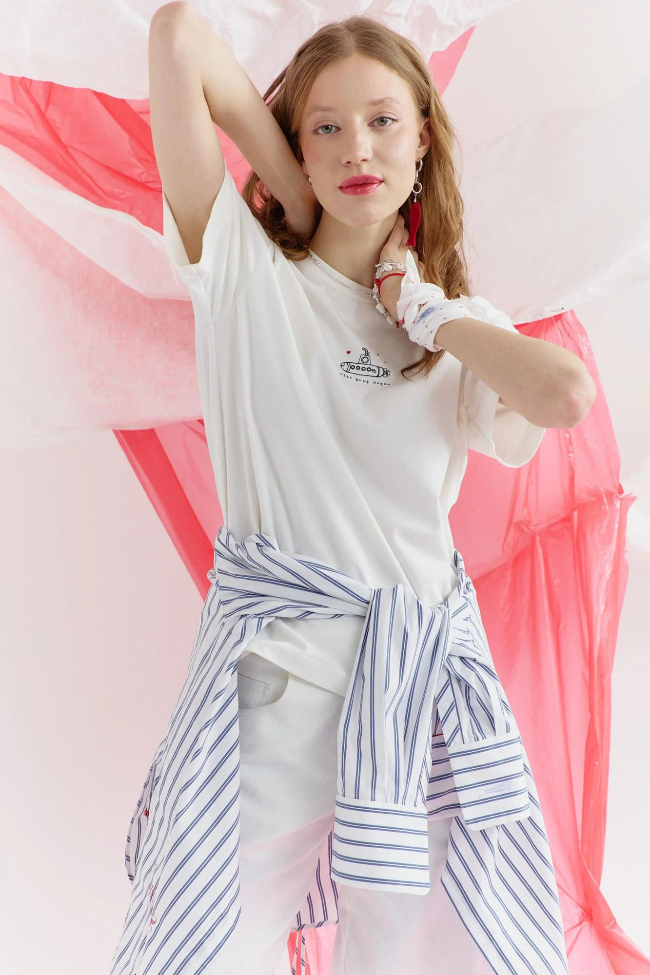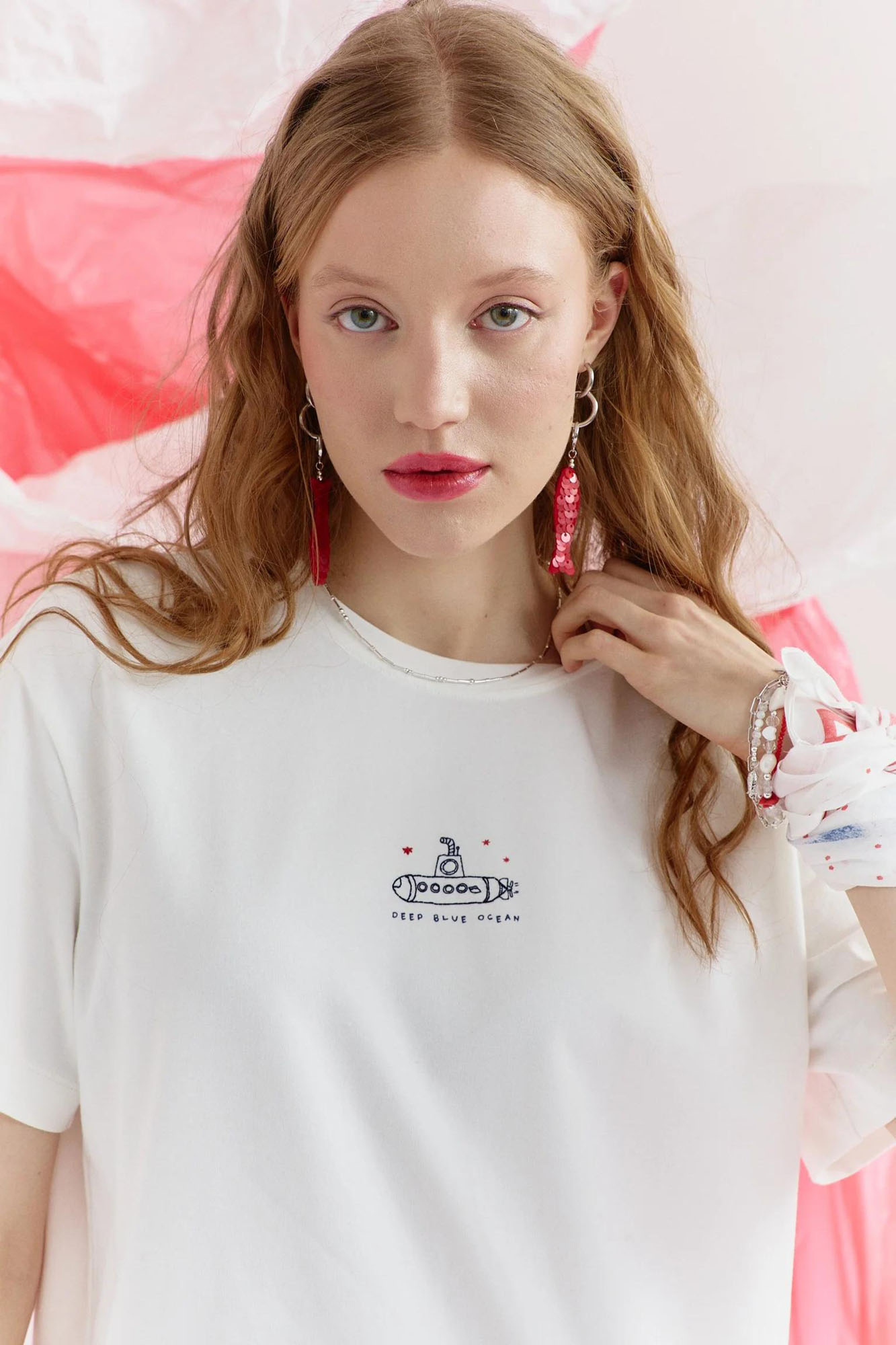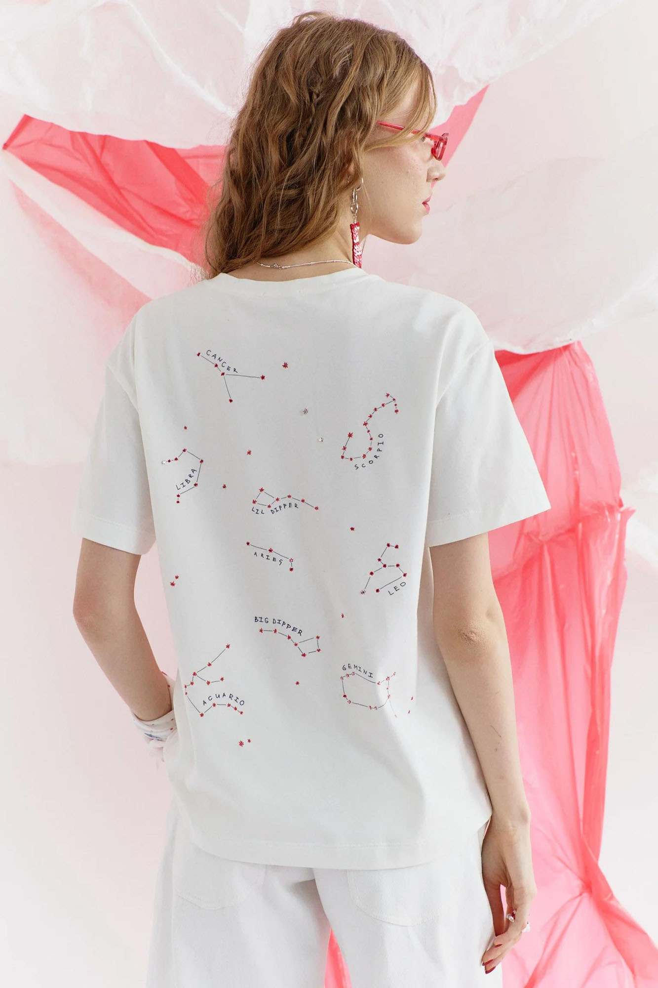 Футболка прямого, свободного силуэта из премиального трикотажного полотна с бархатистым эффектом. Футболка украшена авторским принтом и ручной вышивкой.