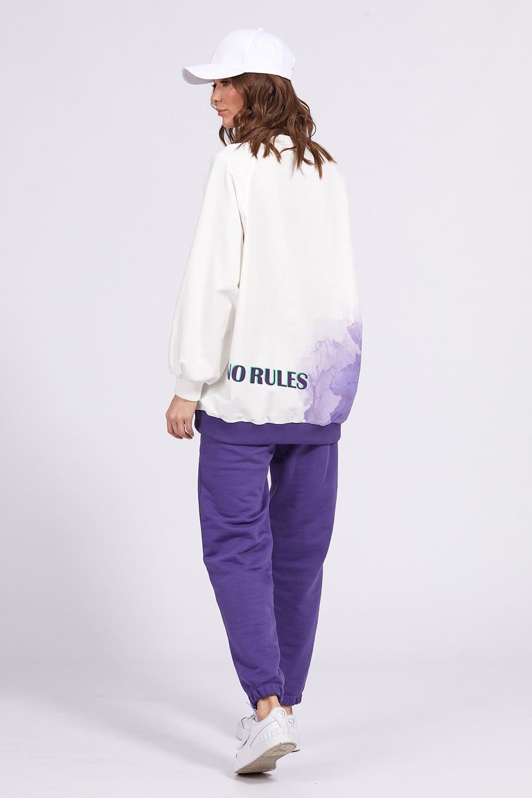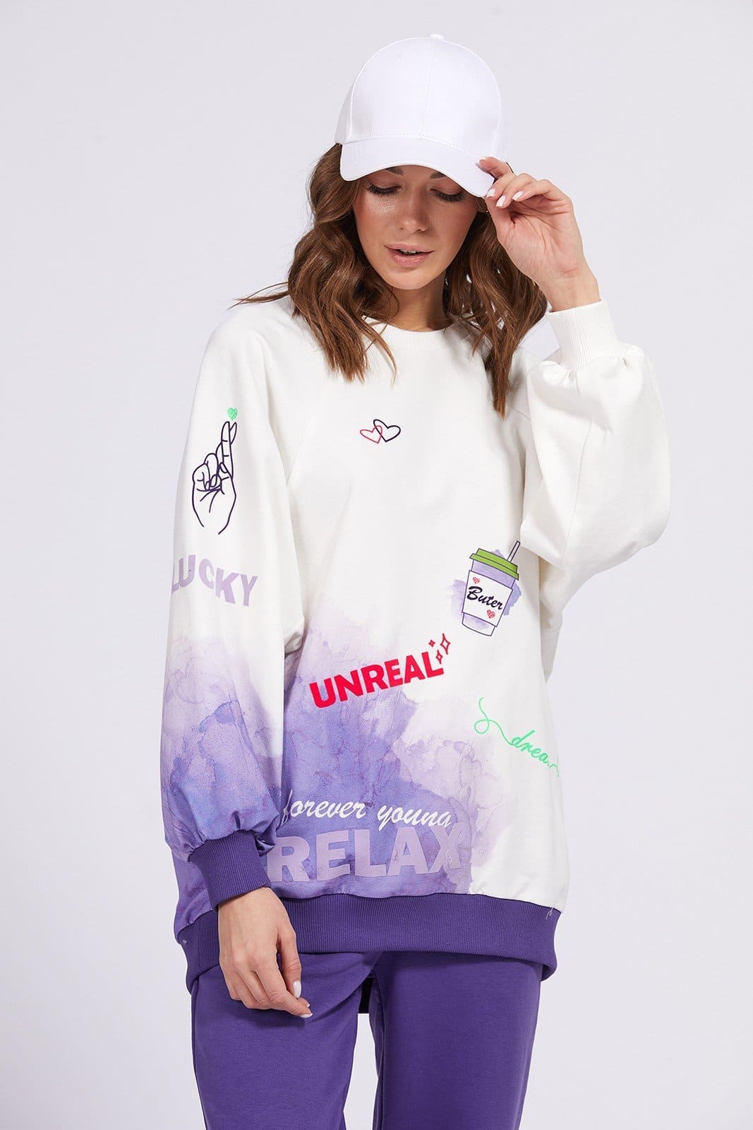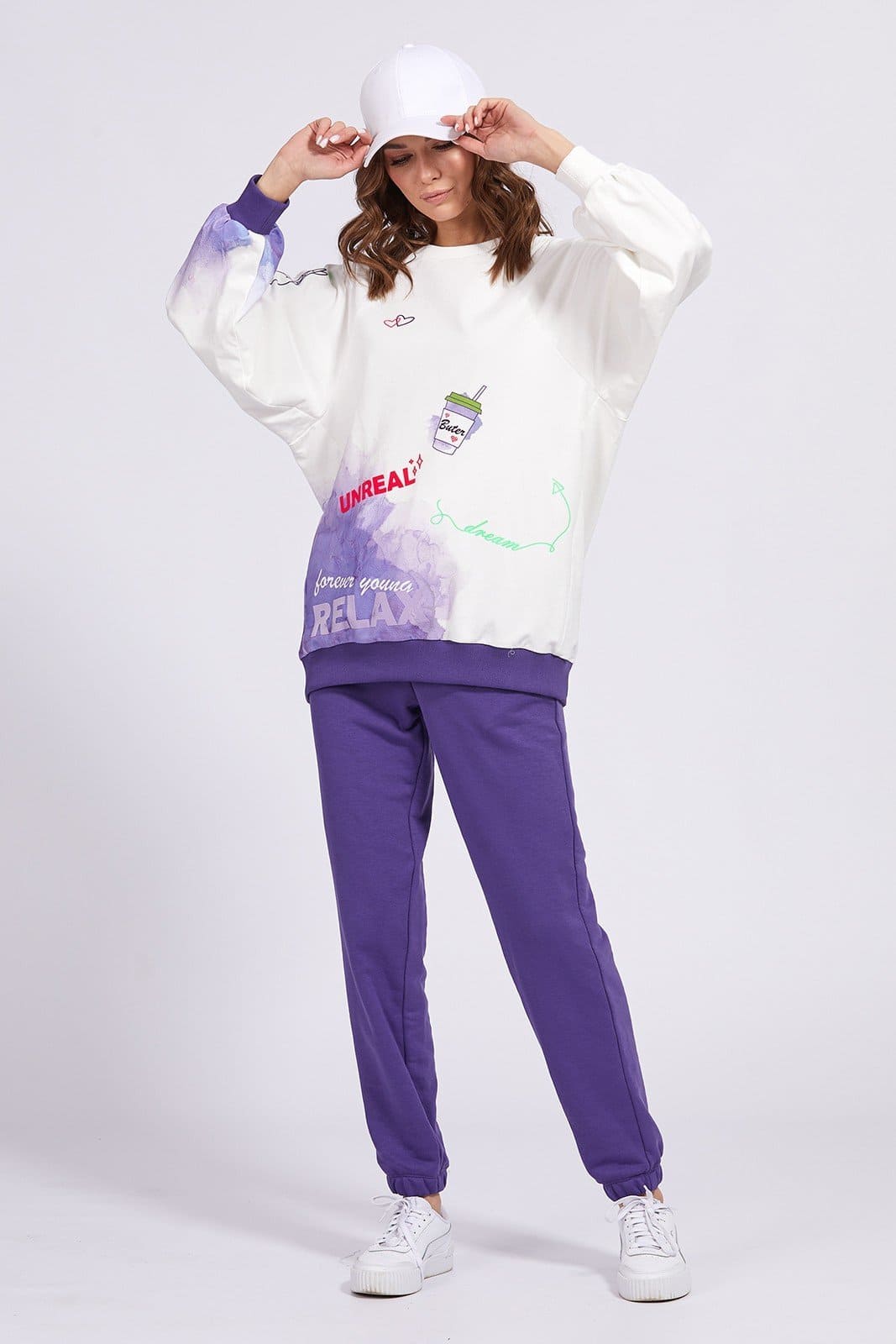 Комплект женский, двухпредметный. Состоит из джемпера с печатью и брюк на резинке. Джемпер удлиненный, свободного силуэта, рукав-реглан. Горловина с планкой из довяза. Низ изделия и рукава на манжете из довяза. Боковой шов смещён на перед. Полочка с переходом на спинку и правый рукав с акварельным принтом и шрифтовой термотрансферной композицией. Брюки спортивные, зауженные к низу. Пояс на широкой резинке. С имитацией гульфика. Брюки с карманами. Слева небольшая вышивка BUTER. Внизу брюки на резинке.