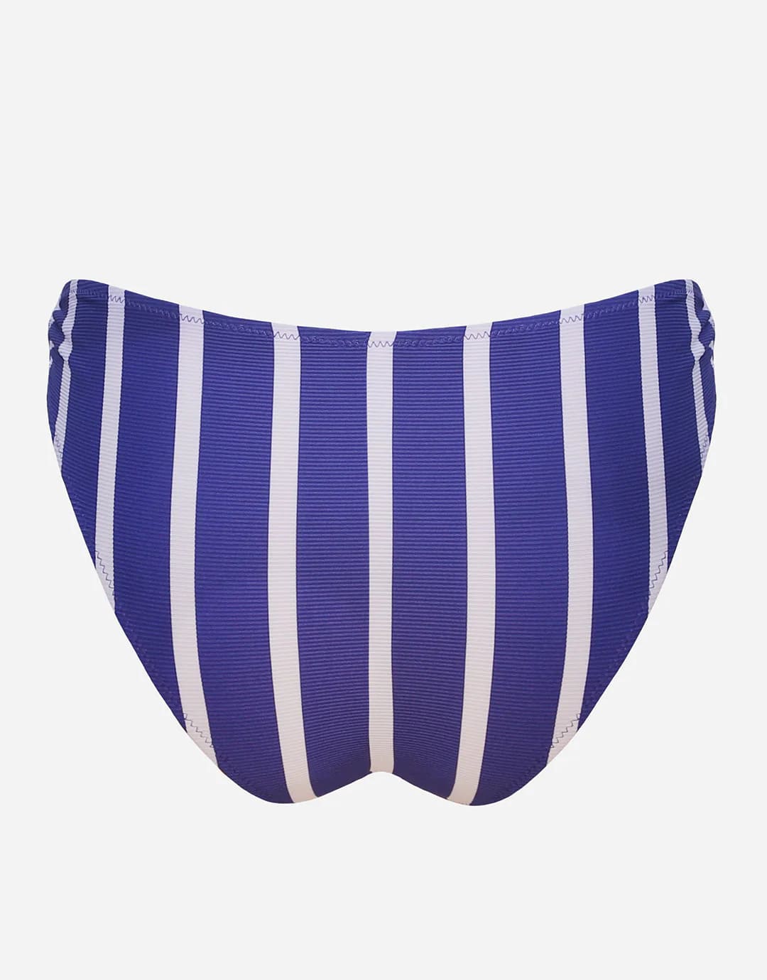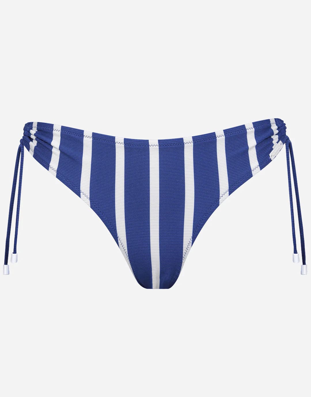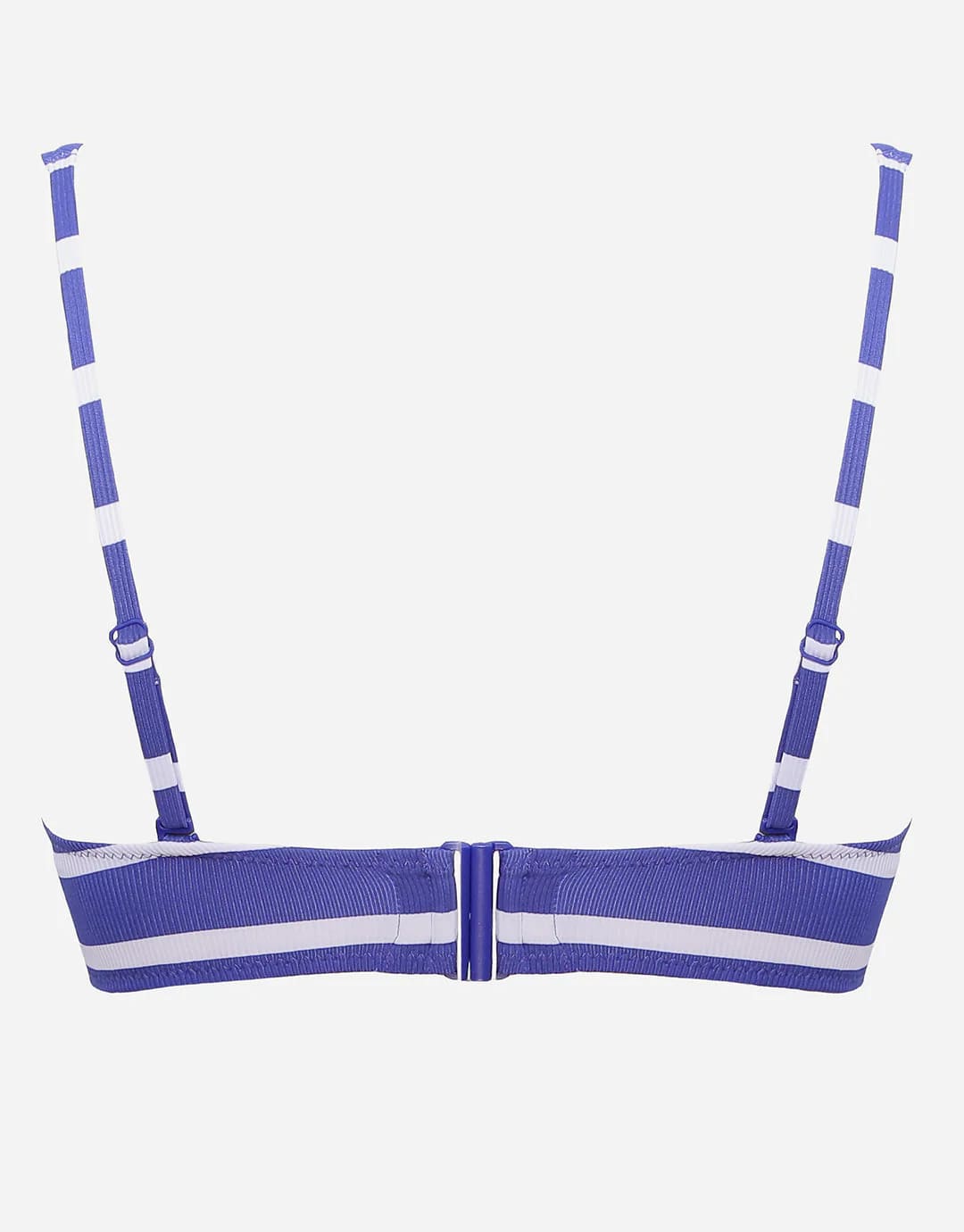 Раздельный купальник немецкого бренда Watercult. Топ выполнен из ткани в бело-голубую полоску в рубчик с изюминкой спереди, мягкими съемными чашечками, зажимом сзади и регулируемыми бретелями. Купальник укомплектован плавками из ткани в рубчик в бело-голубую полоску с умеренной посадкой и петлями с завязками по бокам.