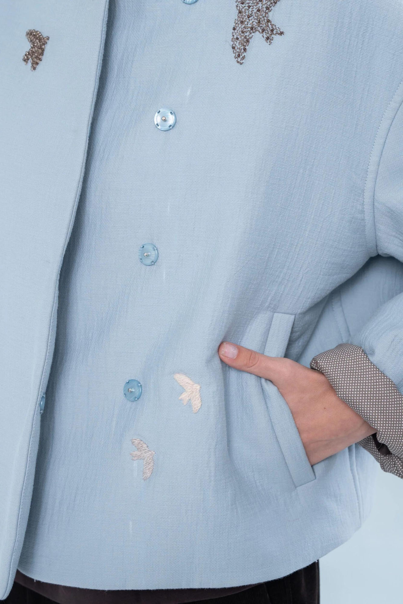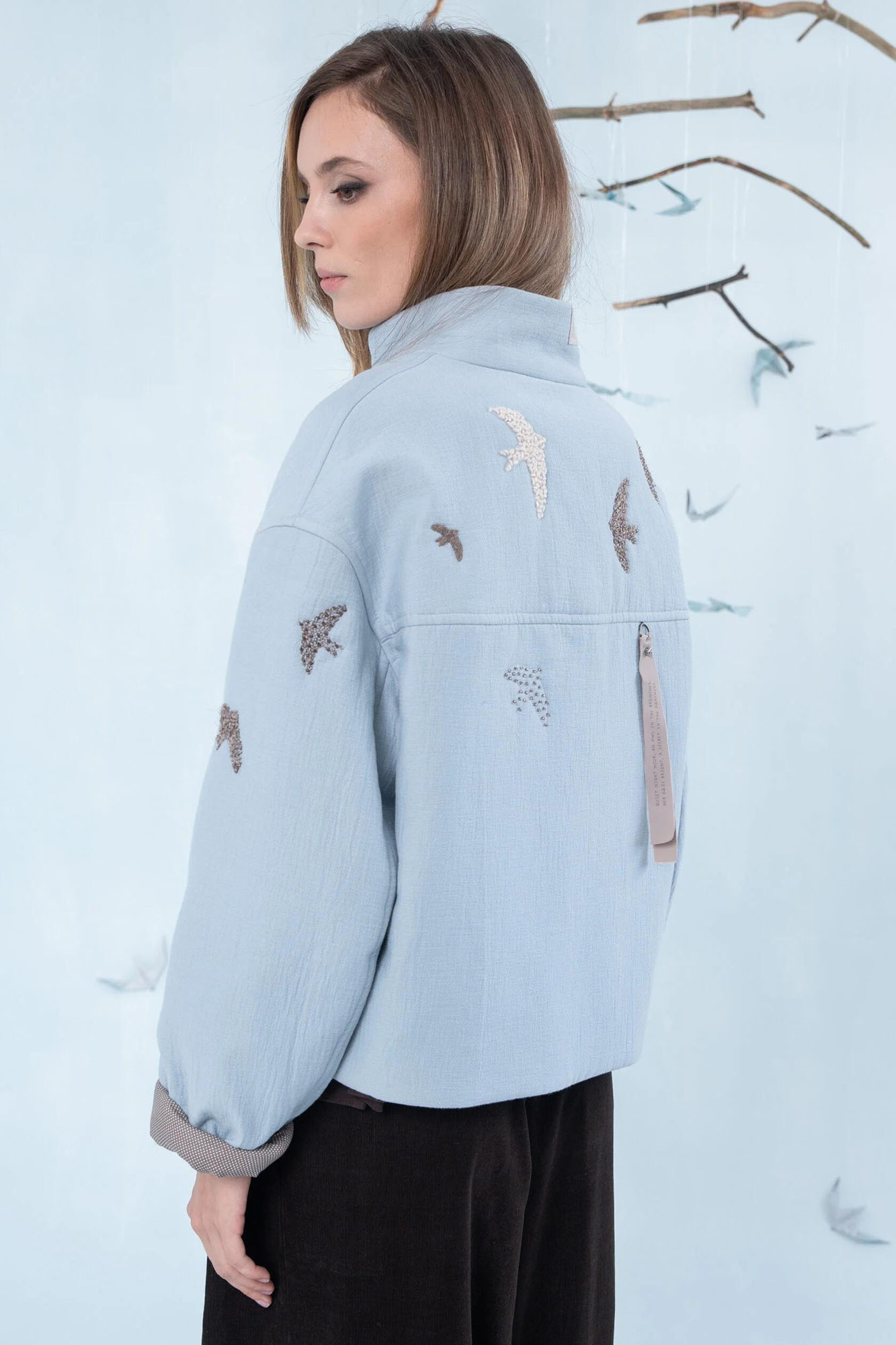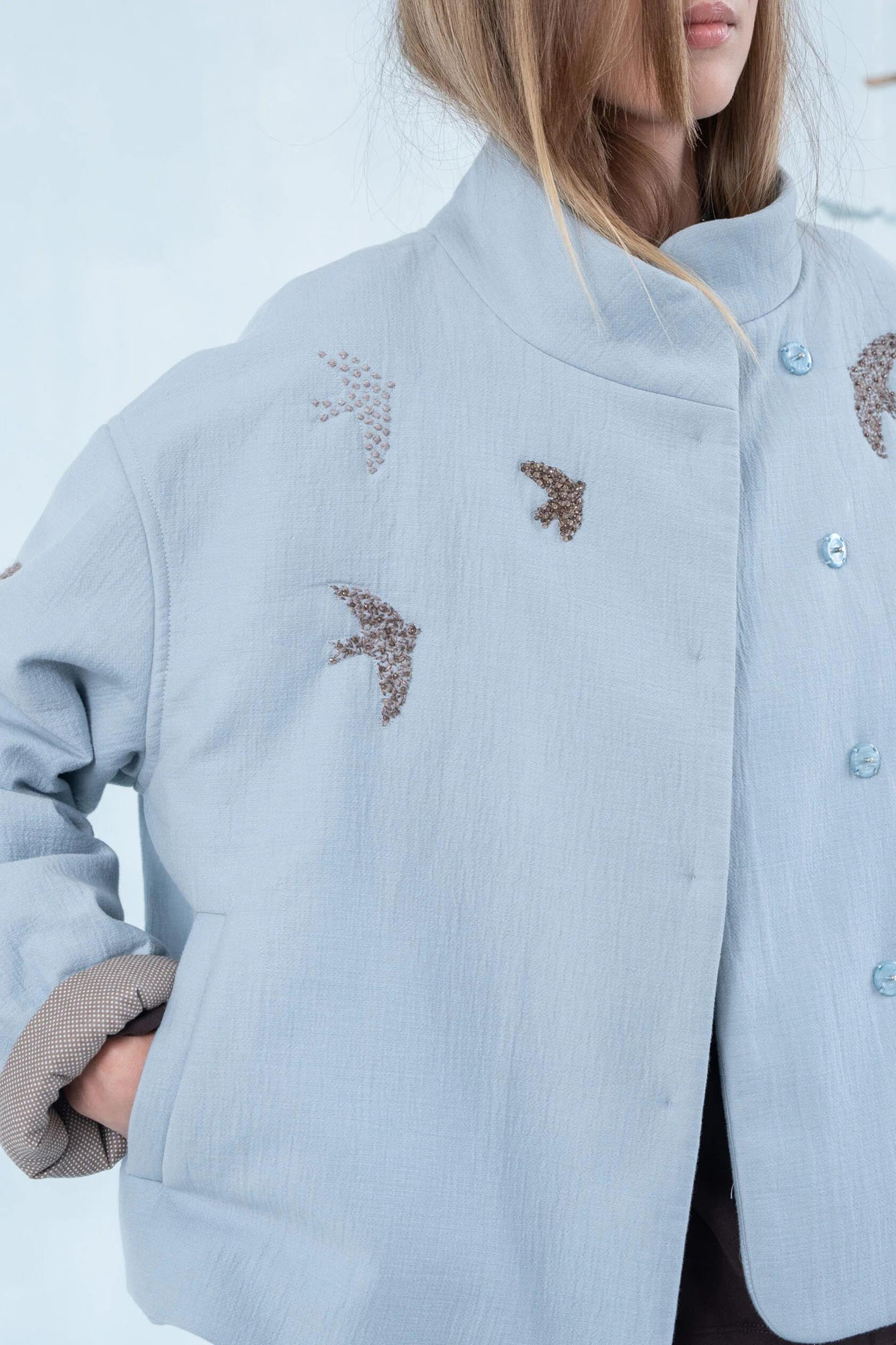 100% хит! Легкая утепленная хлопковая курточка с очень красивой вышивкой шерстяной нитью. Вышивка выполнена вручную. Модель свободного кроя, рукав длинный со спущенной линией плеча, застежка на кнопки.