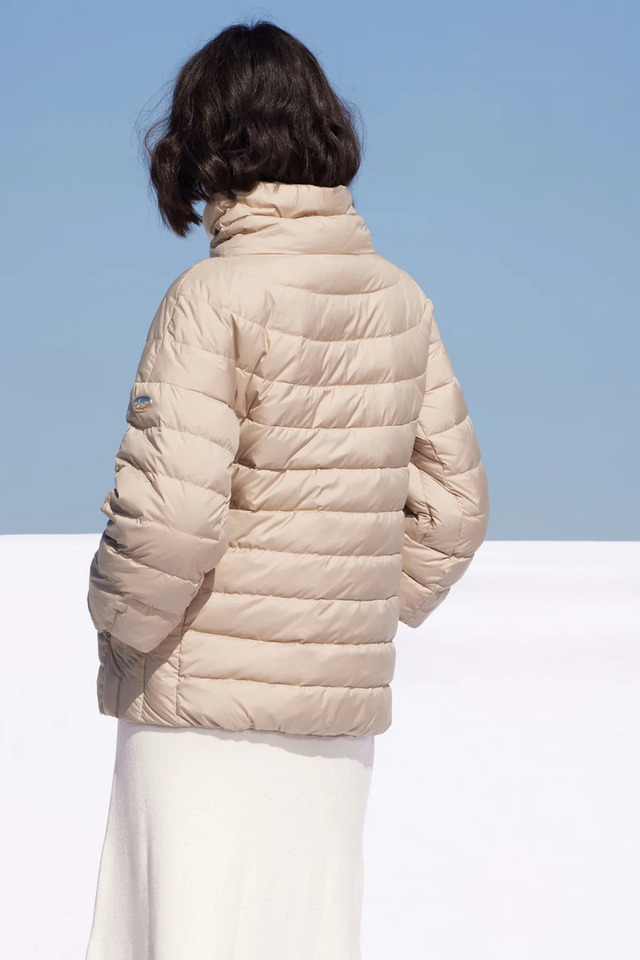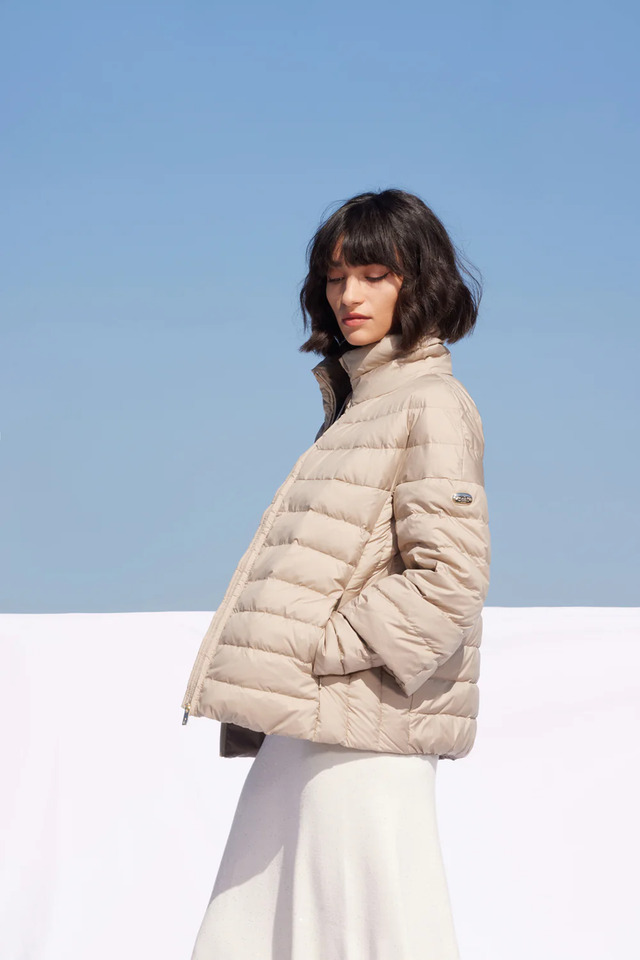 Куртка-пуховик прямого кроя: воротник - стойка, застежка - молния, два боковых кармана, на левом рукаве – фирменная металлическая эмблема «MADZERINI», утеплитель - 90% пух, 10% перо.