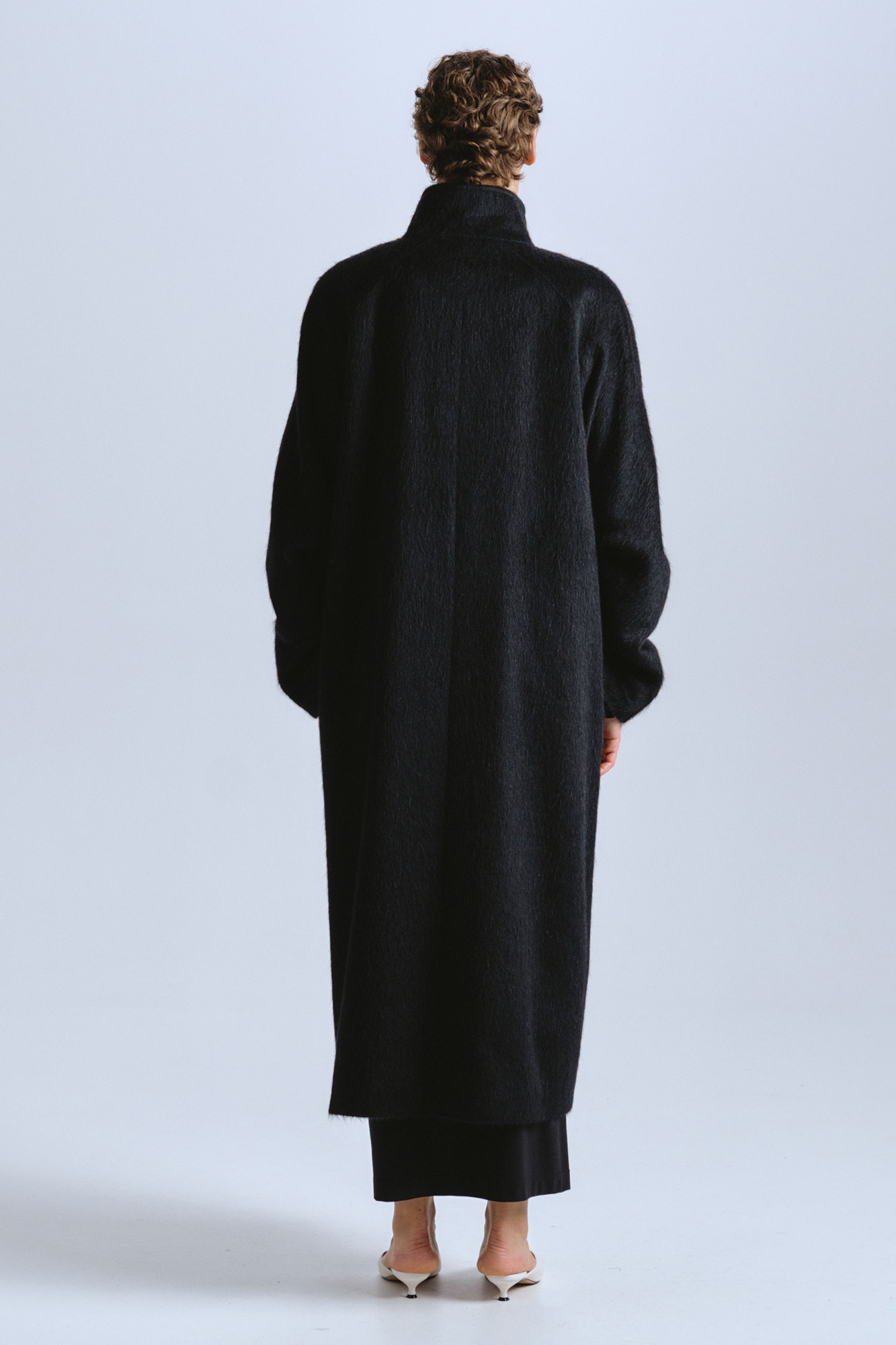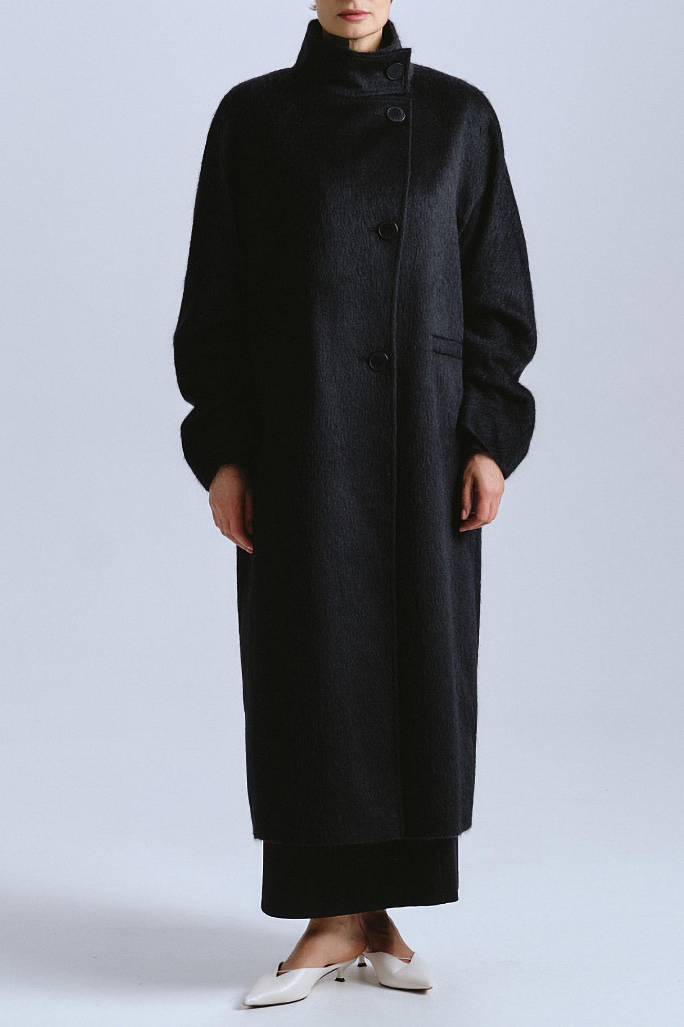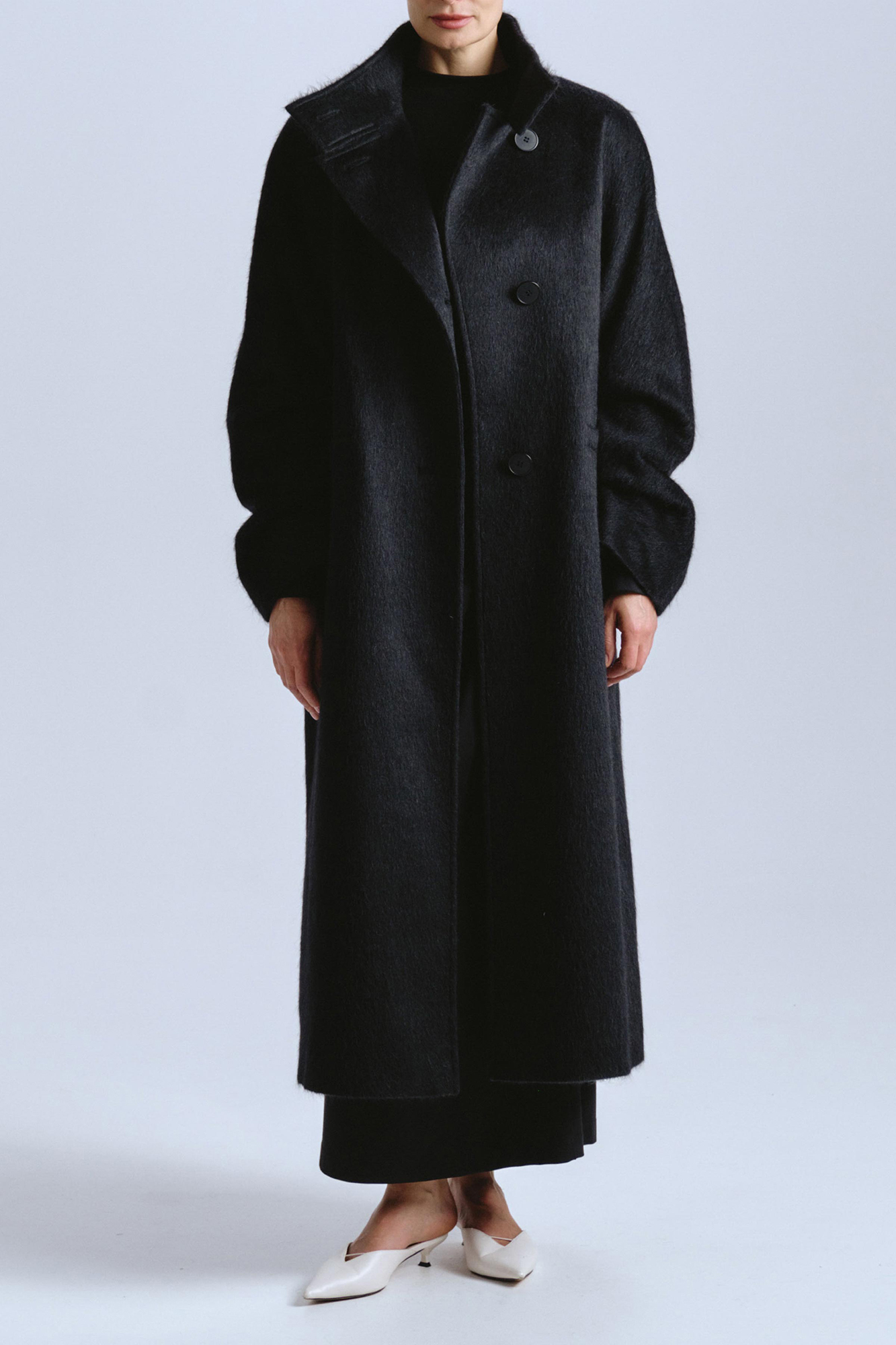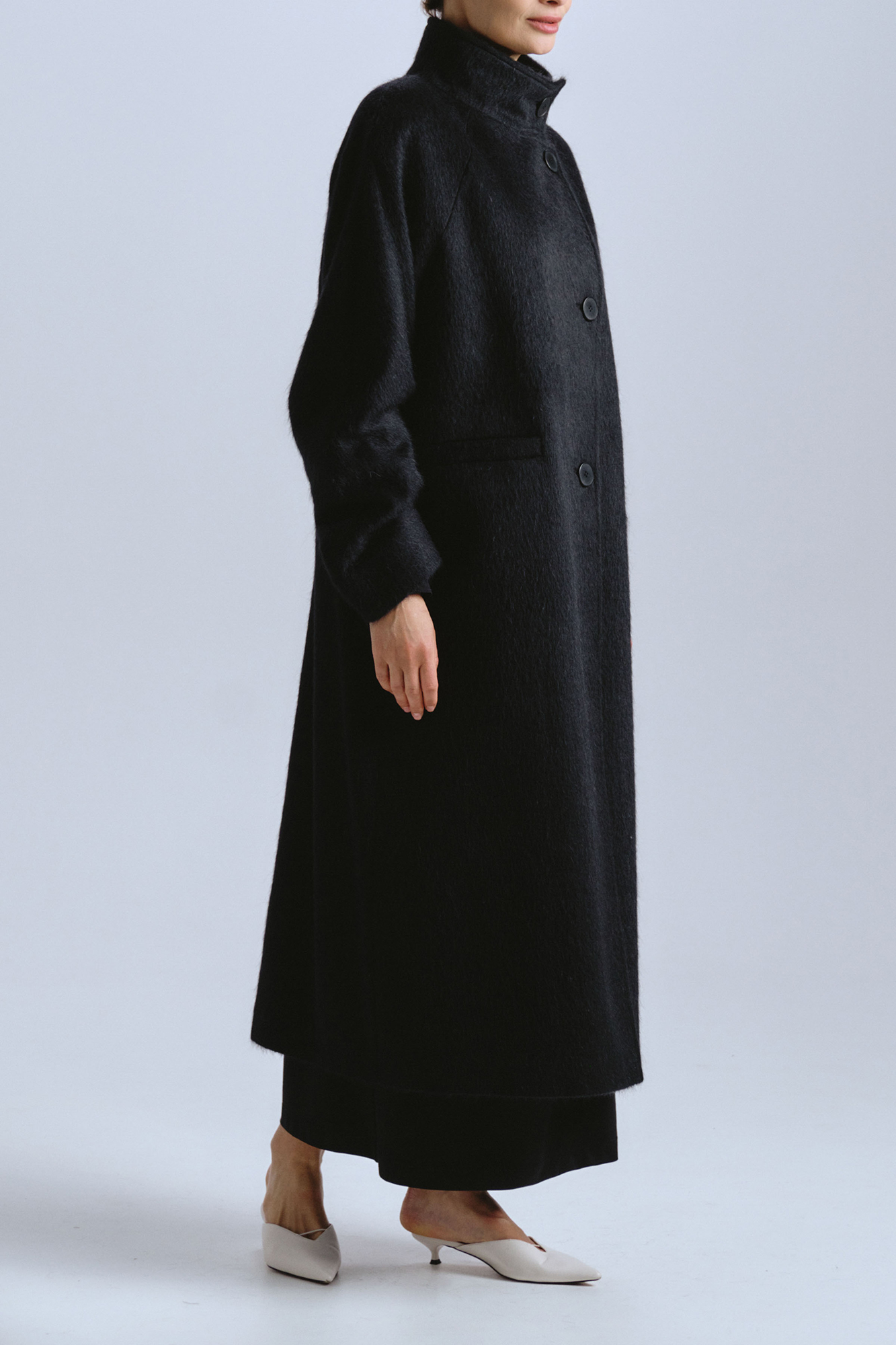 Пальто черного цвета прямого свободного силуэта с воротом стойкой, застёгивающееся на пуговицы — это образец строгого и минималистичного стиля. Рукав реглан — это настоящее искусство, созданное для тех, кто ценит свободу движений и элегантность. Защипы на внутренней стороне рукава — ещё один акцентный элемент, который добавляет модели особый шарм и делает её поистине уникальной. Пальто на подкладке.