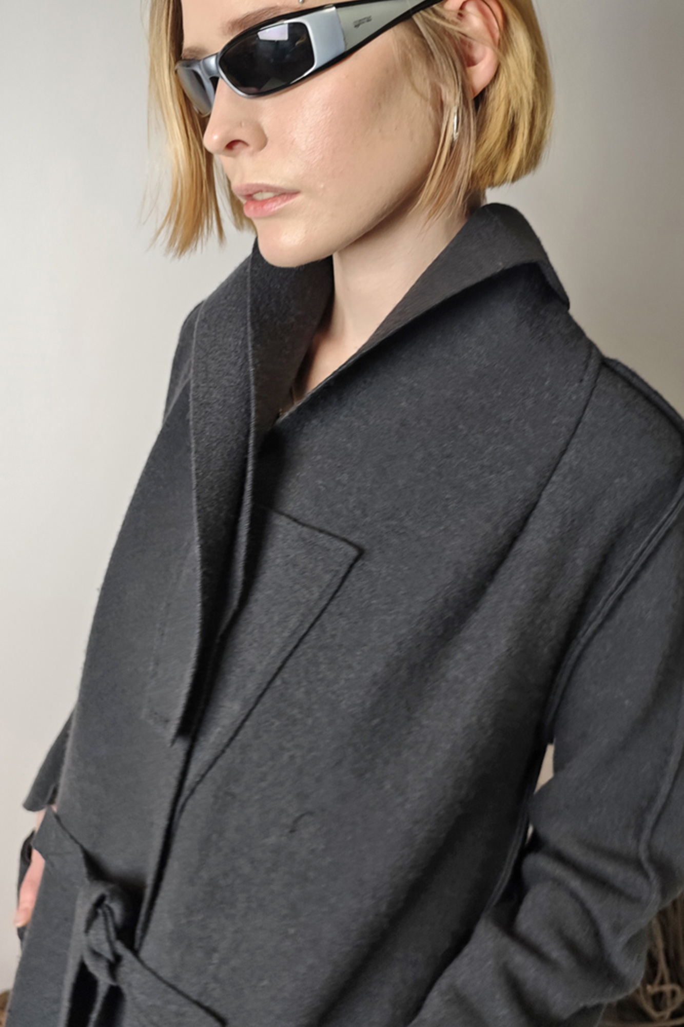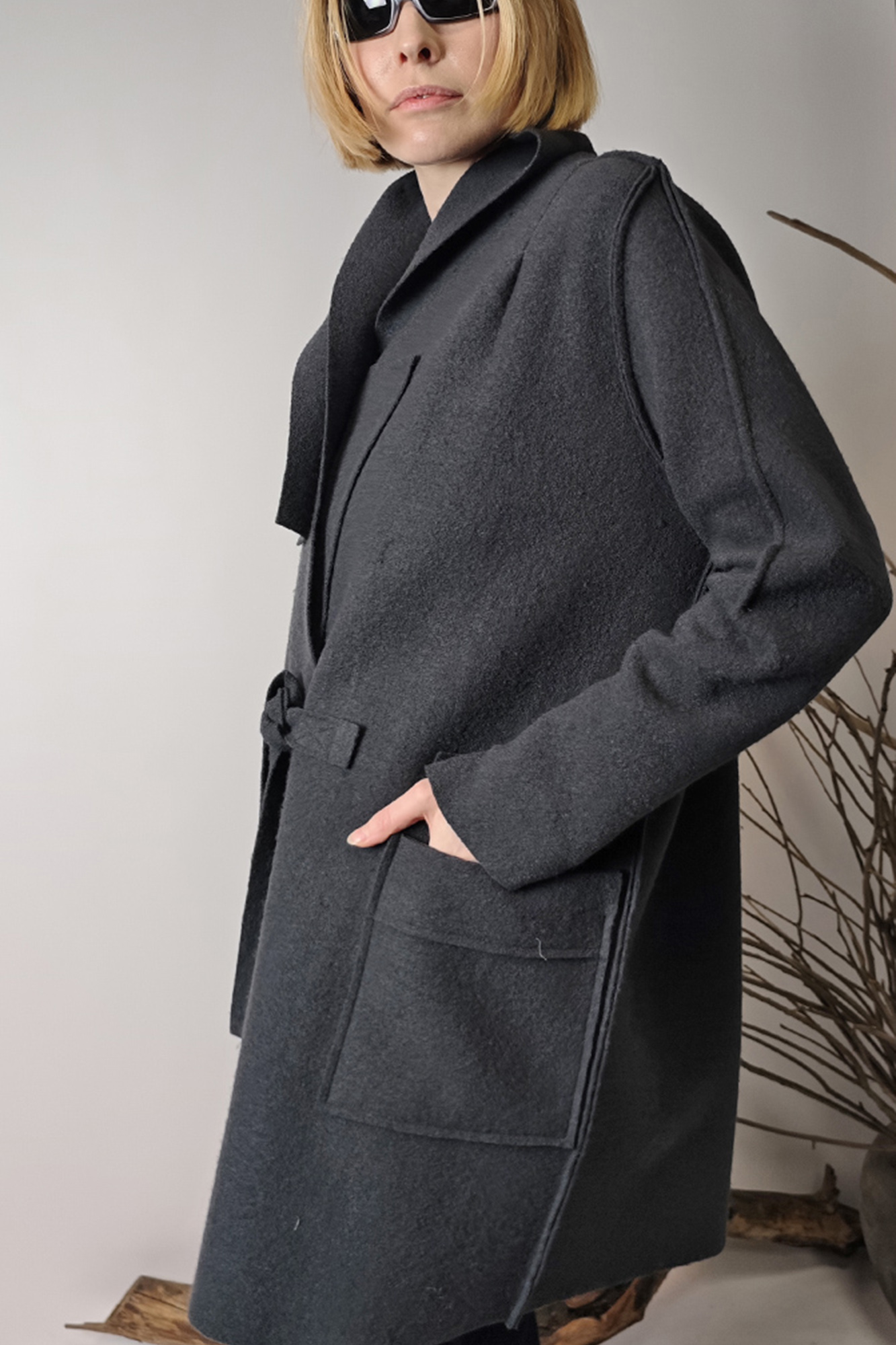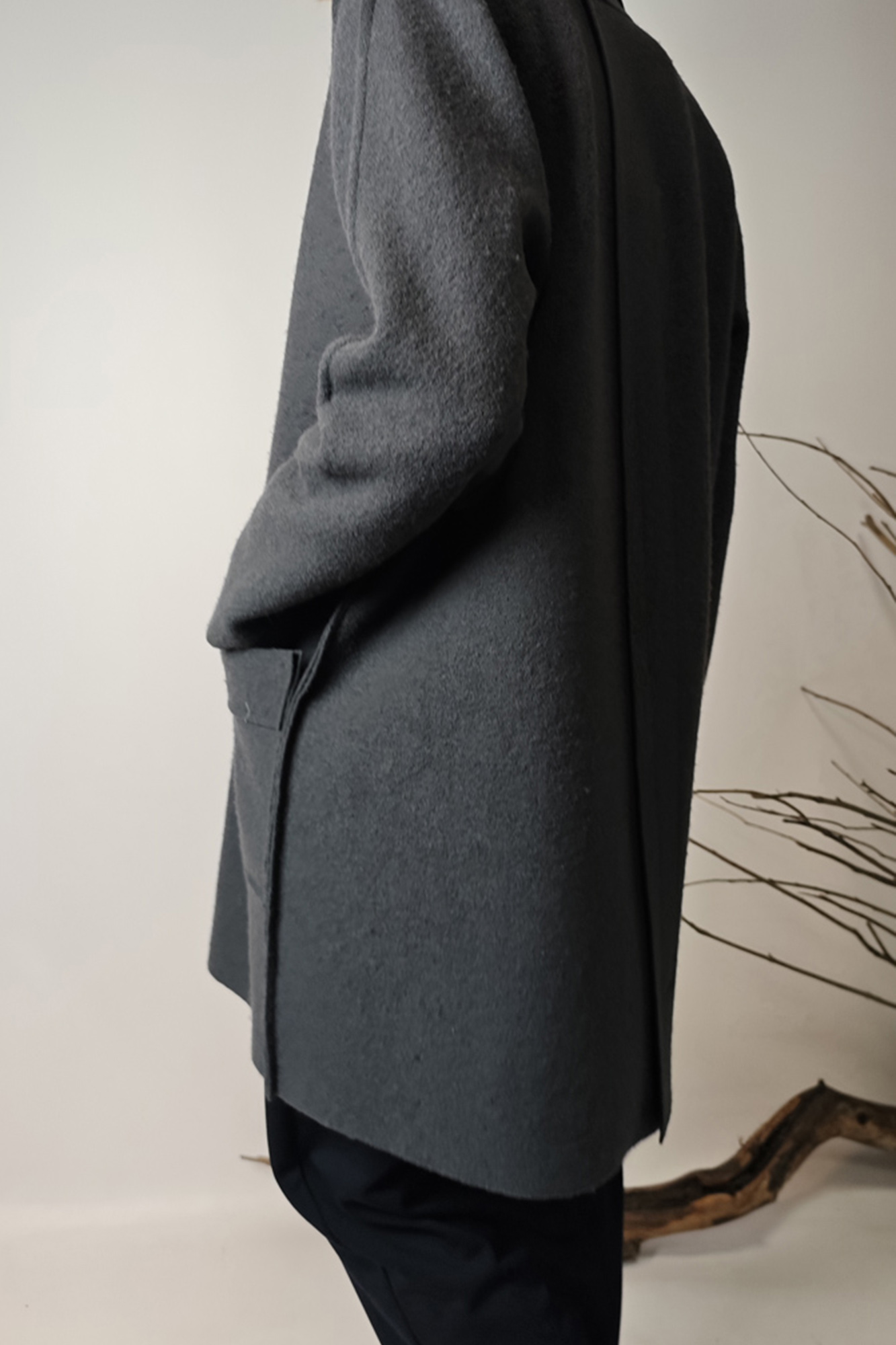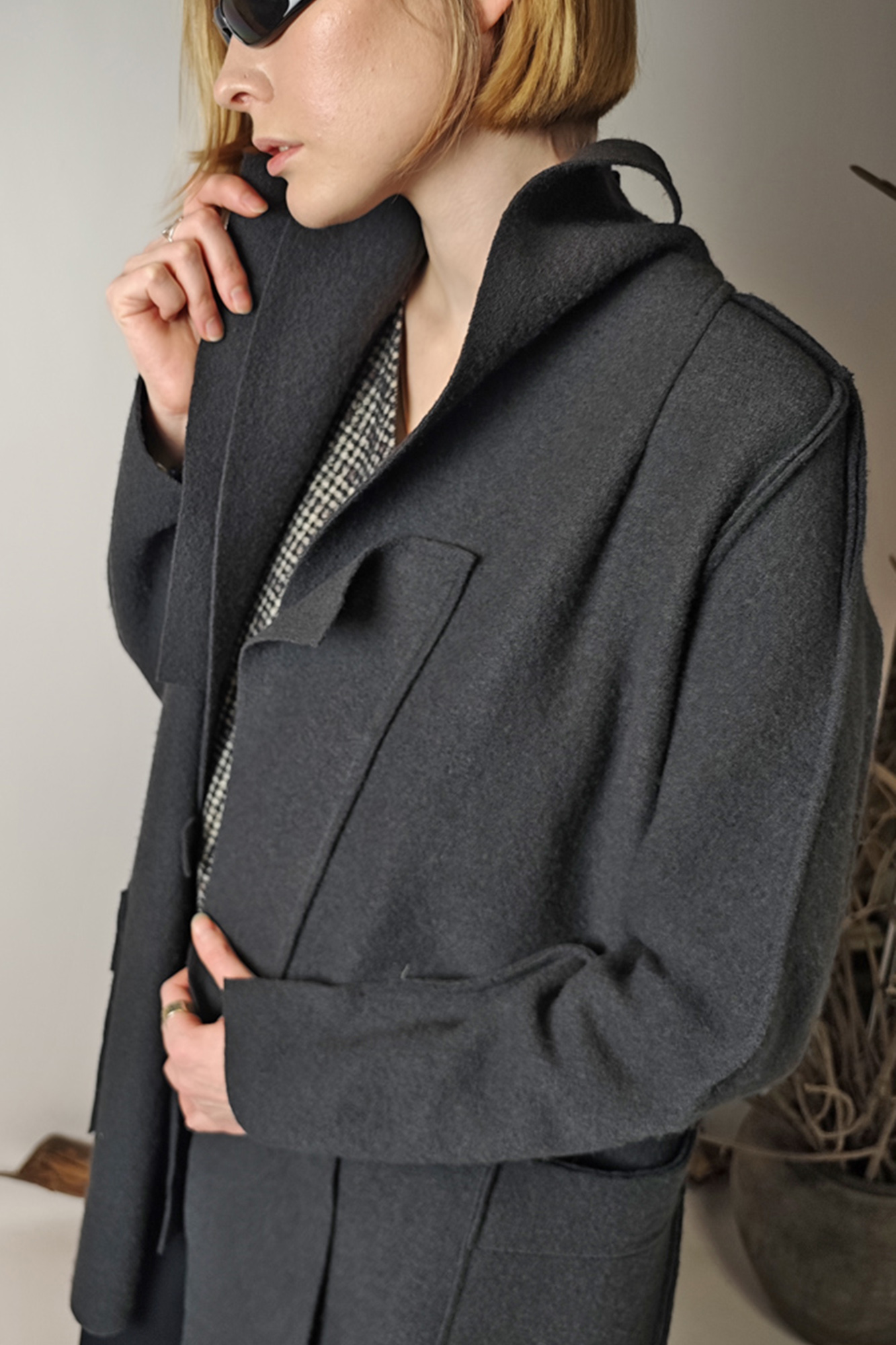 Платье-трансформер из ткани с крэш-эффектом(небольшая мятость). По линии бедра можно отстегнуть юбку и платье правратится в полноценный жакет с накладными карманами снизу на передней полочке. У жакета по боковым швам небольшие разрезы. Неглубокий V-образный вырез горловины с пристроченным воротничком, ровно ложащимся на линии груди. Юбка при присоединении к жакету спреди собрана в три мягких складкм.