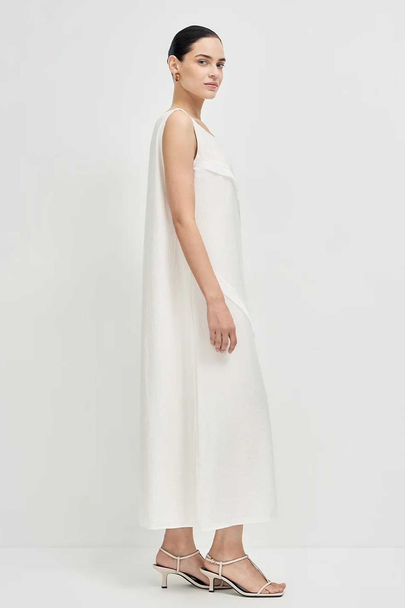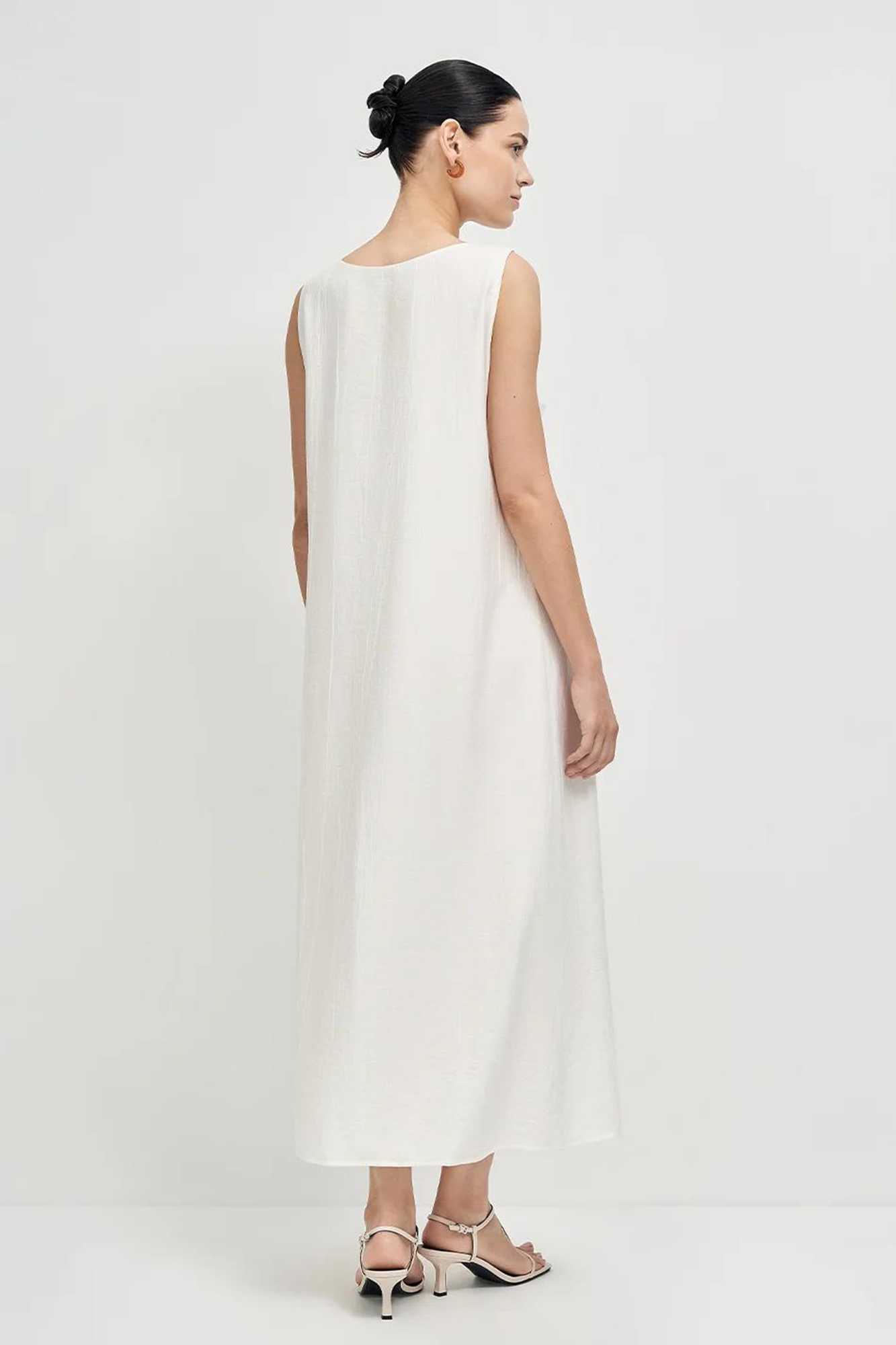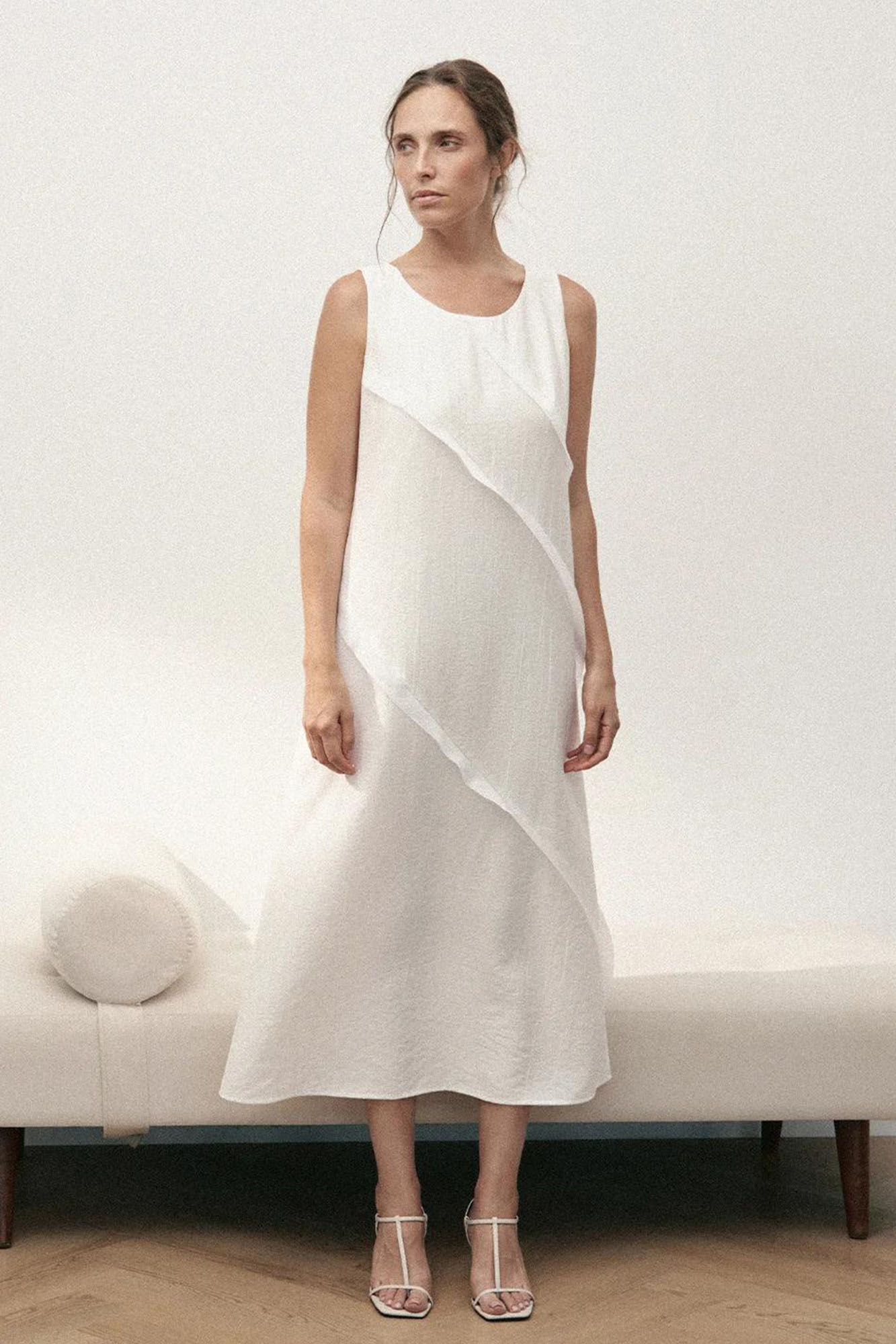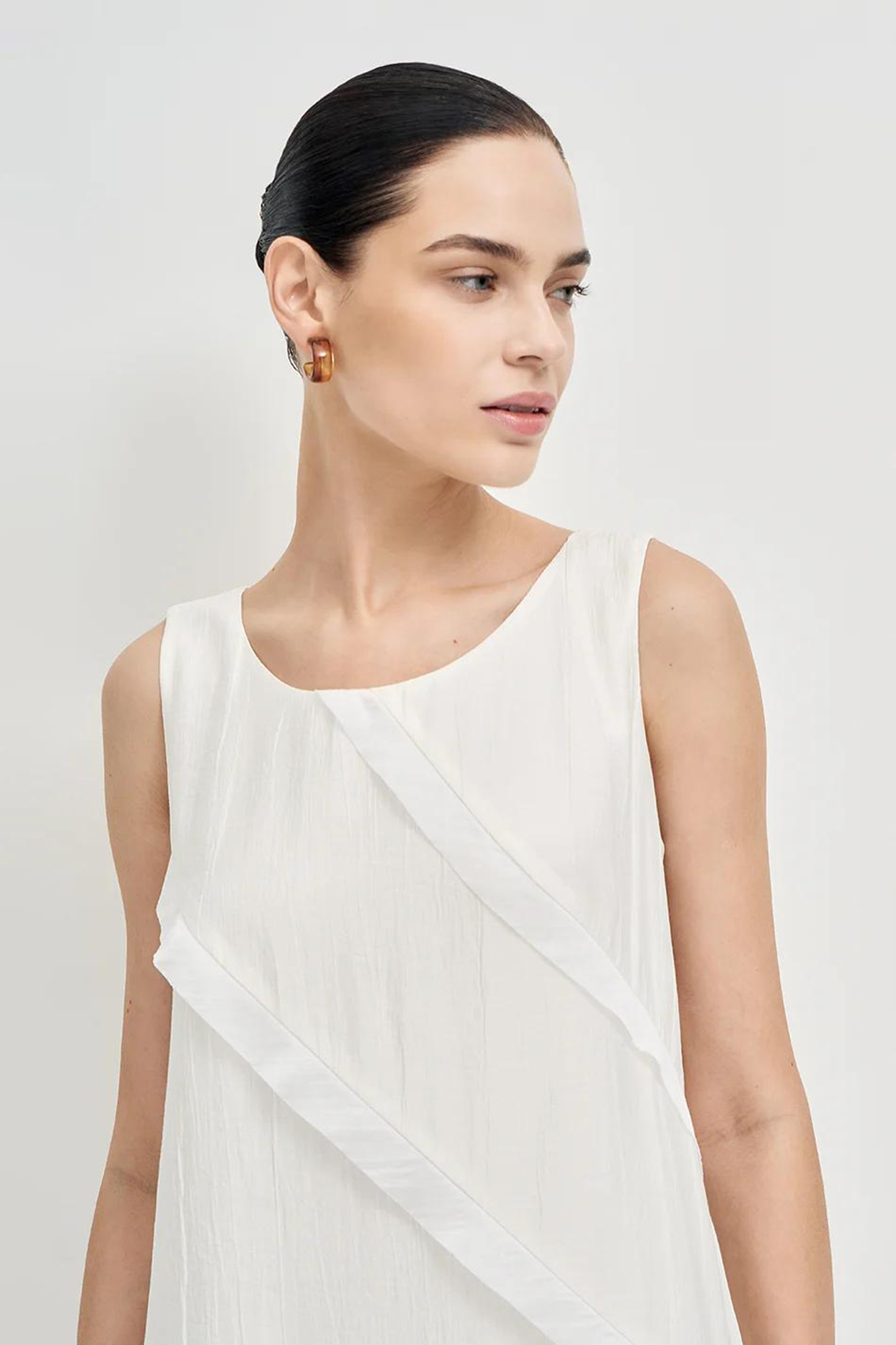 Платье А-образного силуэта длины миди без рукавов с отделочными деталями, расположенными по диагоналям передней половины, выполненными из батистовой тесьмы с необработанным косым срезом.