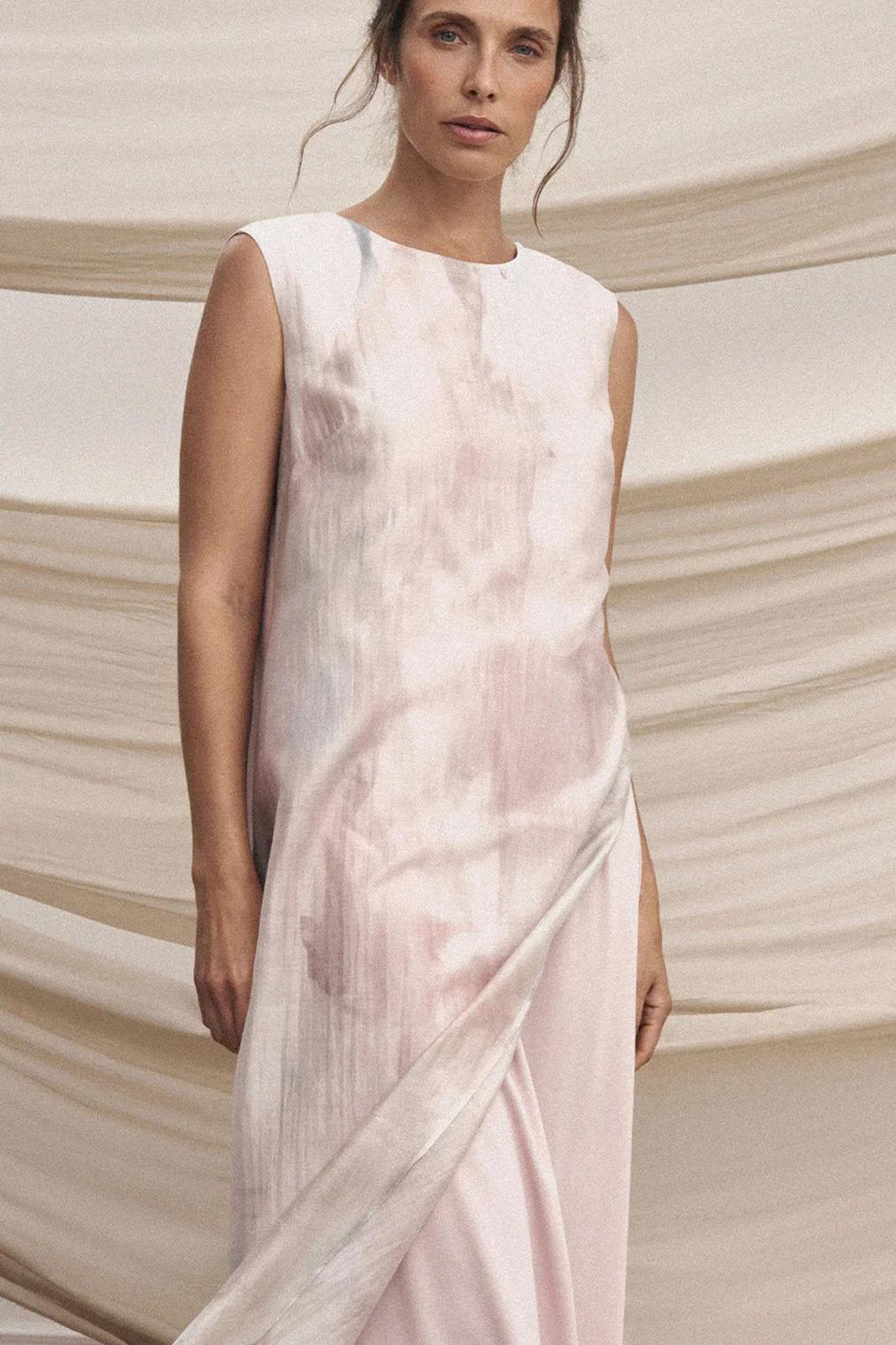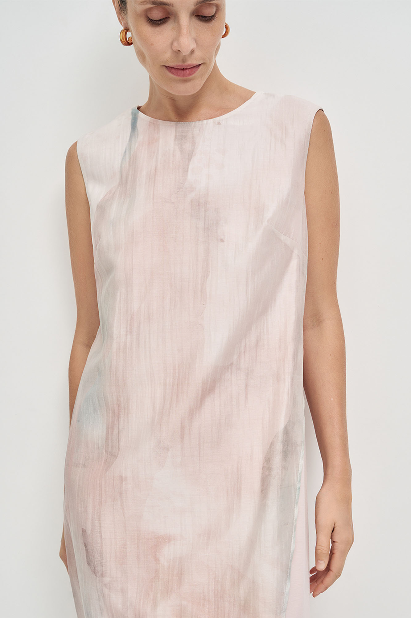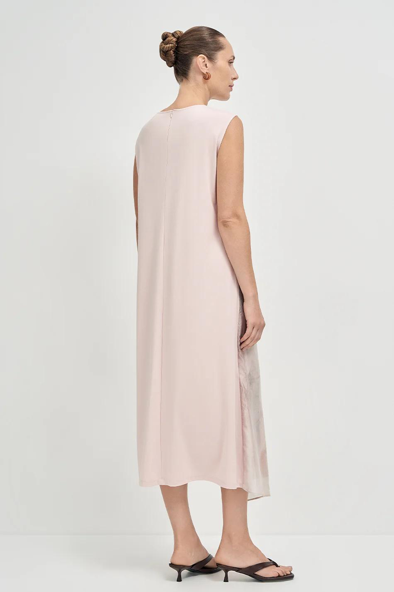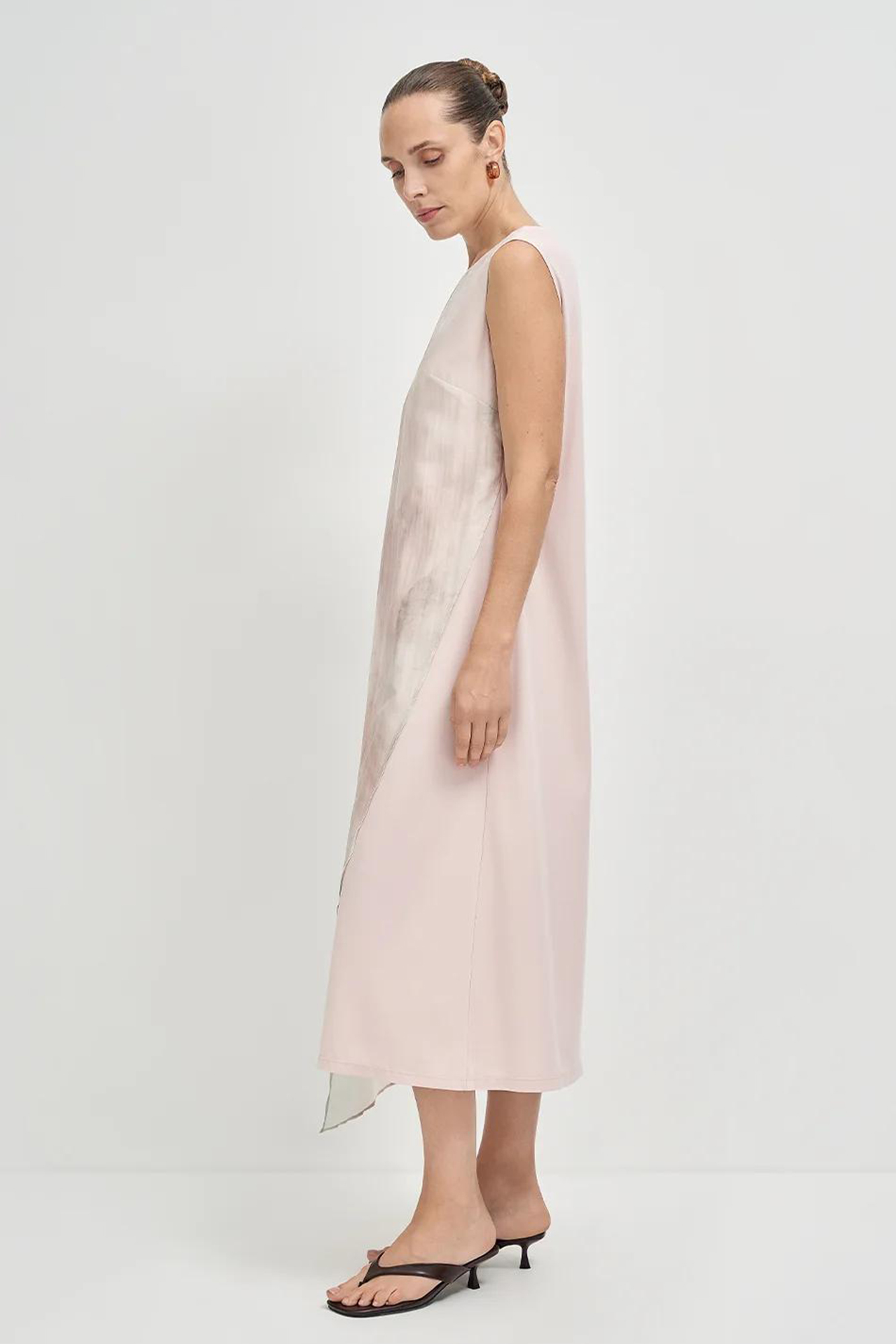 Платье А-образного силуэта без рукавов из вискозного трикотажного полотна с отлетной деталью из тонкой полупрозрачной ткани с авторским принтом.
