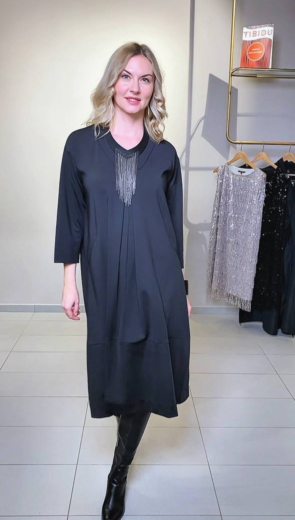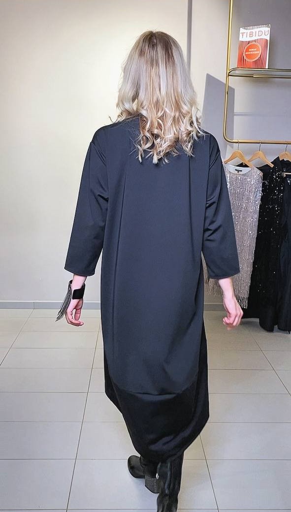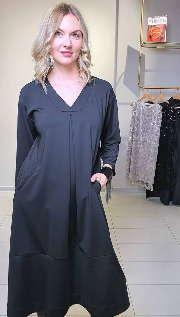 Платье оригинального кроя черного цвета бренда Camille Cassard: V-образный вырез горловины, прорезные карманы, А-силуэт. Украшение не входит в комплект.