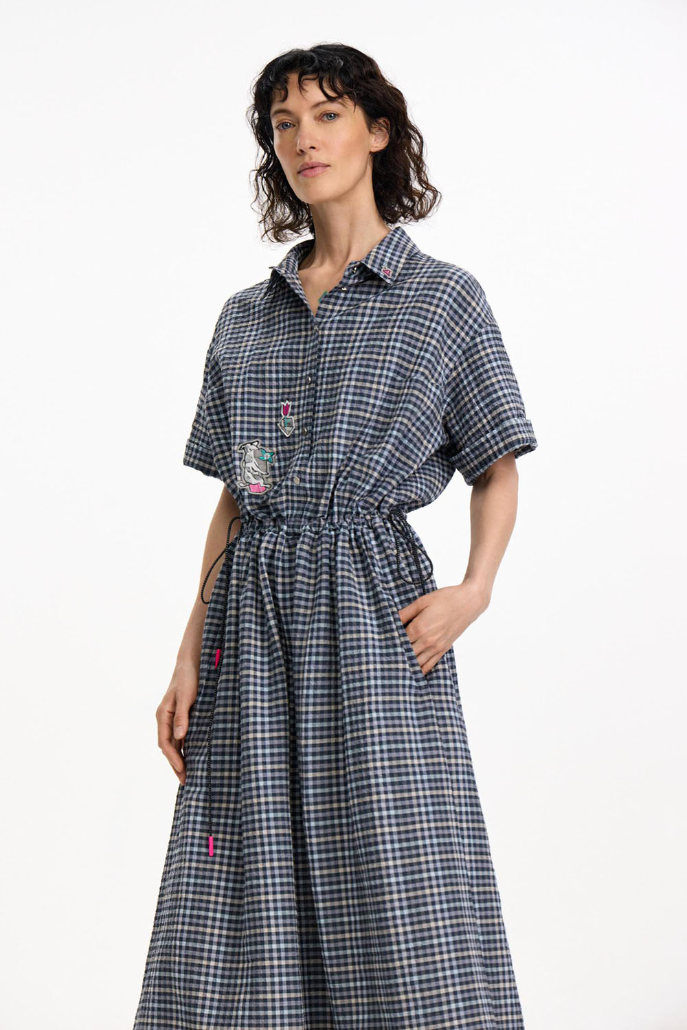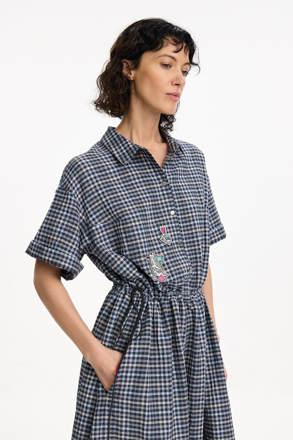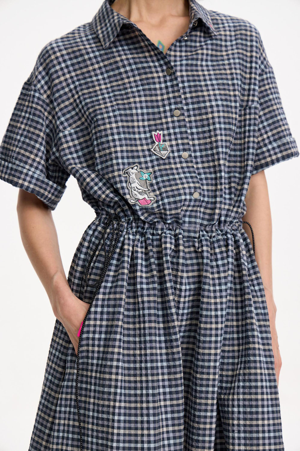 Платье-рубашка из невесомого крэш-хлопка с кулиской на талии и карманами в боковых швах. Ткань с легким мятым эффектом очень мягкая и комфортная в ношении. Мы разнообразили принт в клетку яркими нашивками и кулиской на талии для женственного силуэта.