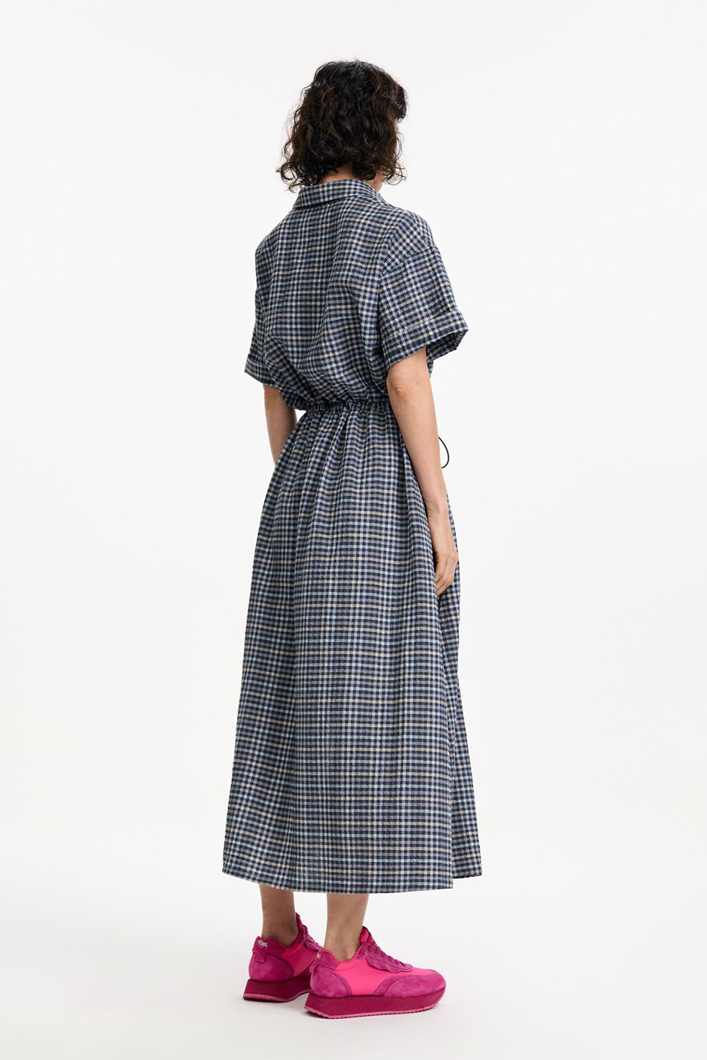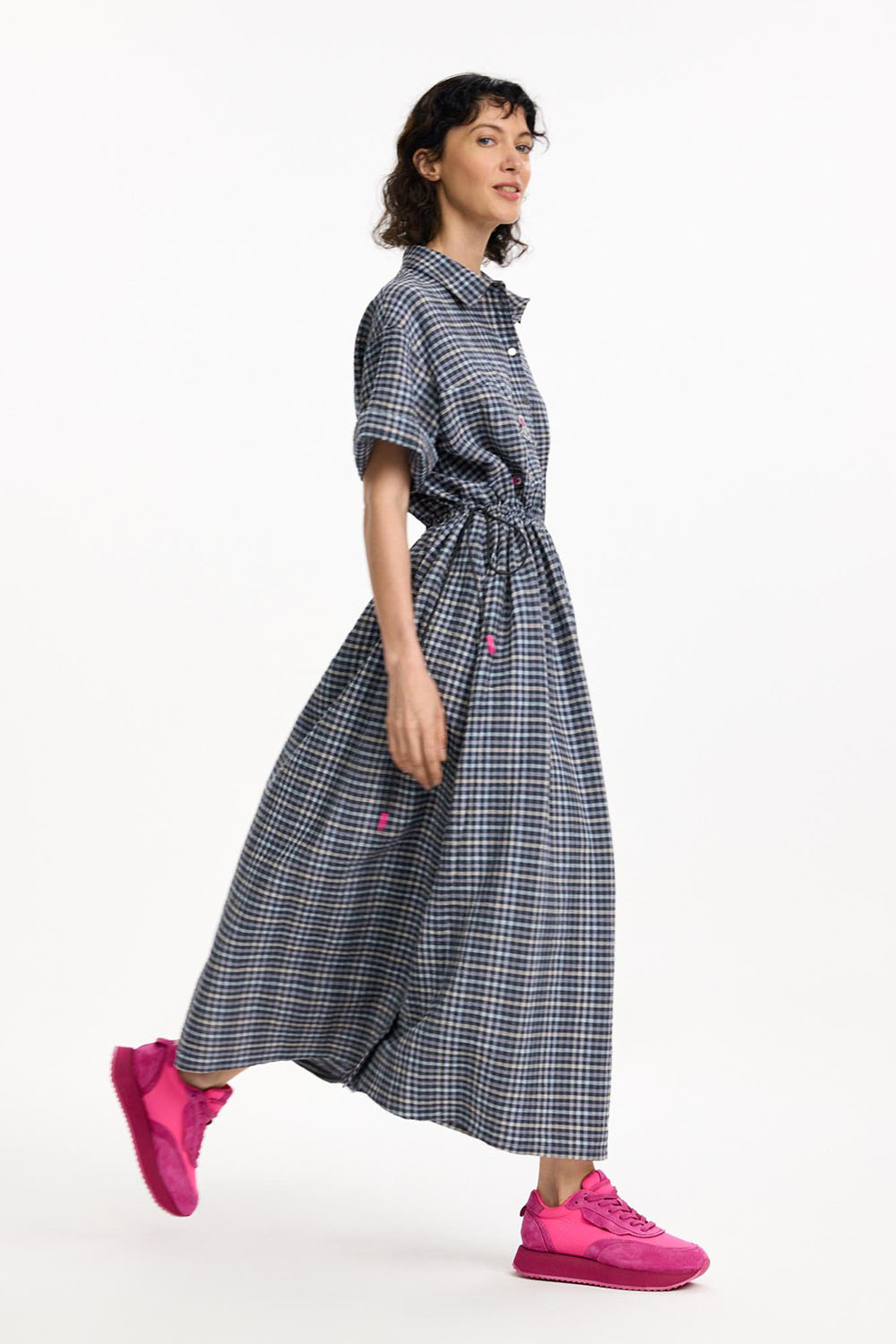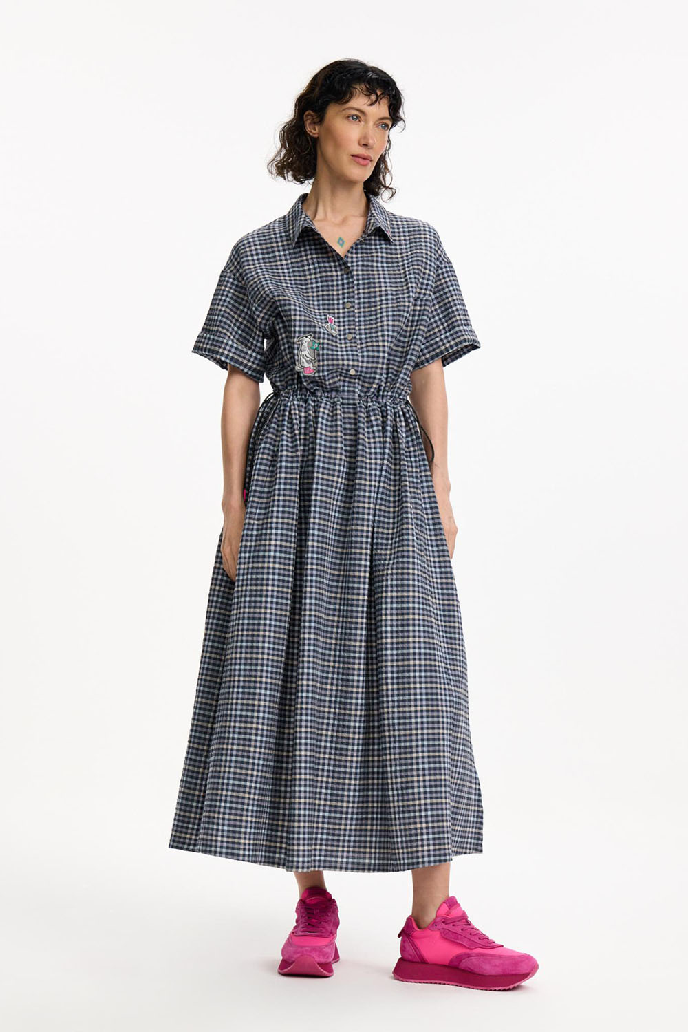 Платье-рубашка из невесомого крэш-хлопка с кулиской на талии и карманами в боковых швах. Ткань с легким мятым эффектом очень мягкая и комфортная в ношении. Мы разнообразили принт в клетку яркими нашивками и кулиской на талии для женственного силуэта.