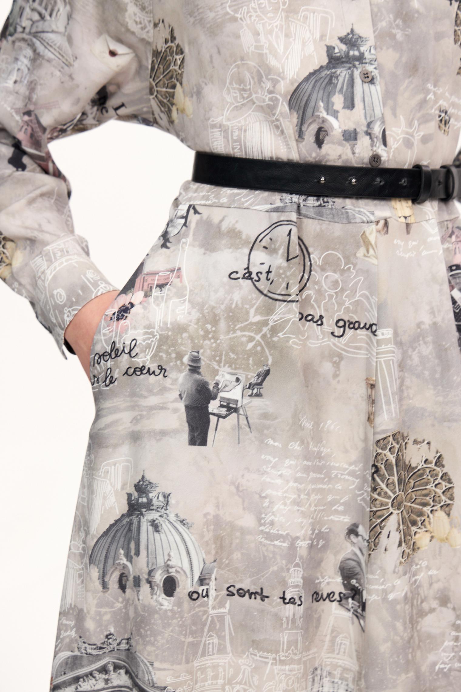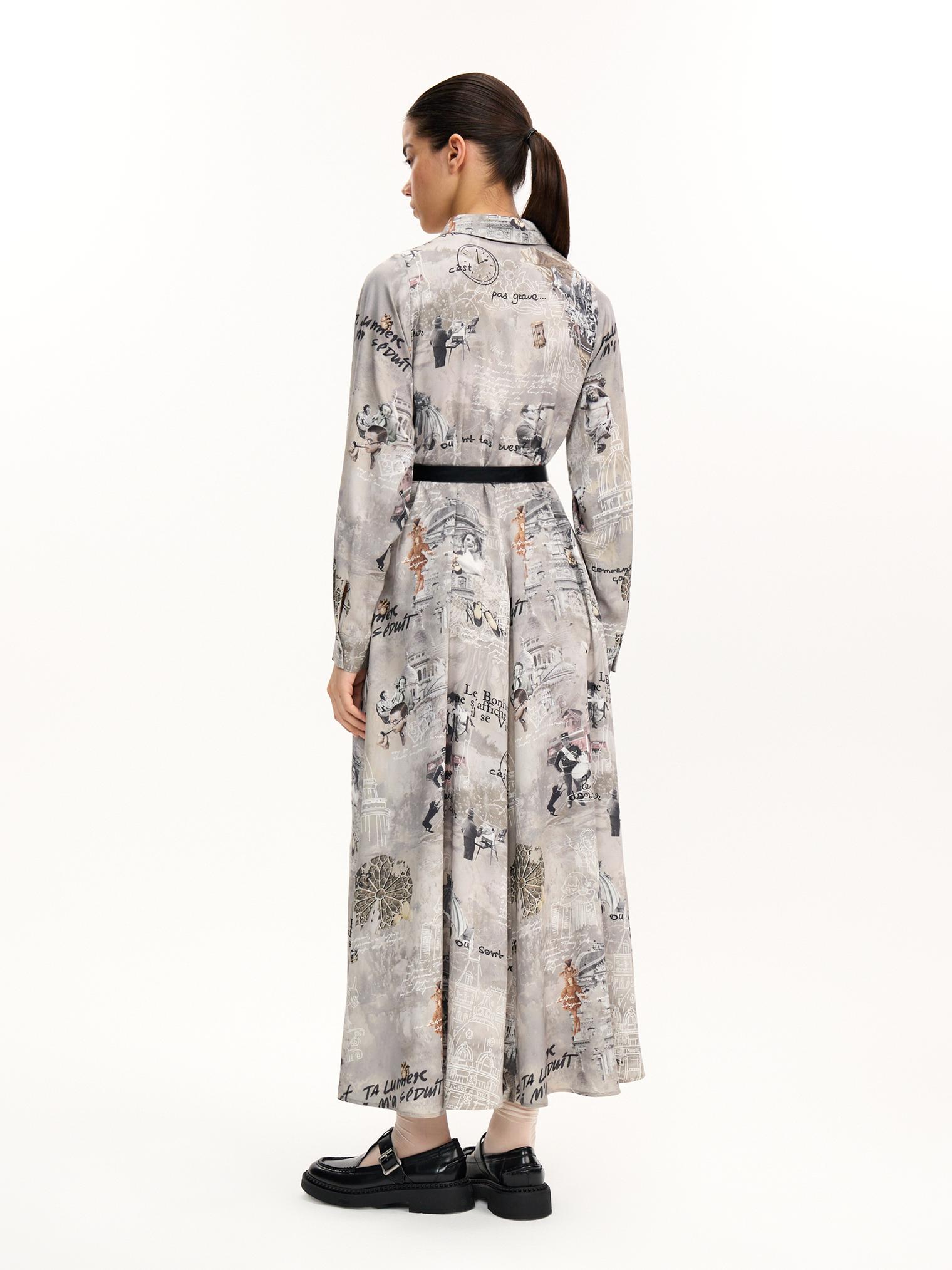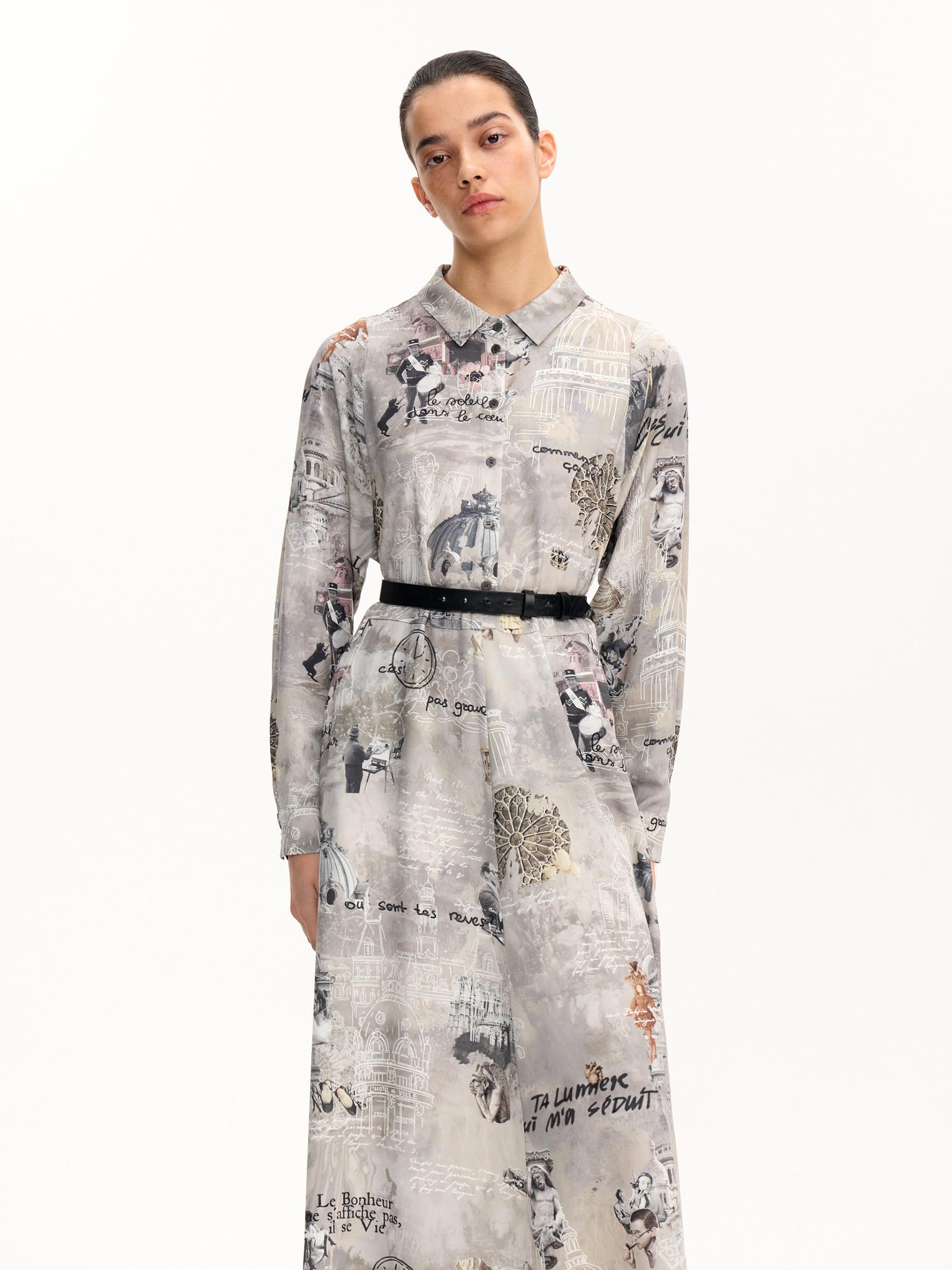 Paris mon amour. Новая модель платья-рубашки украшена принтом-воспоминанием о городе любви - Париже. Рубашечный крой верха сочетается со свободной юбкой с красивым разведением снизу. Ремень в комплекте акцентирует талию. Каждый экземпляр этой вещи уникален - расположение рисунка может отличаться от того, что Вы видите на фотографиях.