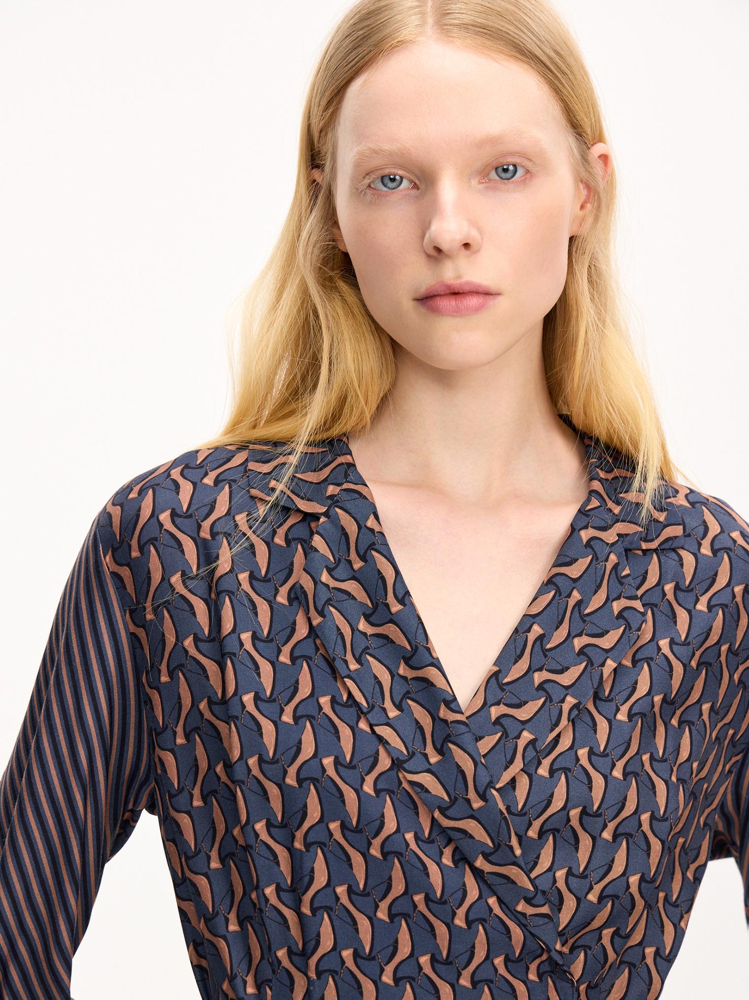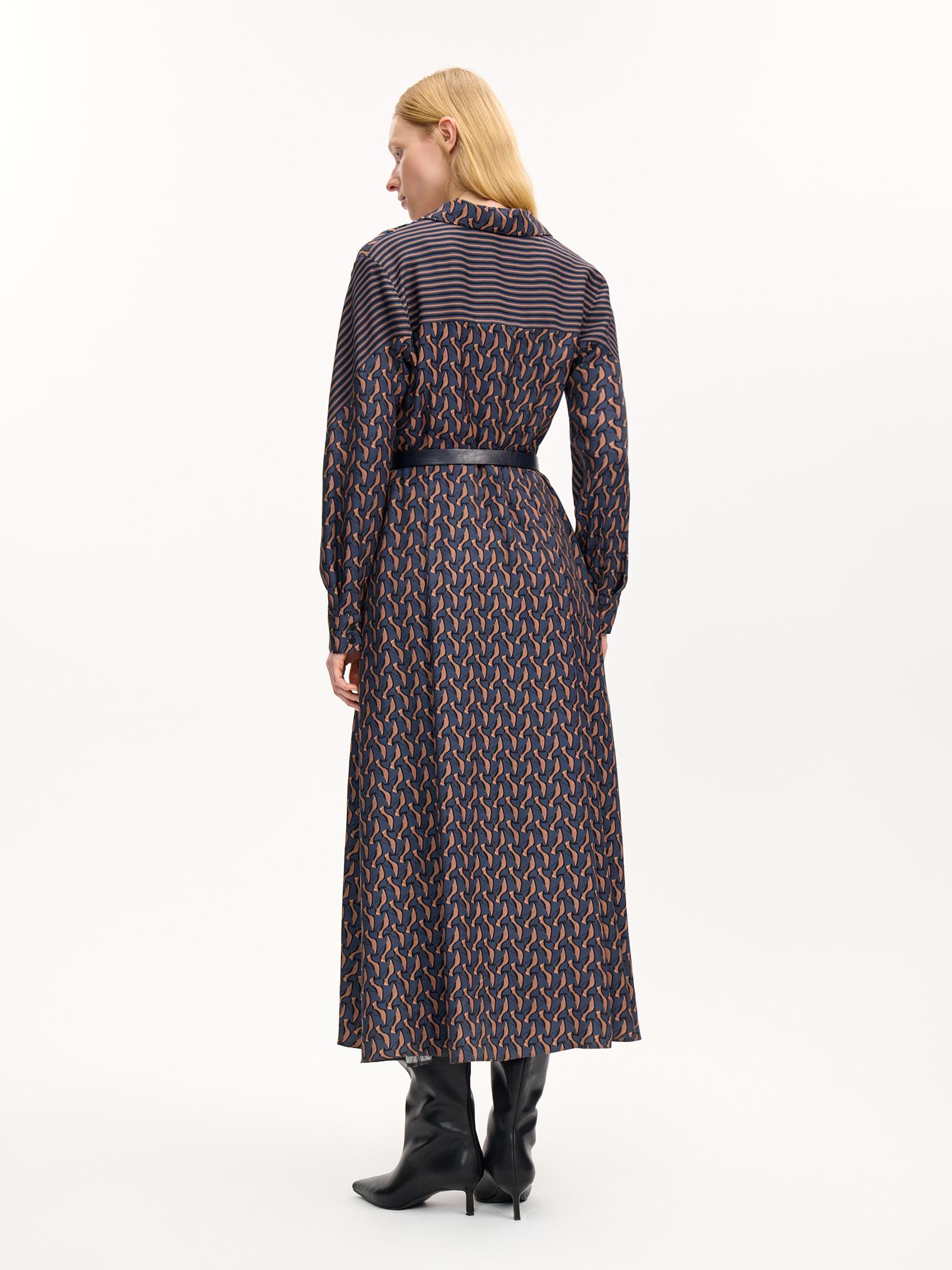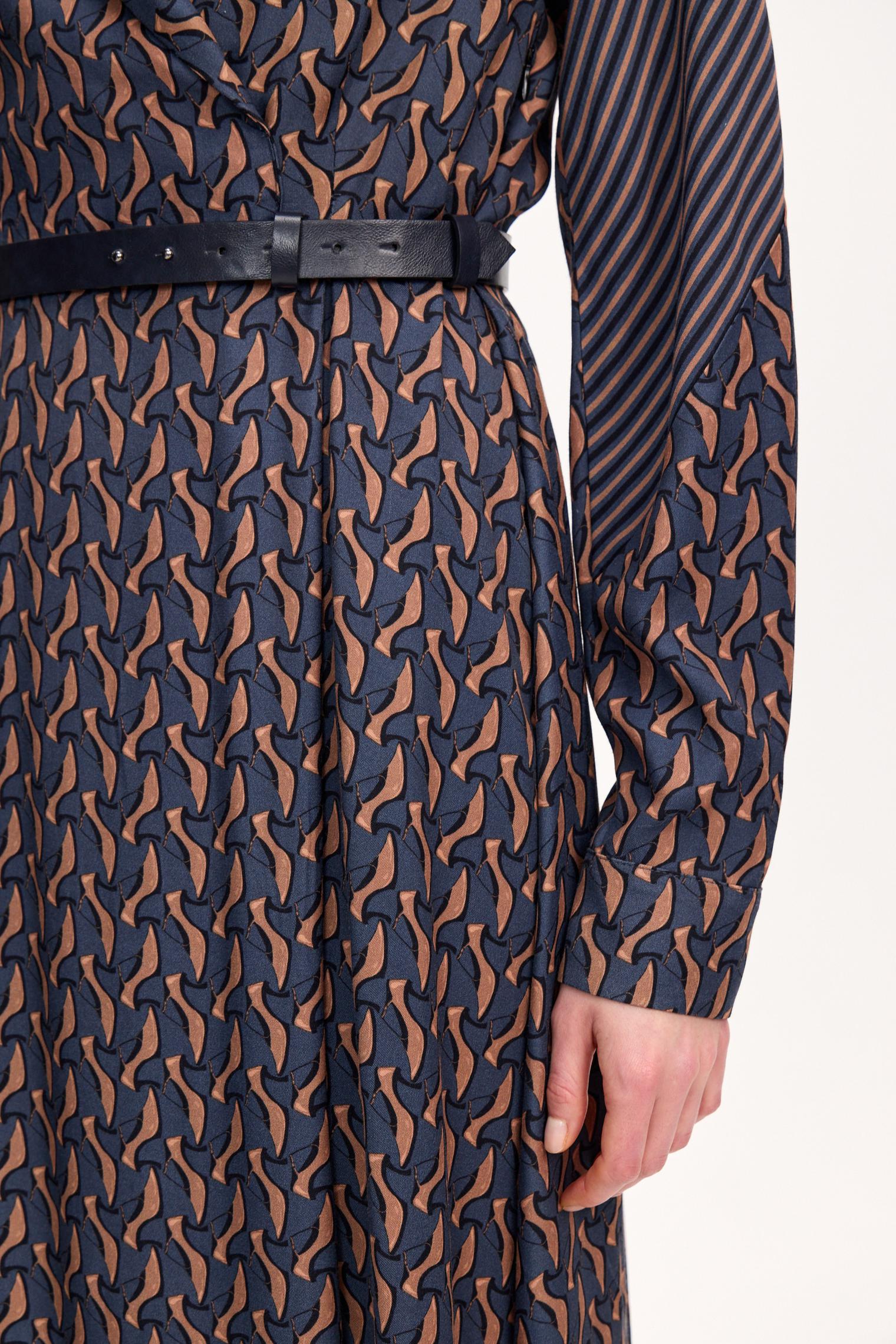Женственное платье из шелковистой вискозы с оригинальным принтом: присмотритесь и вы увидите множество миниатюрных туфелек. Тонкая полоска на рукавах и спинке разбавляет орнамент. Рубашечный воротник и контрастный ремешок на талии придают образу изящество и ретро-настроение. В комплекте ремень из натуральной кожи.
