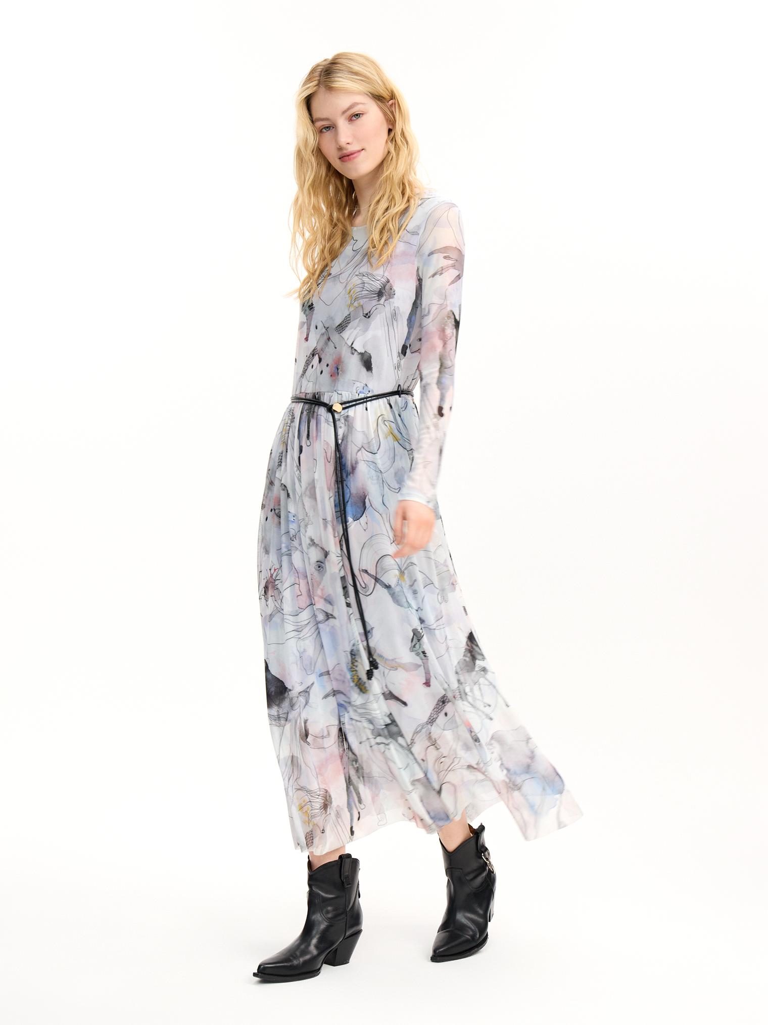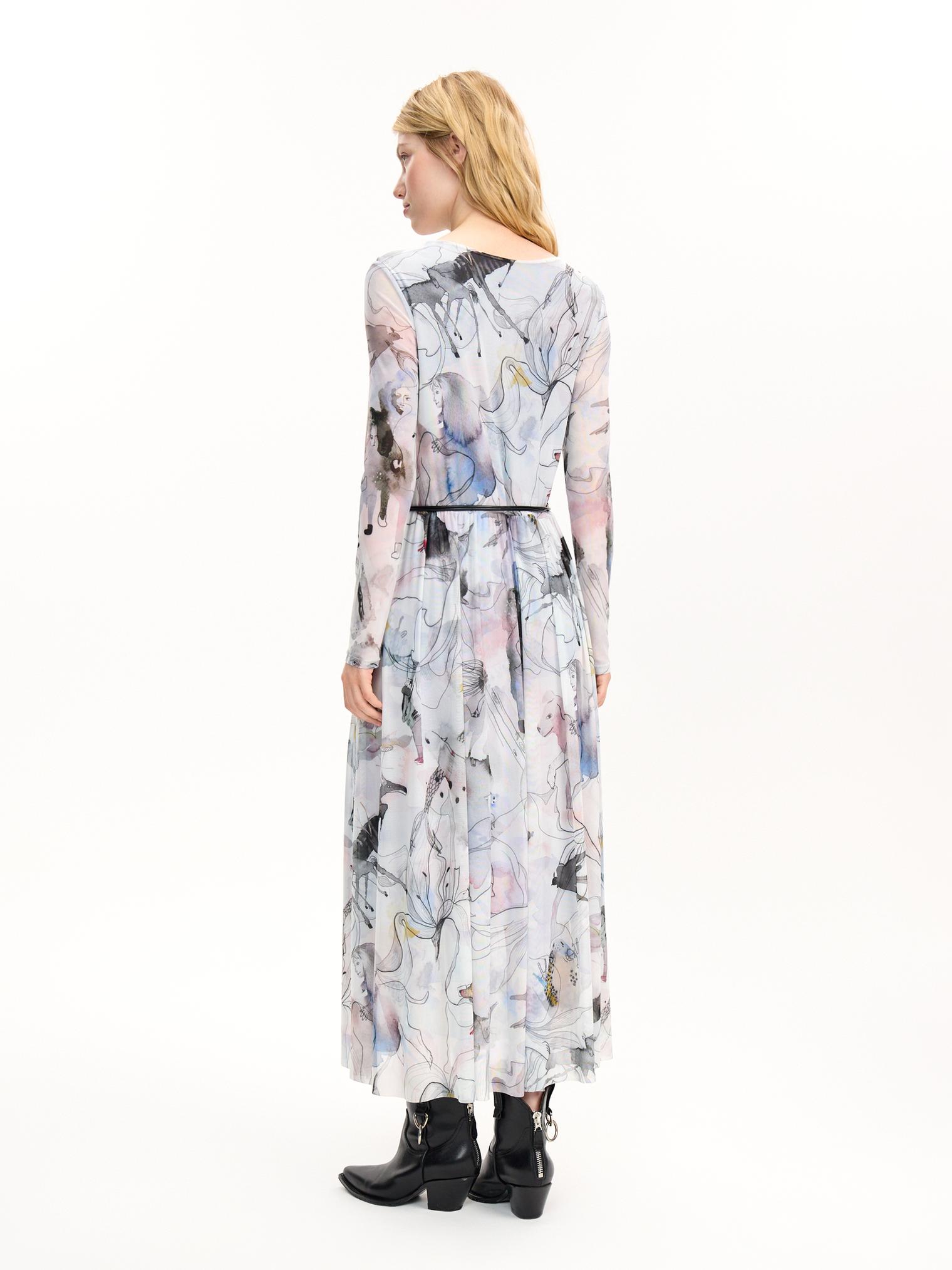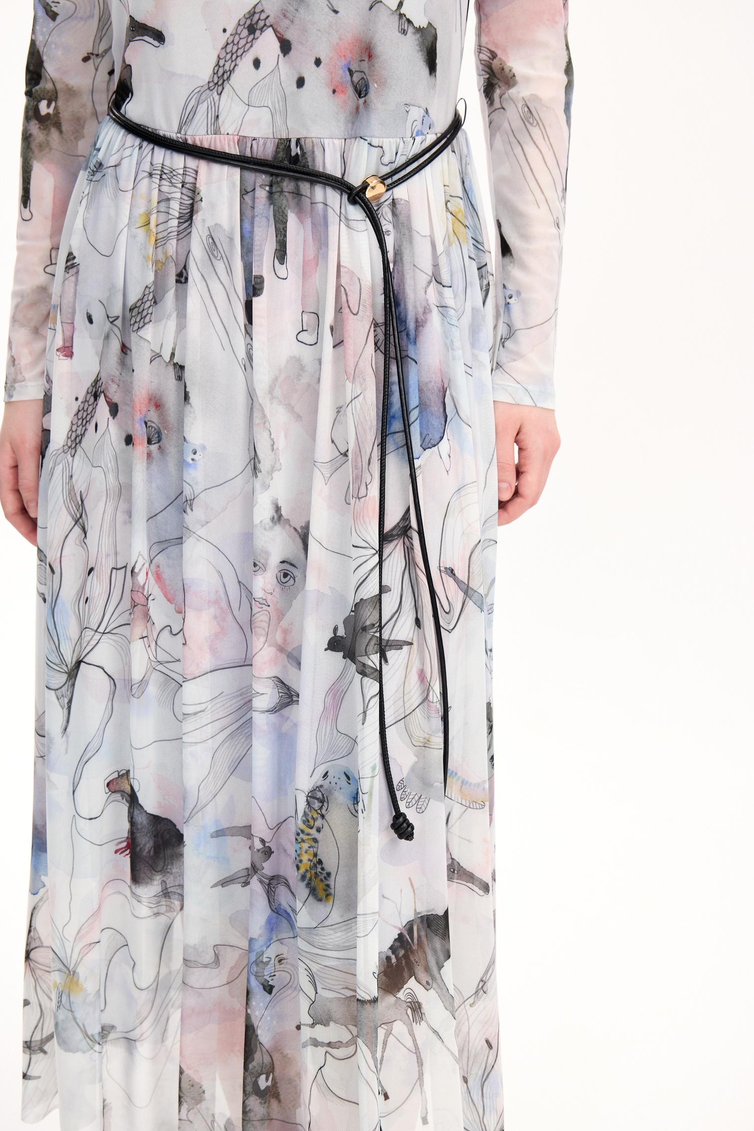 Женственное платье из легкой, воздушной ткани. Изделие из сетки стрейч с облегающим верхом и струящимся низом украшено красивым акварельным принтом, вдохновленным сказками Андерсена. Принт создавался вручную: каждая акварельная капля или пятно рождала персонажа, после чего дизайнер Маша заботливо дорисовывала графику и каждую деталь принта. Каждый экземпляр этой вещи уникален - расположение рисунка может отличаться от того, что Вы видите на фотографиях.