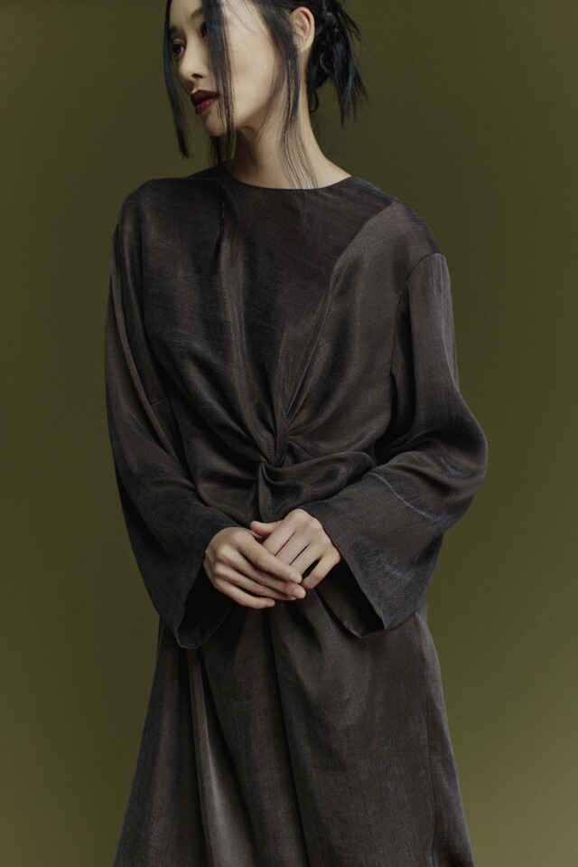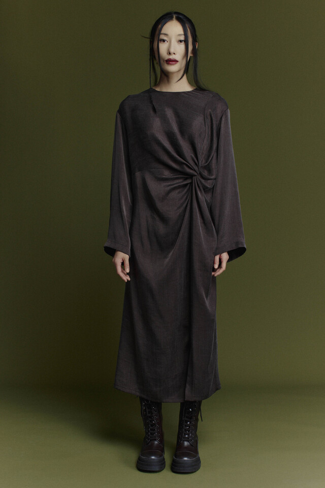 Прямой, но отнюдь не простой силуэт платья длиной миди мягко струится вдоль фигуры. Главный акцент — сложная драпировка на уровне талии, напоминающая изысканный узел. От него вверх и вниз мягко расходятся живописные складки, играющие светом и тенью. Роскошная шелковистая ткань на основе вискозы и лиоцелла переливается полутонами и невероятно приятная к телу. Чуть спущеное плечо добавляет нотку небрежного шарма. Круглый вырез и прямые рукава завершают образ в стиле минимализма.