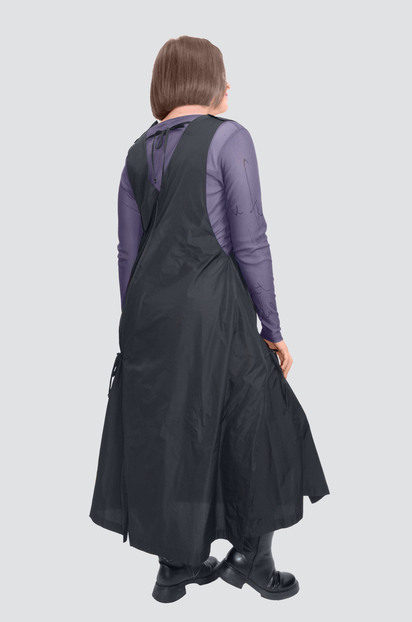 Платье со спущенным рукавом свободного кроя, с застежкой на плечевых швах, накладными карманами. Сспинка разрезная, застегивается на пуговицы, с разрезами в боковых швах, со съемным поясом.