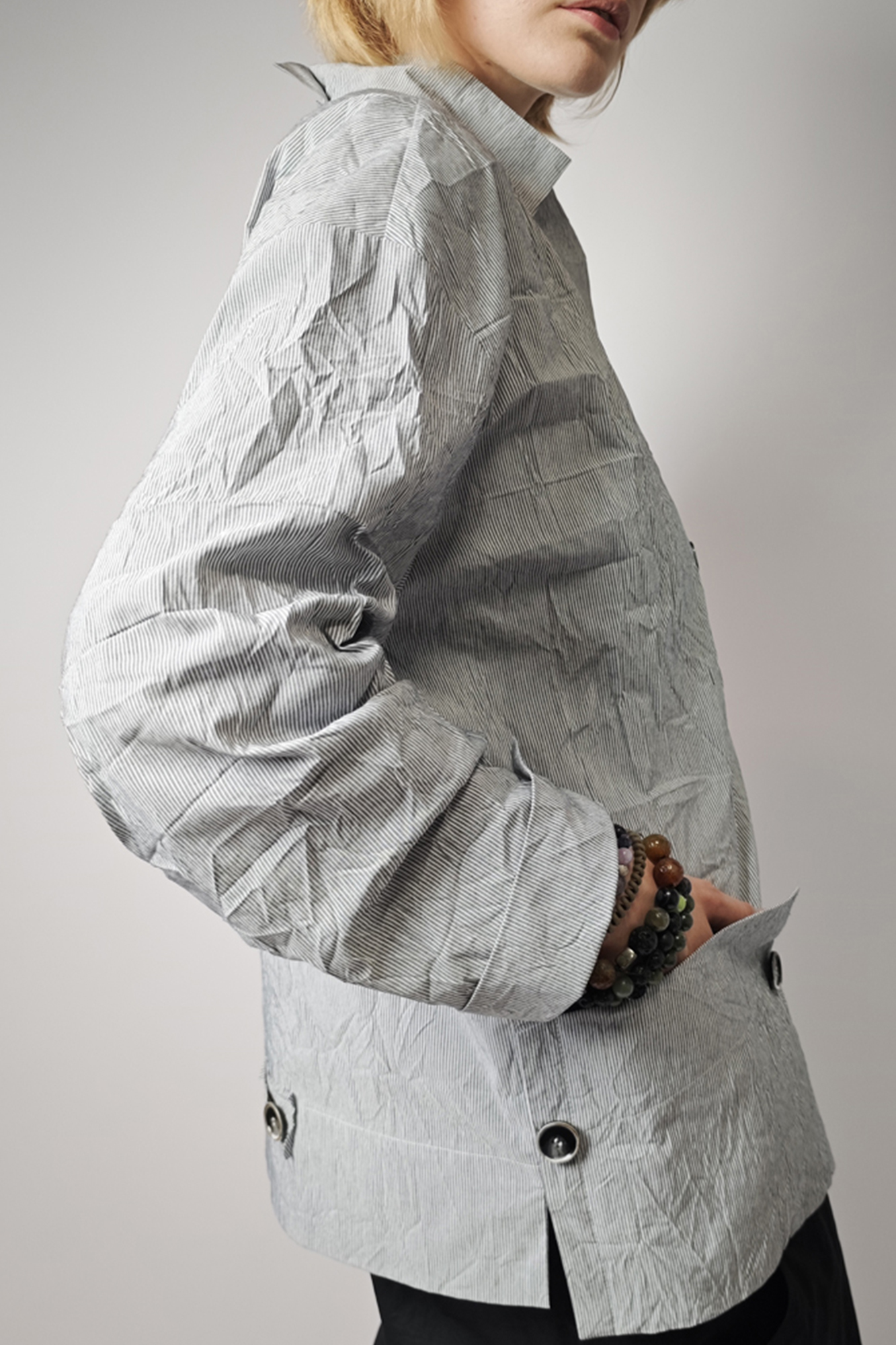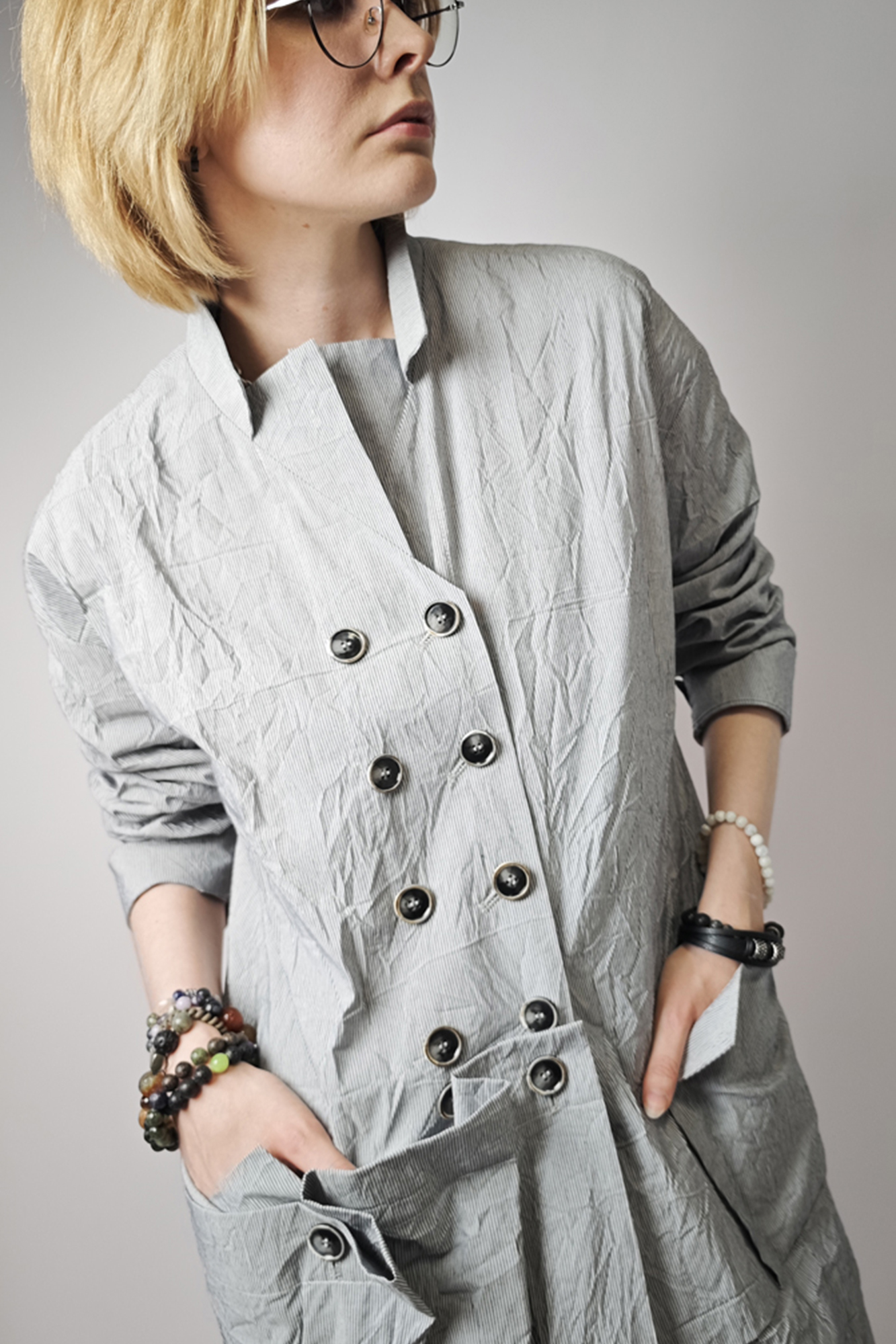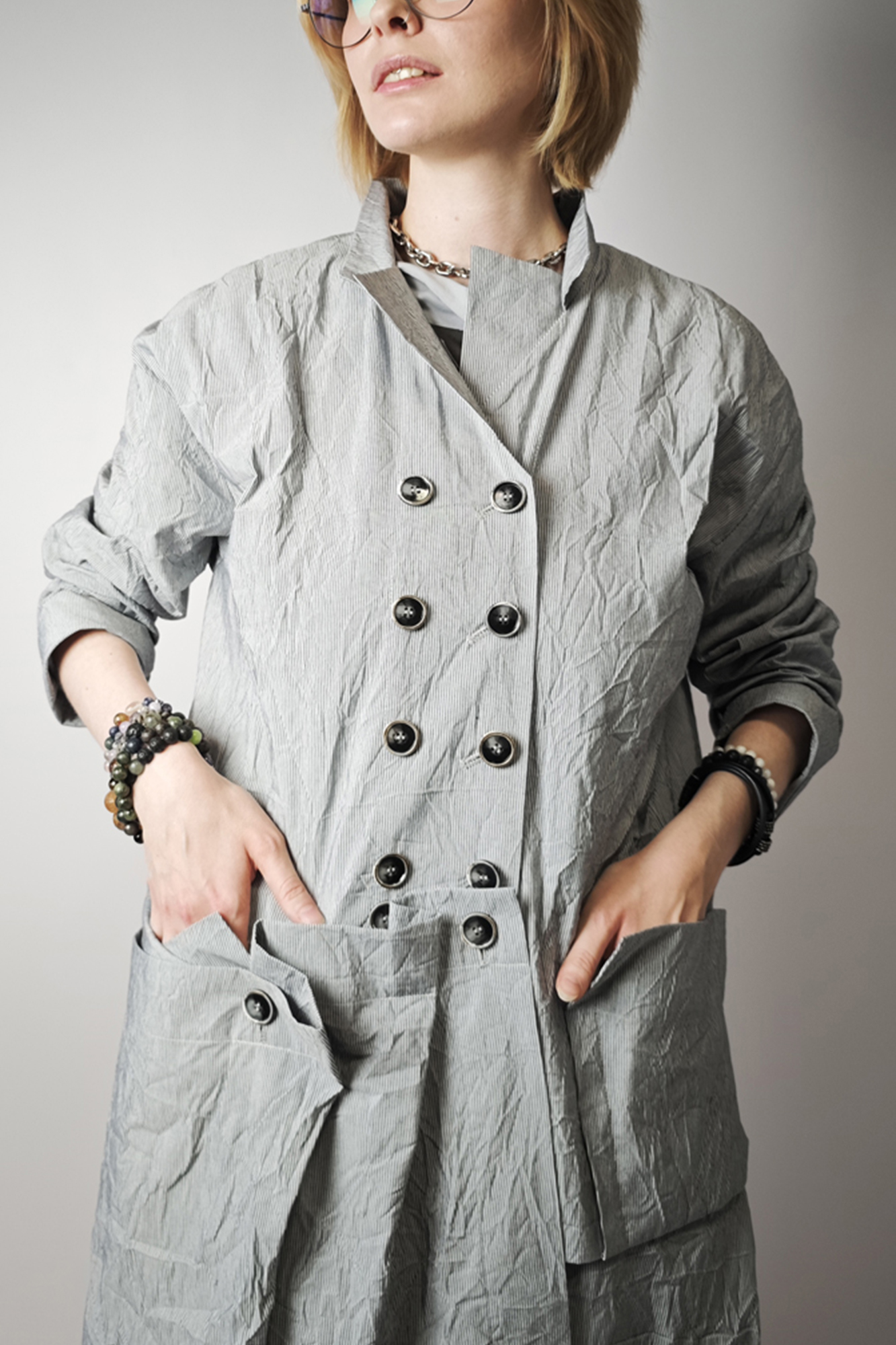 Платье-трансформер из ткани с крэш-эффектом(небольшая мятость). По линии бедра можно отстегнуть юбку и платье правратится в полноценный жакет с накладными карманами снизу на передней полочке. У жакета по боковым швам небольшие разрезы. Неглубокий V-образный вырез горловины с пристроченным воротничком, ровно ложащимся на линии груди. Юбка при присоединении к жакету спреди собрана в три мягких складкм.