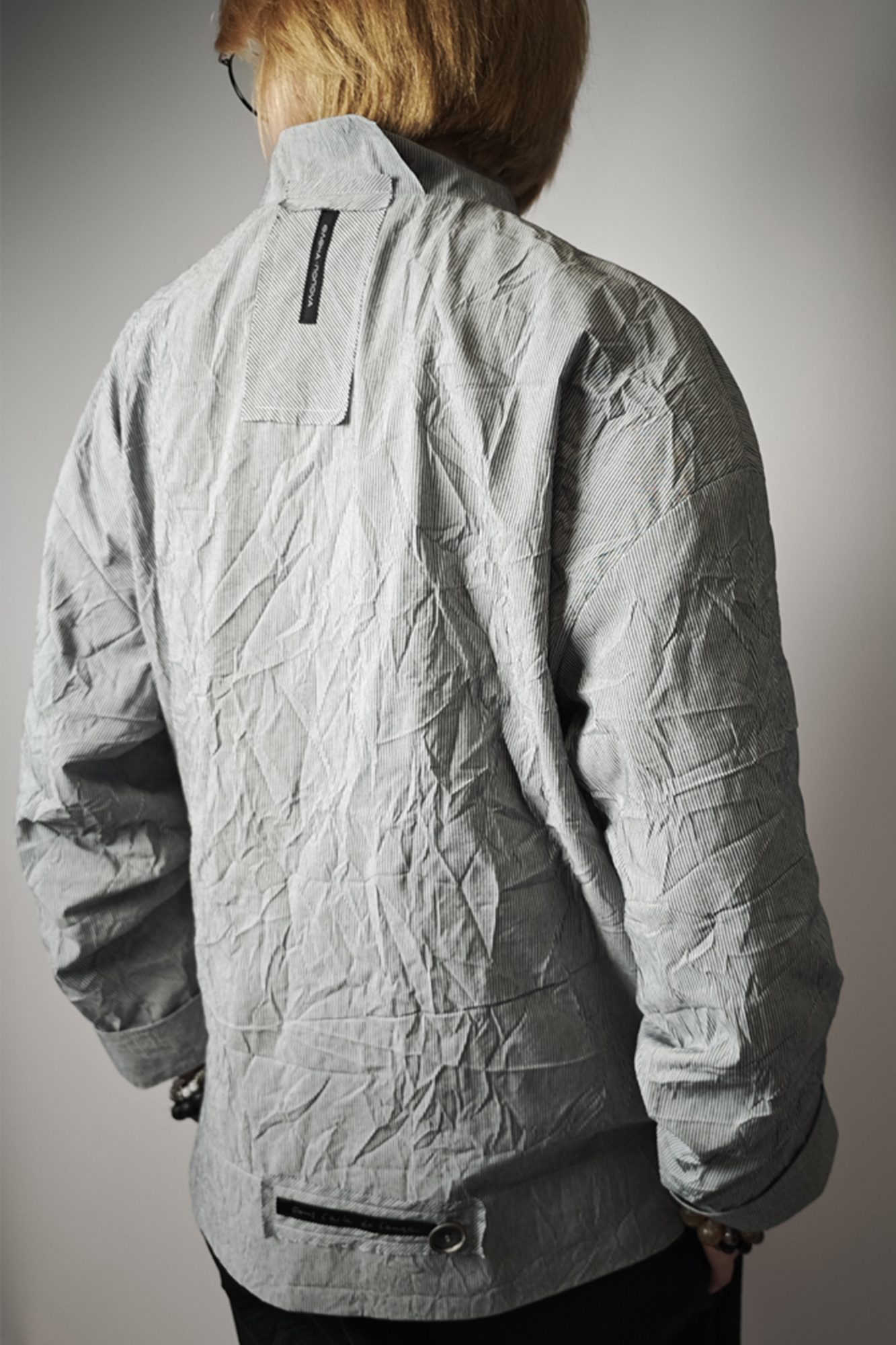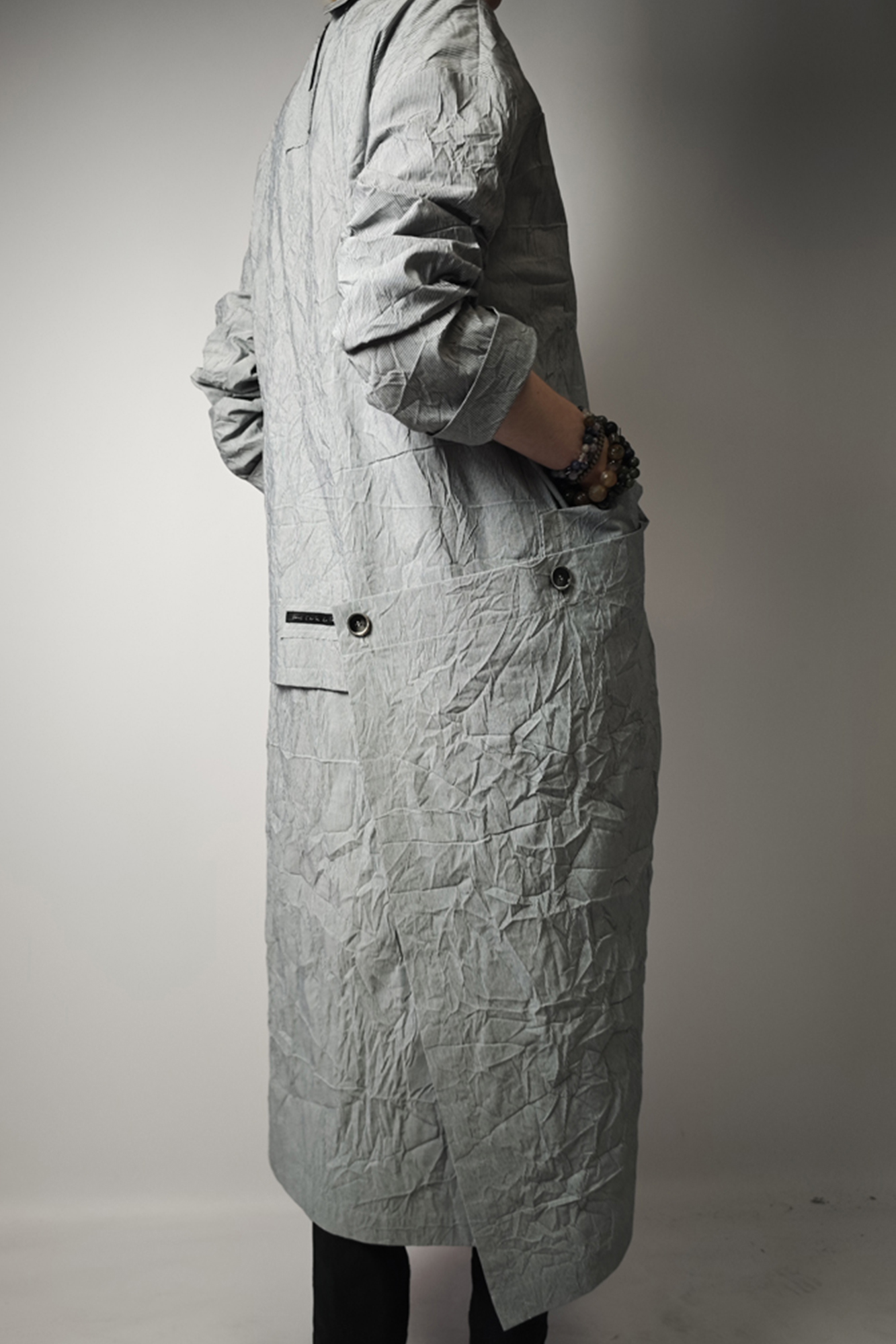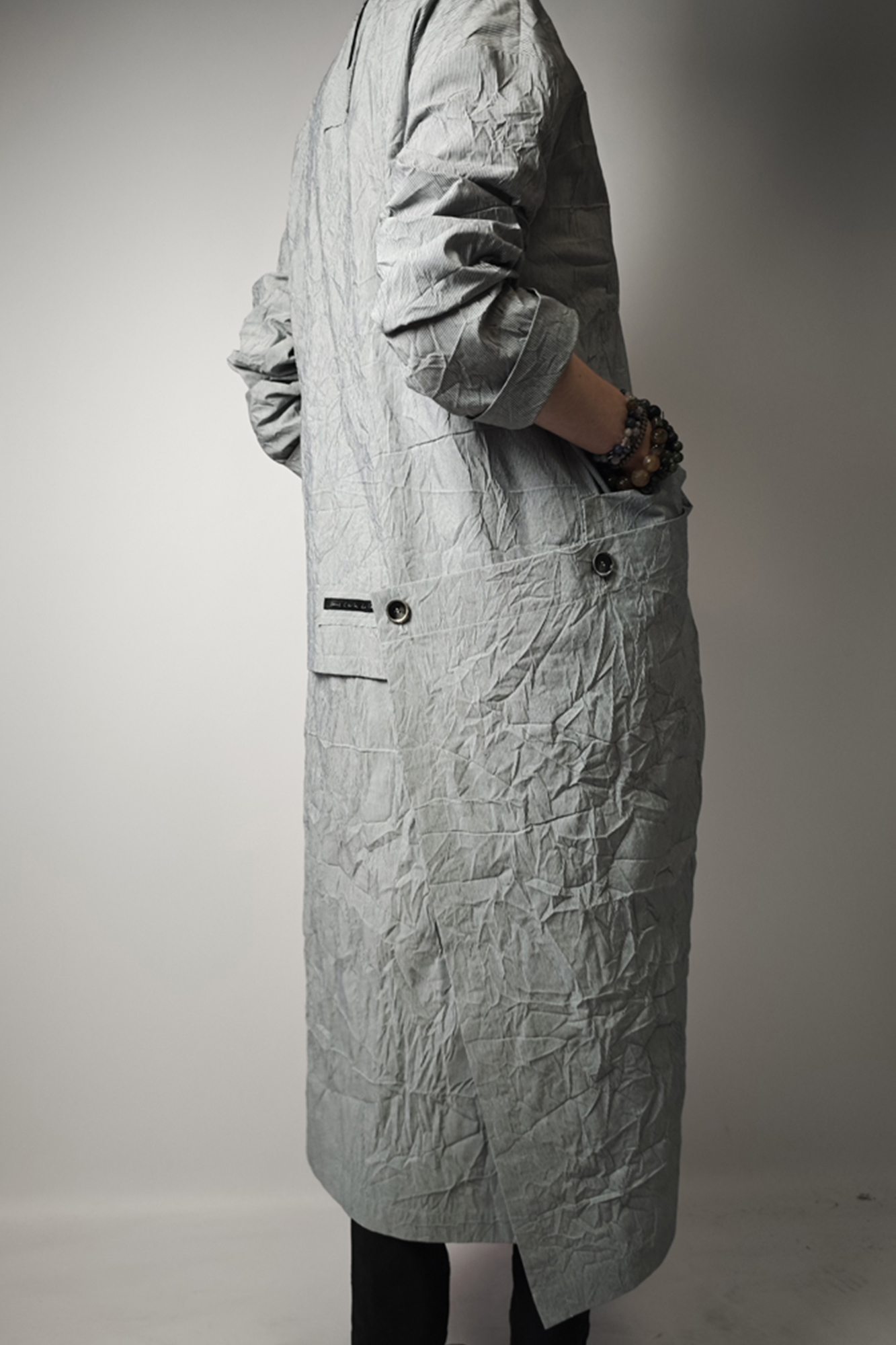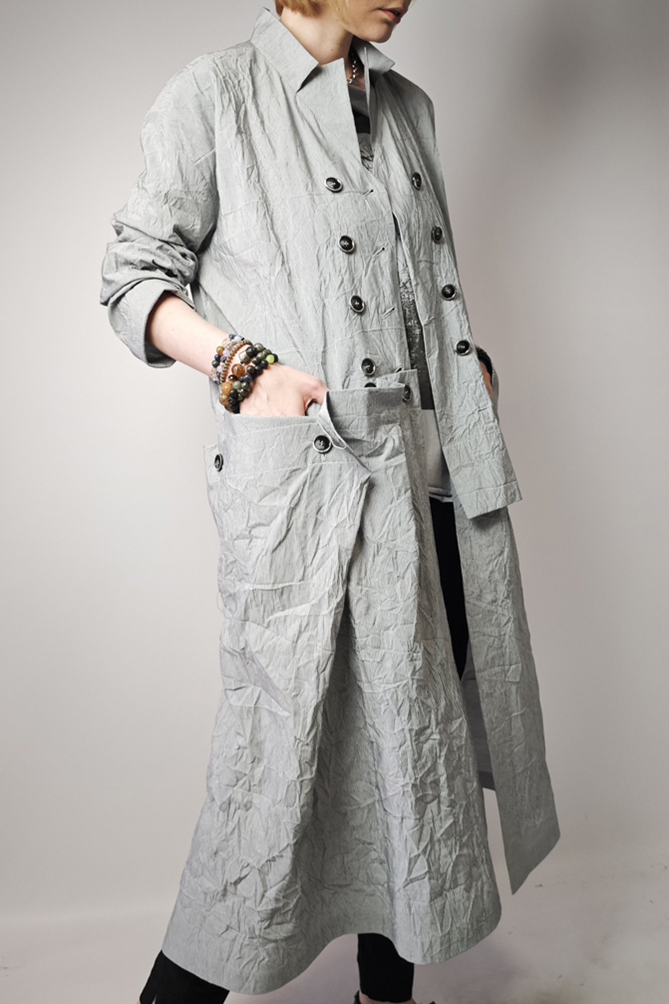 Платье-трансформер из ткани с крэш-эффектом(небольшая мятость). По линии бедра можно отстегнуть юбку и платье правратится в полноценный жакет с накладными карманами снизу на передней полочке. У жакета по боковым швам небольшие разрезы. Неглубокий V-образный вырез горловины с пристроченным воротничком, ровно ложащимся на линии груди. Юбка при присоединении к жакету спреди собрана в три мягких складкм.