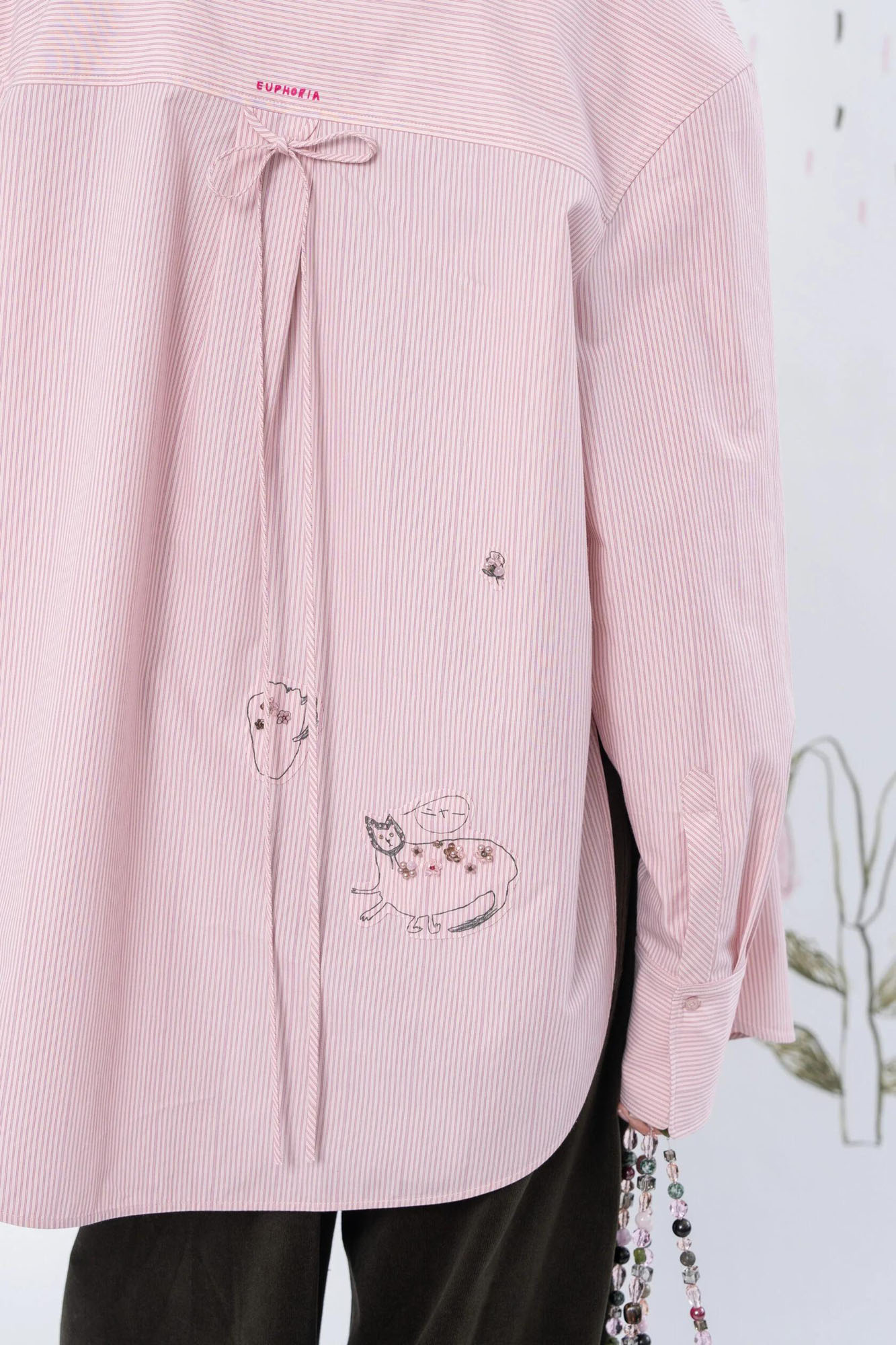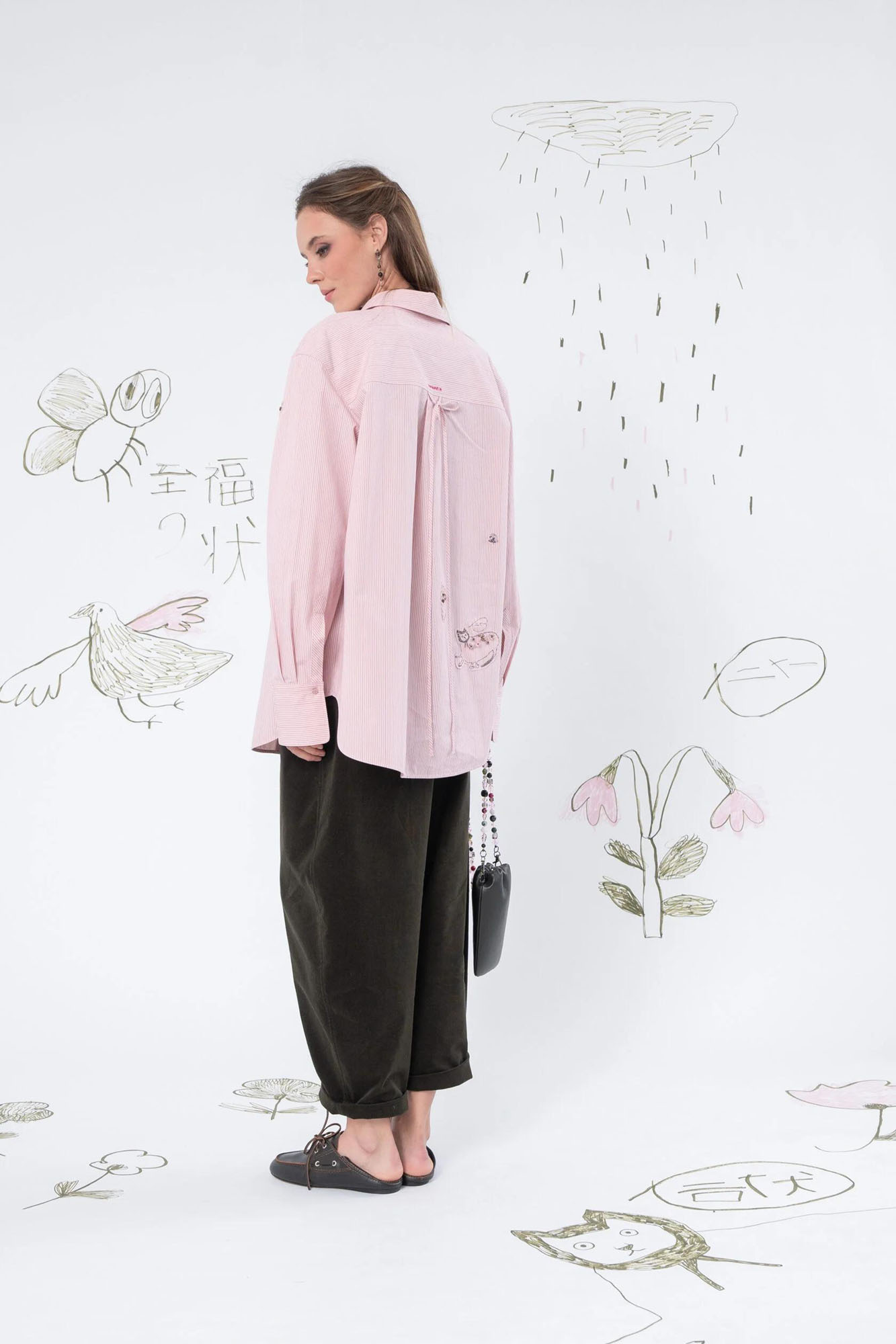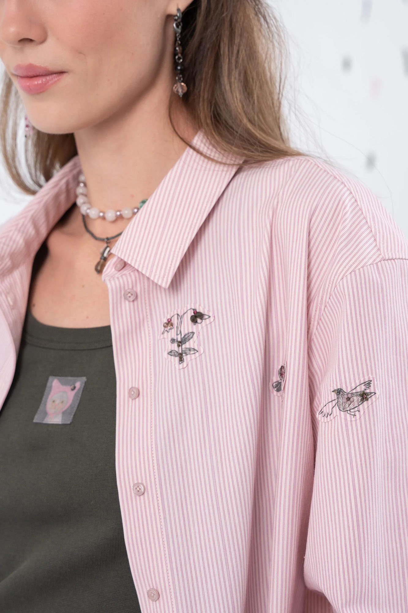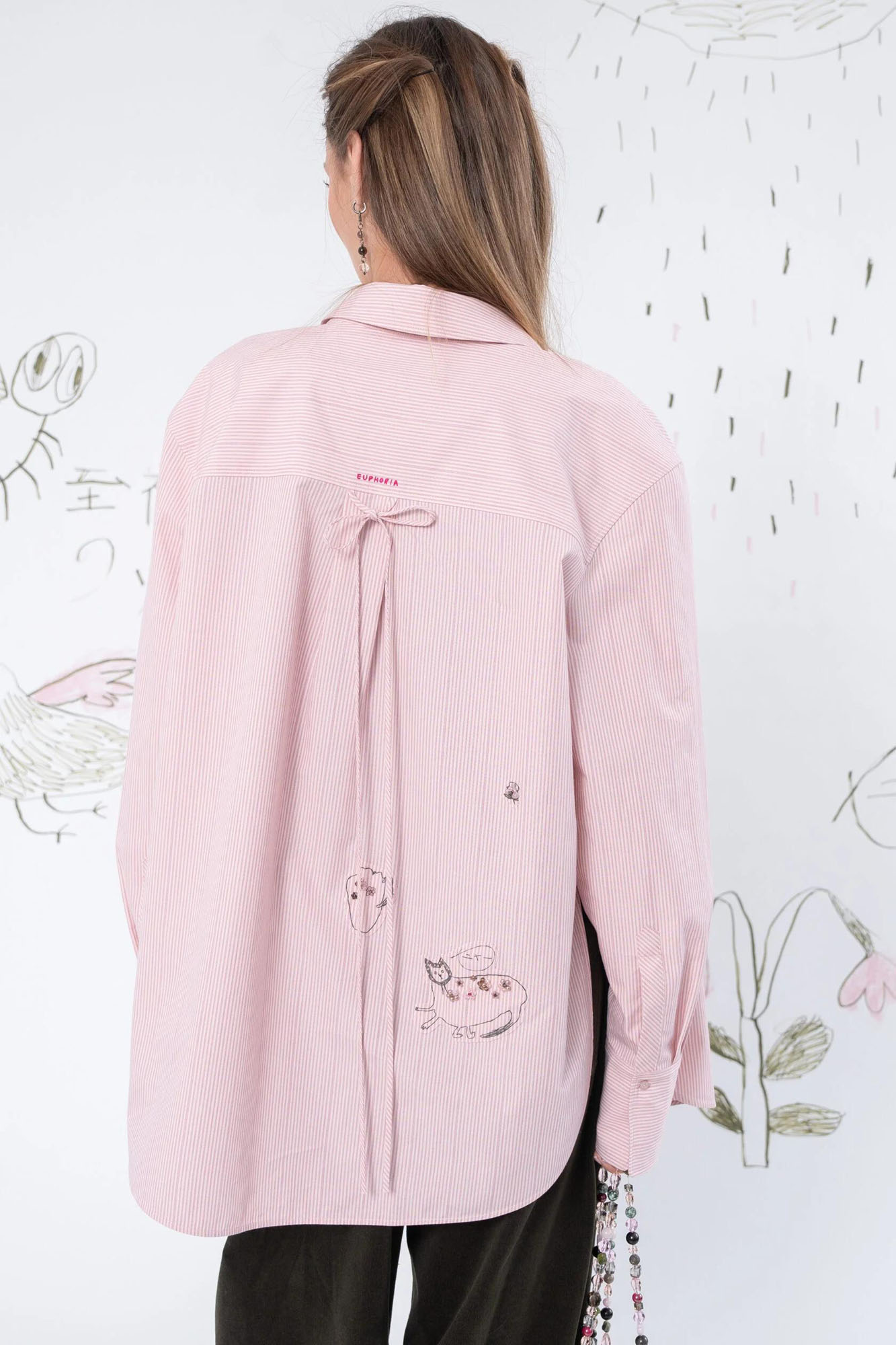 Хлопковая рубашка свободного силуэта из 100% хлопка. Может использоваться как самостоятельный элемент гардероба, так и вторым слоем на футболку или майку. Рубашка украшена авторским принтом, вышивкой, а также милыми декоративными элементами на спинке.