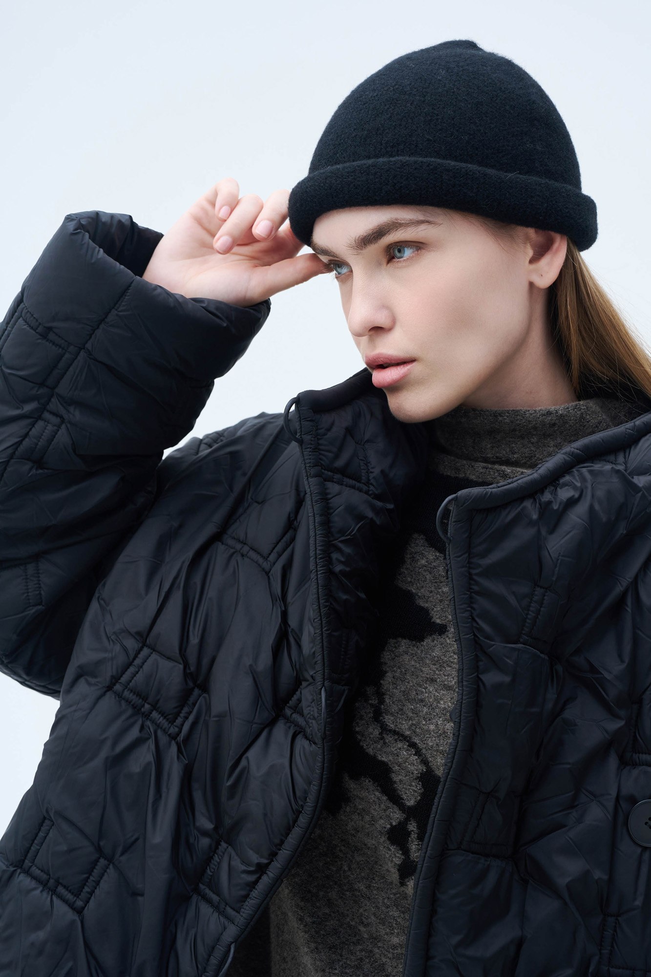 Цельновязаная шапка из буклированной пряжи в составе с ценной и мягкой шерстью Яка силуэта «овал». В этом аксессуаре мягкий и воздушный эффект пряжи раскрывается за счет переплетения.