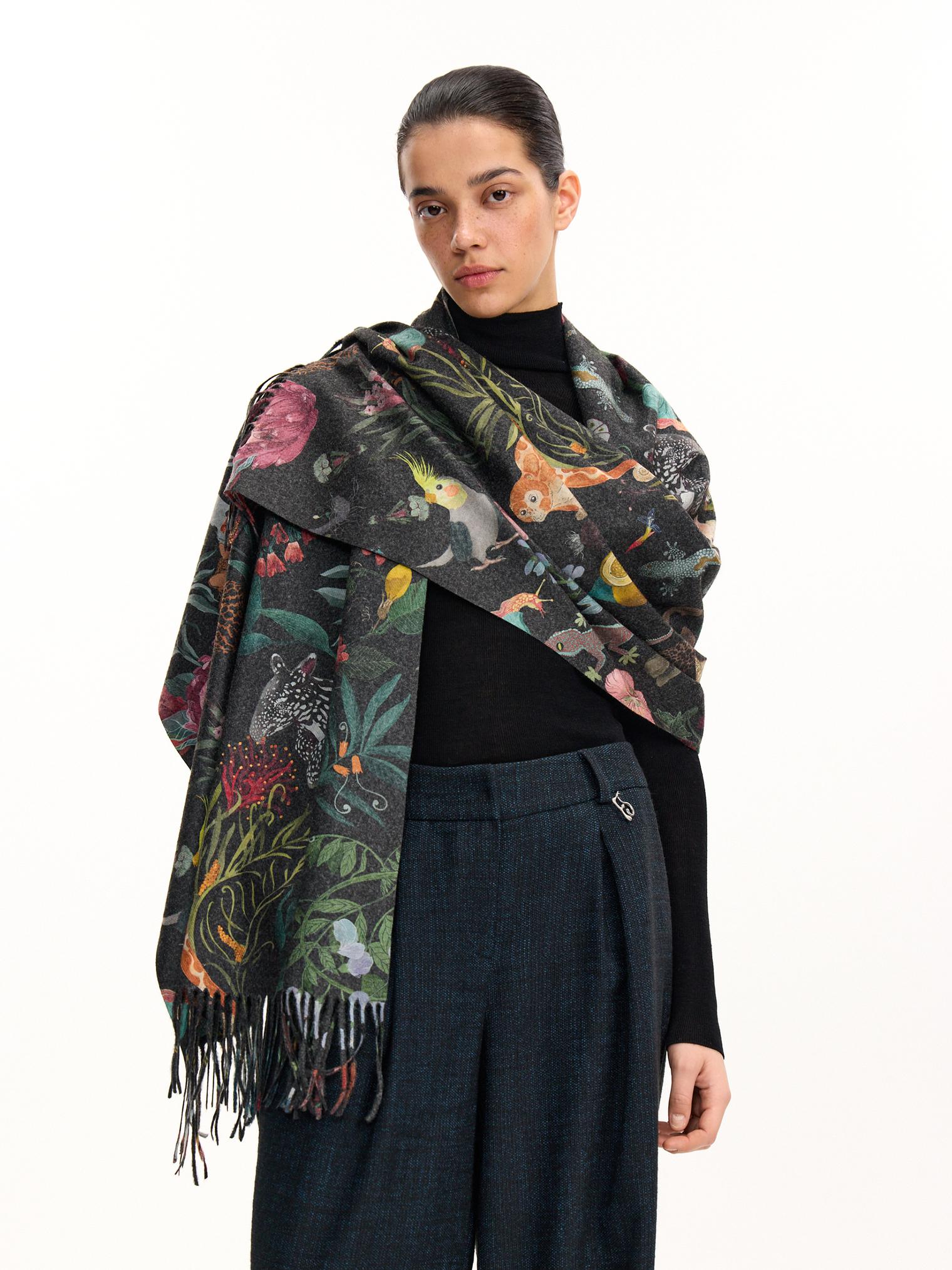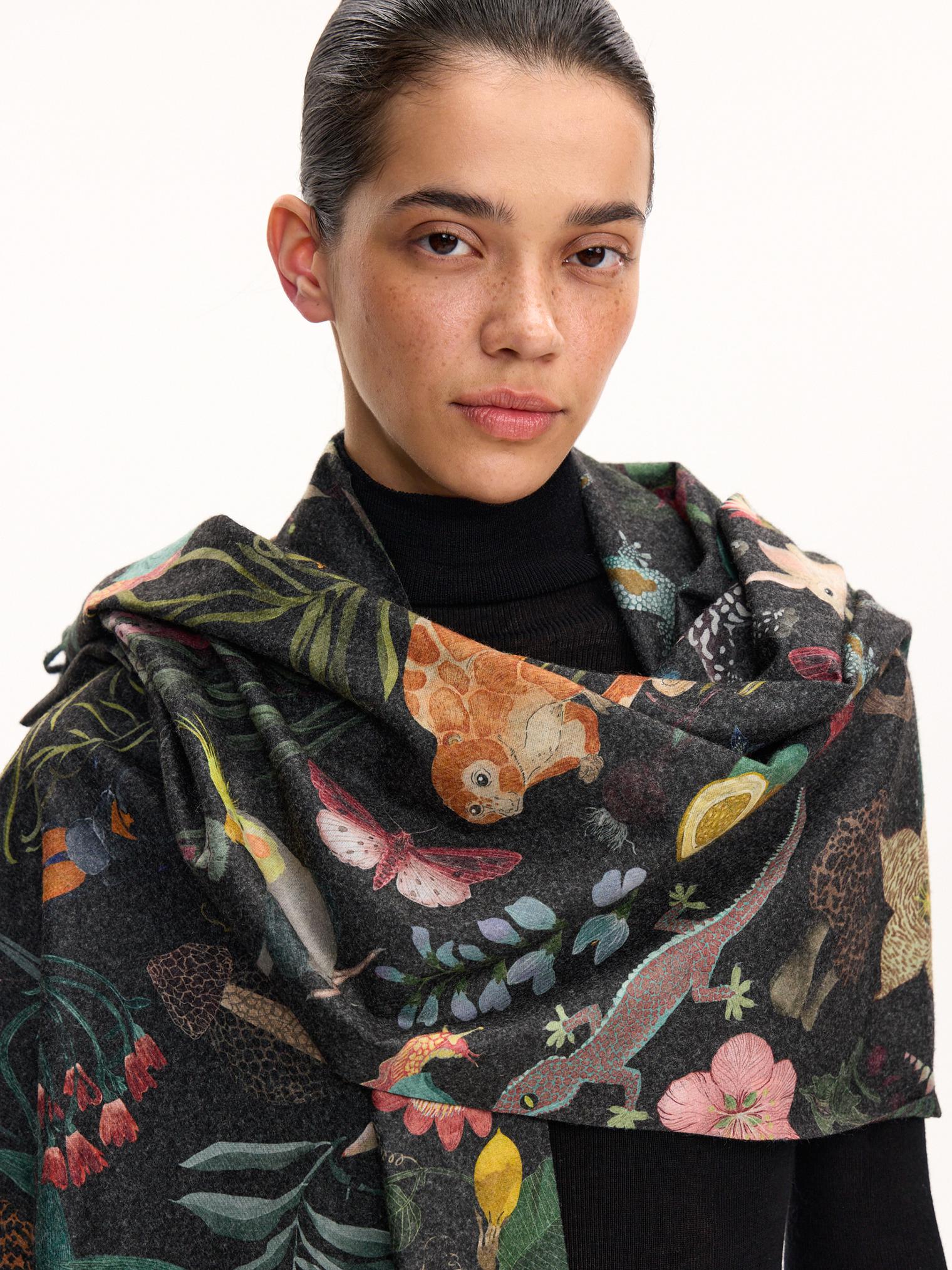 Шалевый шарф из нежной на ощупь, тёплой ткани. Аксессуар с ярким графичным принтом, вдохновленным зарисовками из блокнотов Брема. Нескучная альтернатива однотонному базовому шарфу.