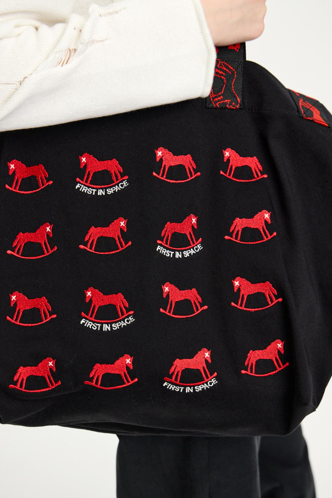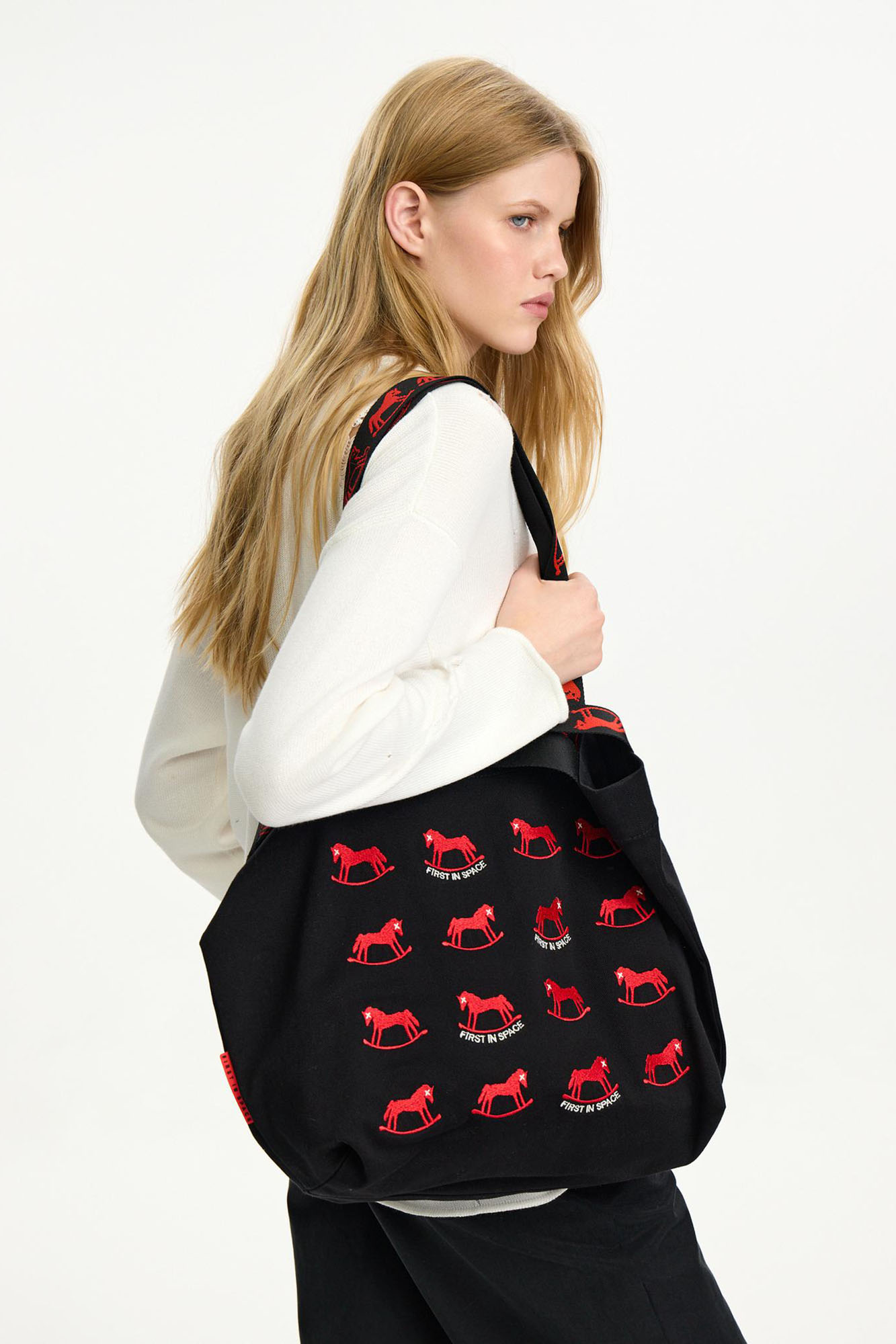 Шоппер среднего объёма из прочного хлопка с двойными ручками. Модель с контрастной вышивкой в виде лошадок долго прослужит и уместит в себя все самое необходимое. Аксессуар станет финальным акцентом.