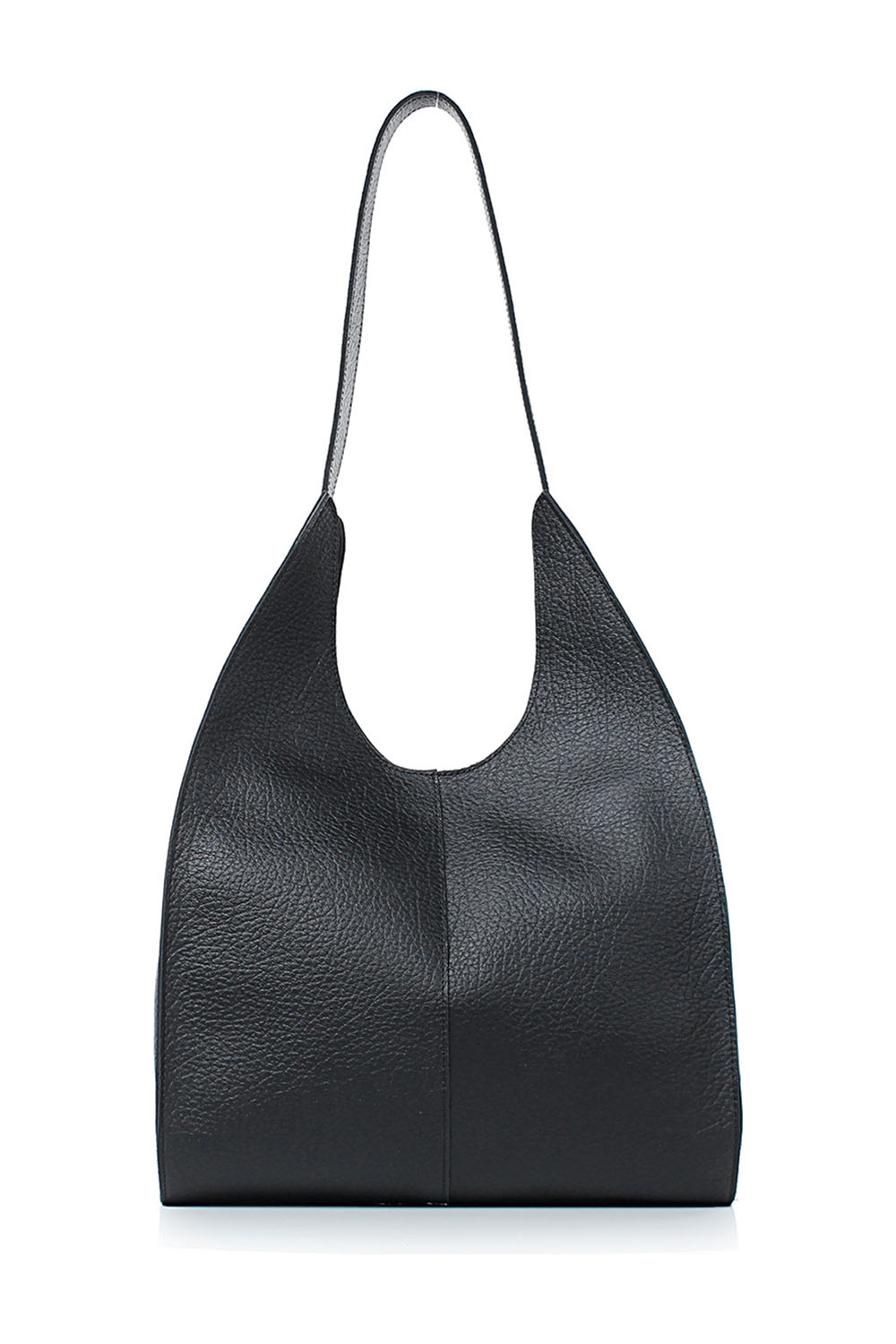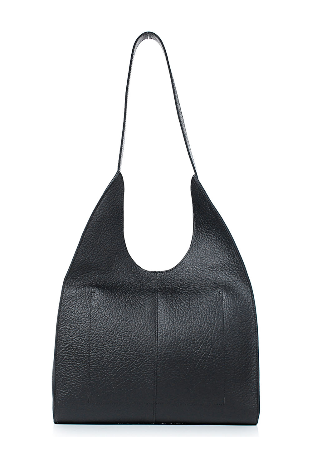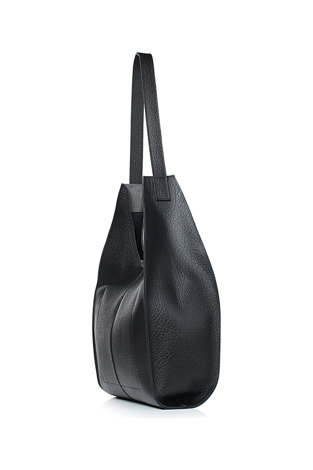 Удобная вместительная сумка-шопер из натуральной кожи в черном цвете. Внутри имеются два бльших кармана, один из них на молнии, сумка без подкладки.