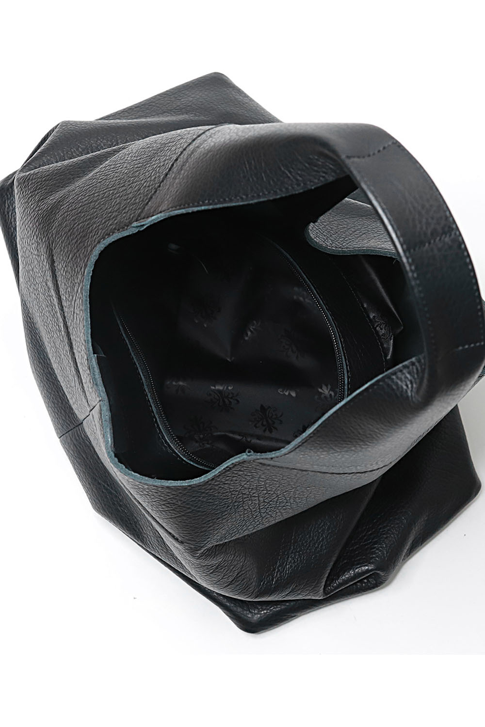 Удобная вместительная сумка-шопер из натуральной кожи в черном цвете. Внутри имеется съемное отделение, закрывающееся на молнию. С помощью этого отделения в сумке можно организовать три отделения. Внутри сумки большой карман, Сумка без подкладки.