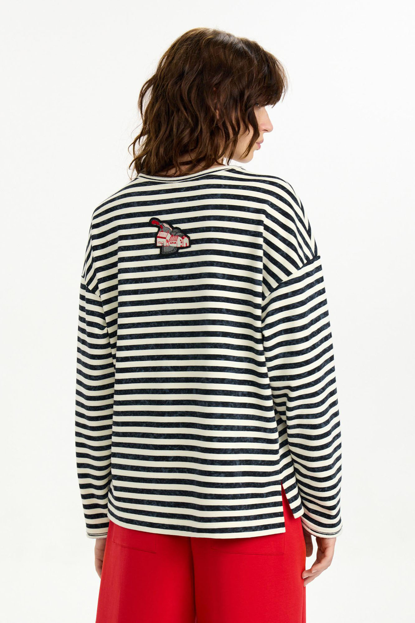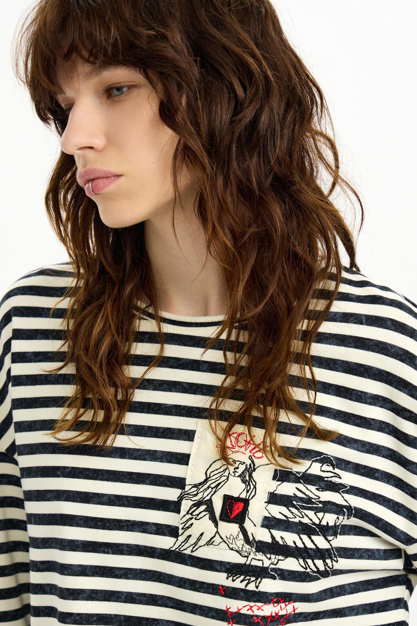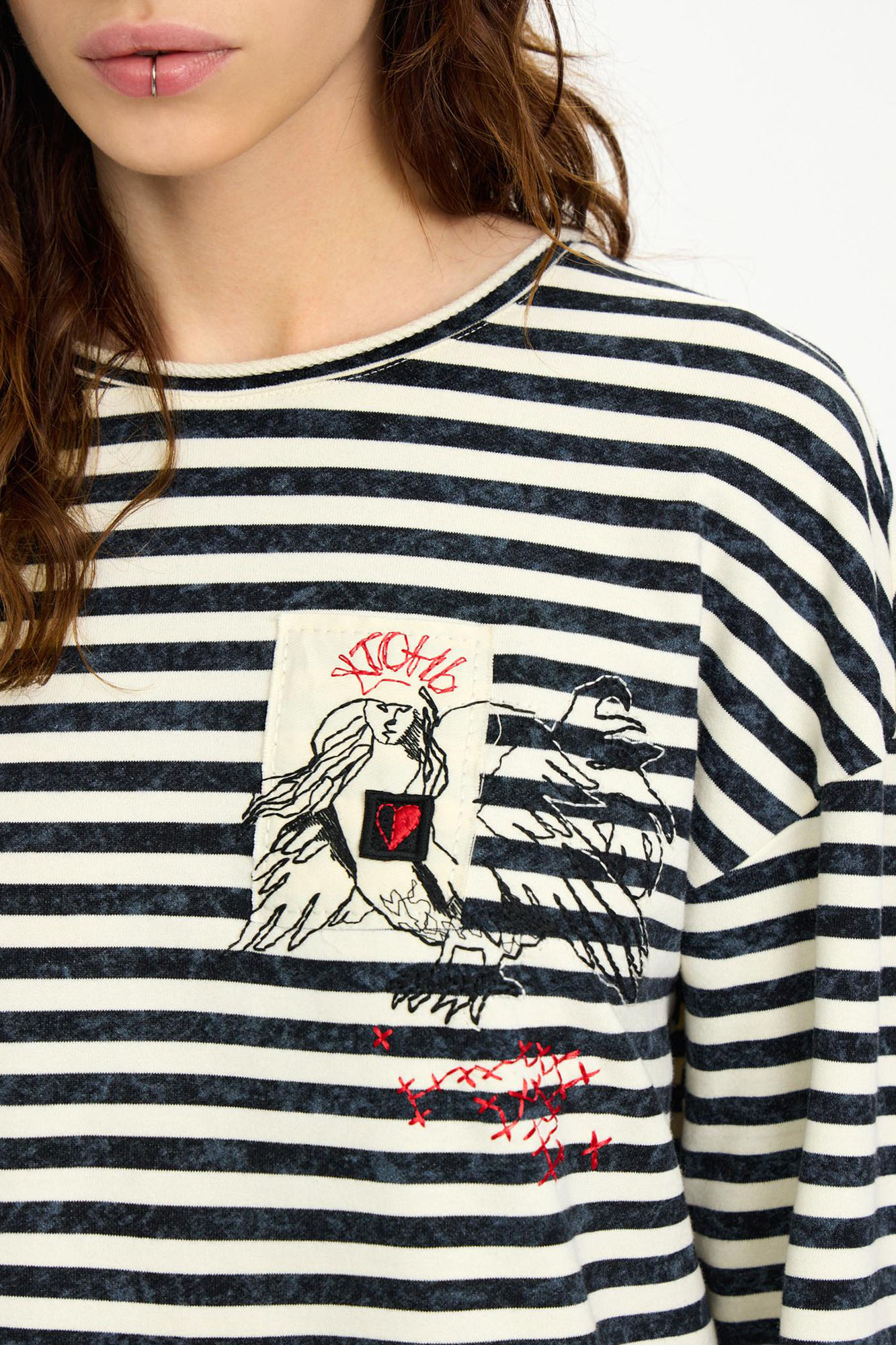 Свитшот из хлопкового футера в классическую бретонскую полоску украшен вышитой райской птицей Гамаюн. Черно-белая классика идеально подходит под любой аутфит и будет отлично смотреться с черным низом: брюками, джинсами или юбками.