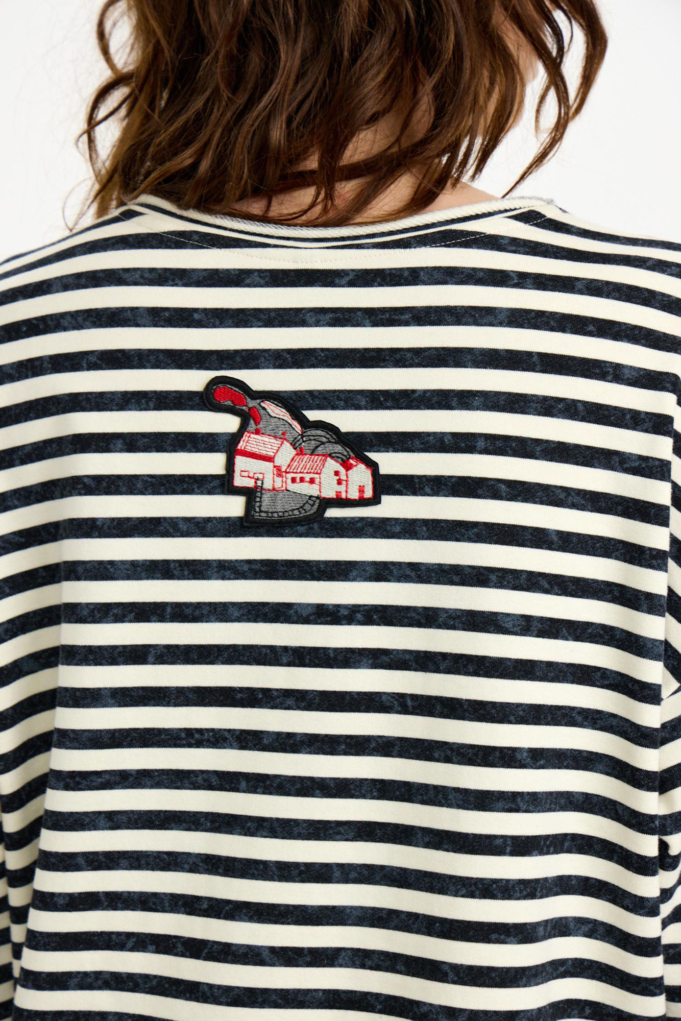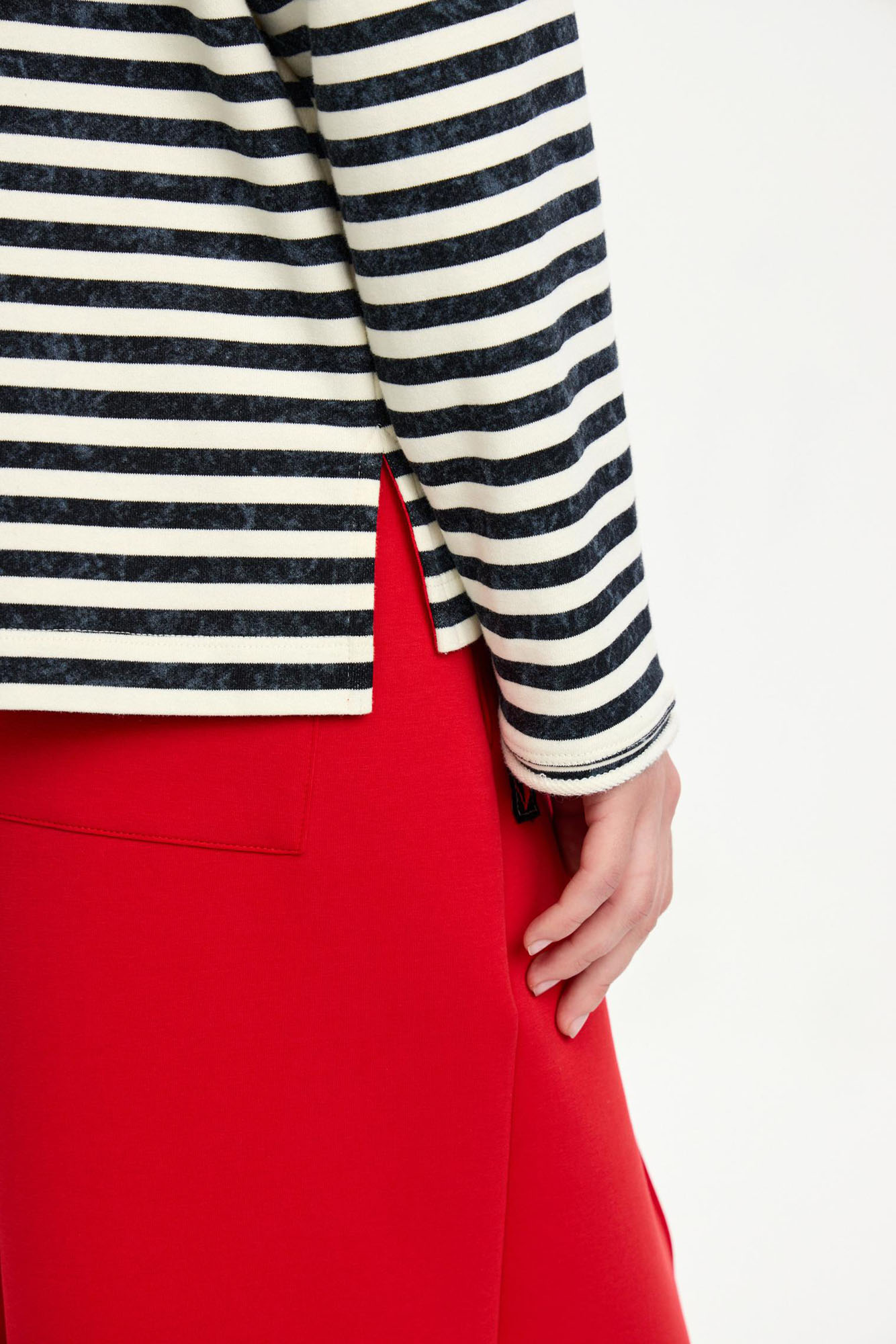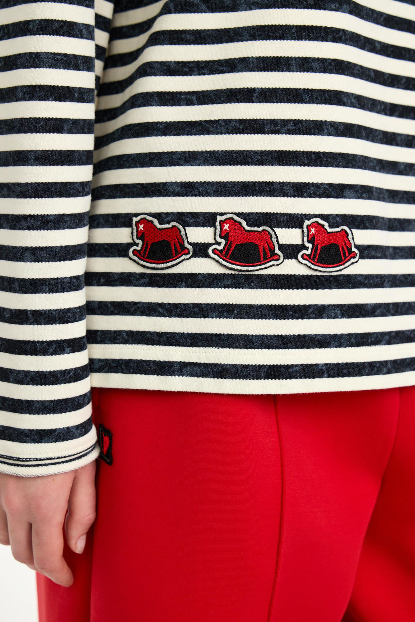Свитшот из хлопкового футера в классическую бретонскую полоску украшен вышитой райской птицей Гамаюн. Черно-белая классика идеально подходит под любой аутфит и будет отлично смотреться с черным низом: брюками, джинсами или юбками.