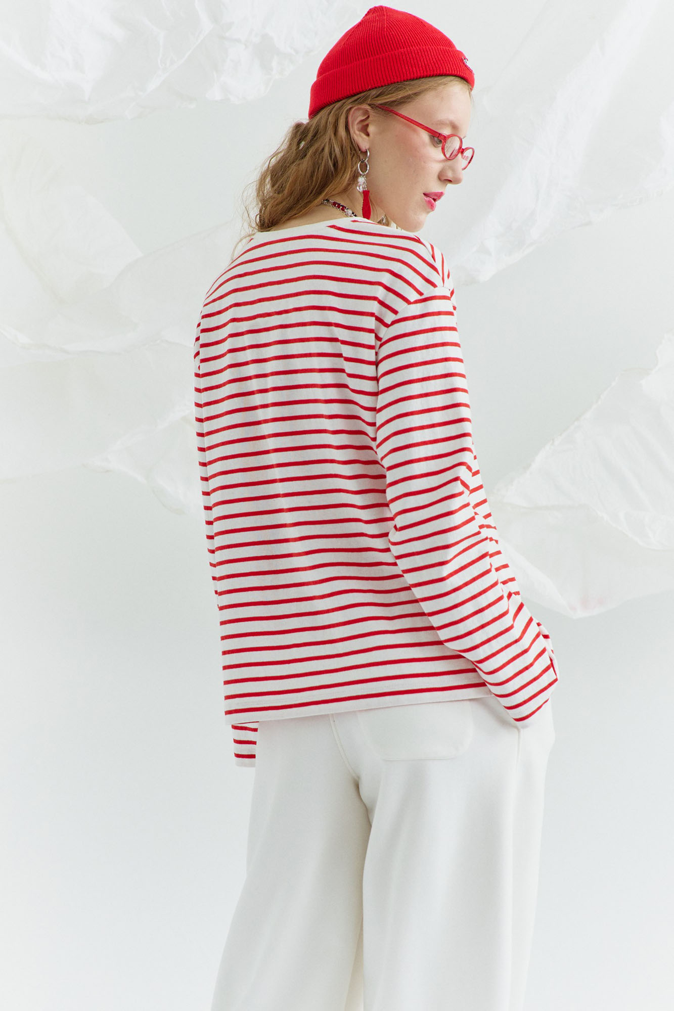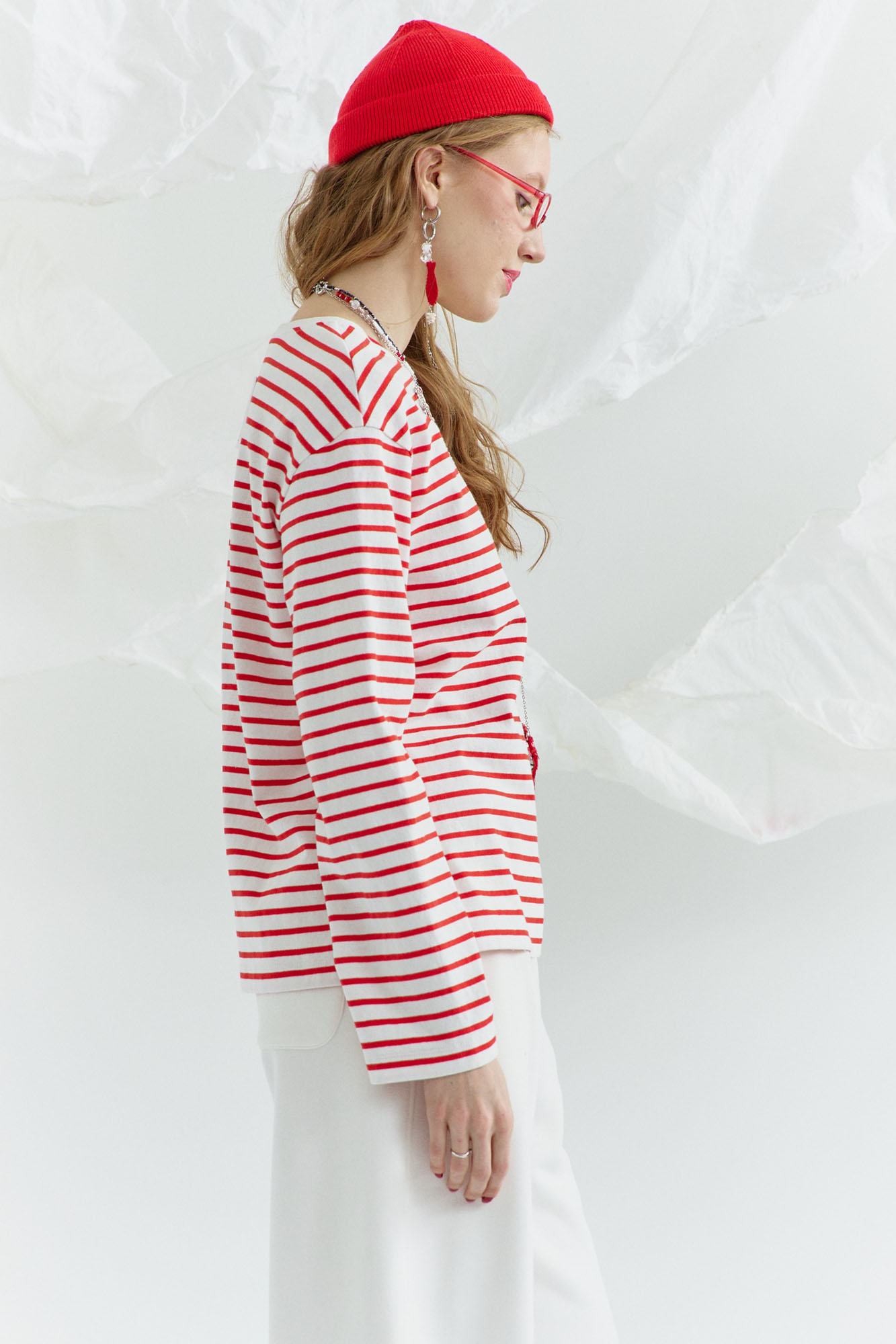 Базовый свитшот, стилизованный под тельняшку в красно-белую полоску, выполнен из "сухого" трикотажного полотна, на рукаве авторский шеврон